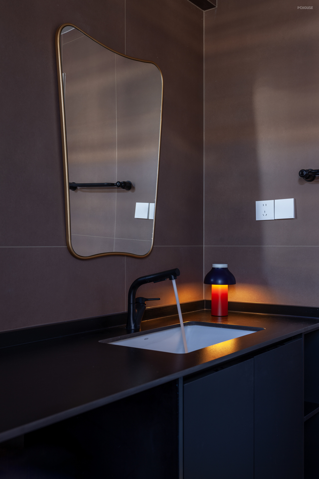 复古的赭石色墙砖搭配黑色地面,延续主要设计元素,搭配同类型灯饰与平直的线条,将复古与现代糅合融彻,氛围拉满且极具质感。再补充以金属的不规则镜框,使整洁的空间不失灵动,仿若暗夜星空,不繁而亮。