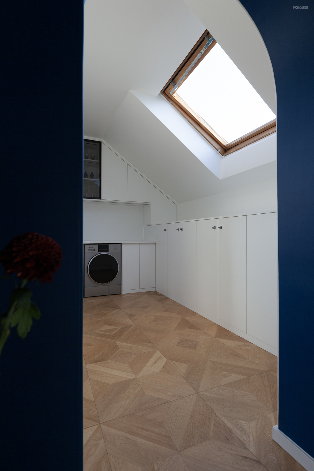 衣帽间与主卧相邻互通,二者之间延续了弧形设计元素,用以呼应圆顶,并契合折中主义的风格。纯白的木柜,既因势象形地平整了上窄下款地空间,也增强了收纳能力,美观与实用并存。