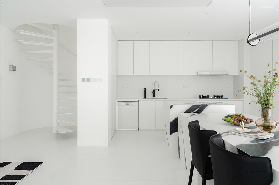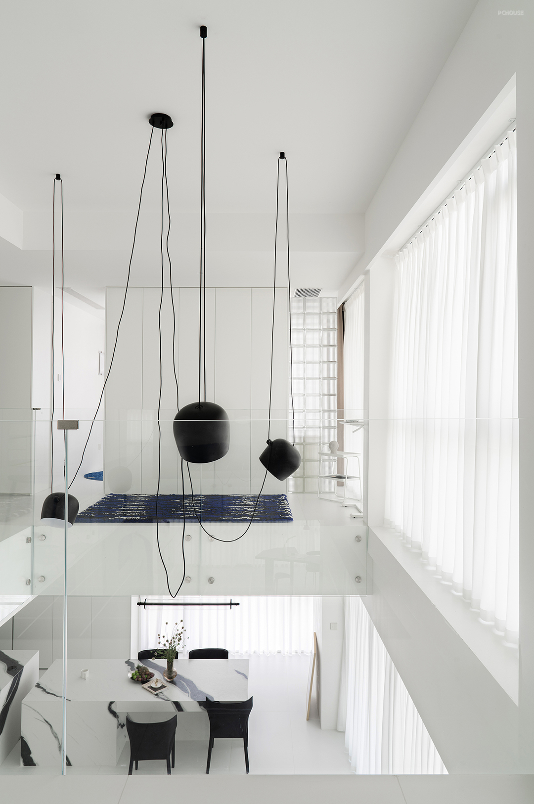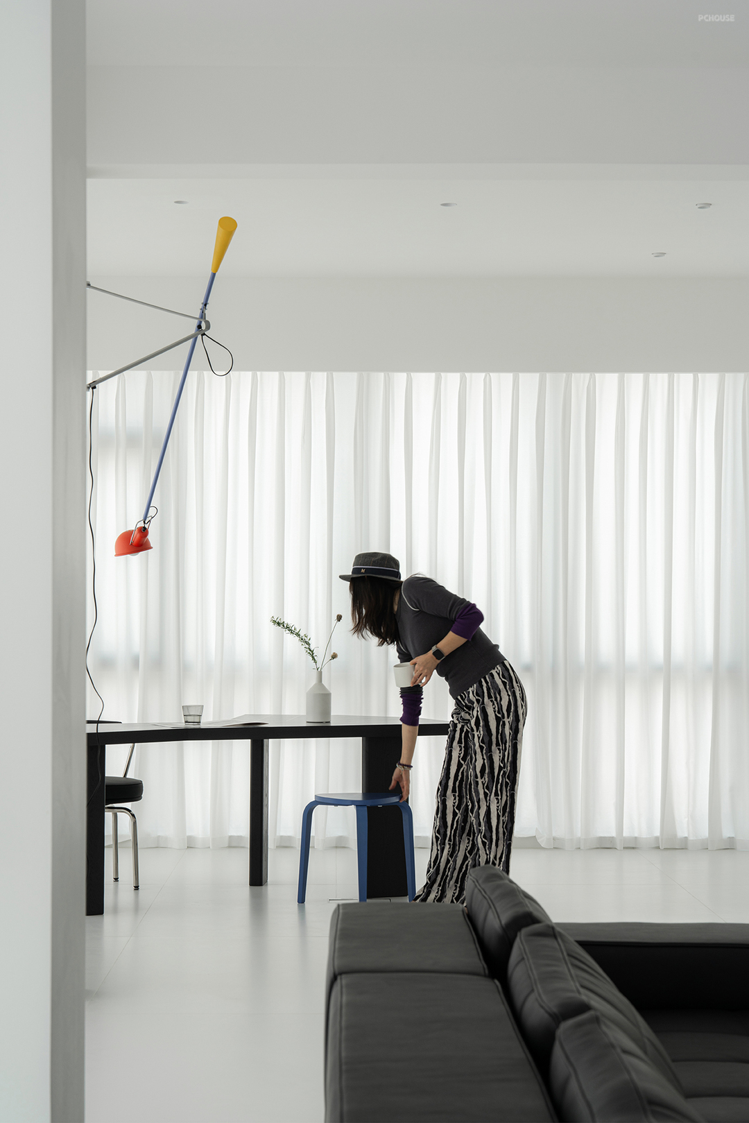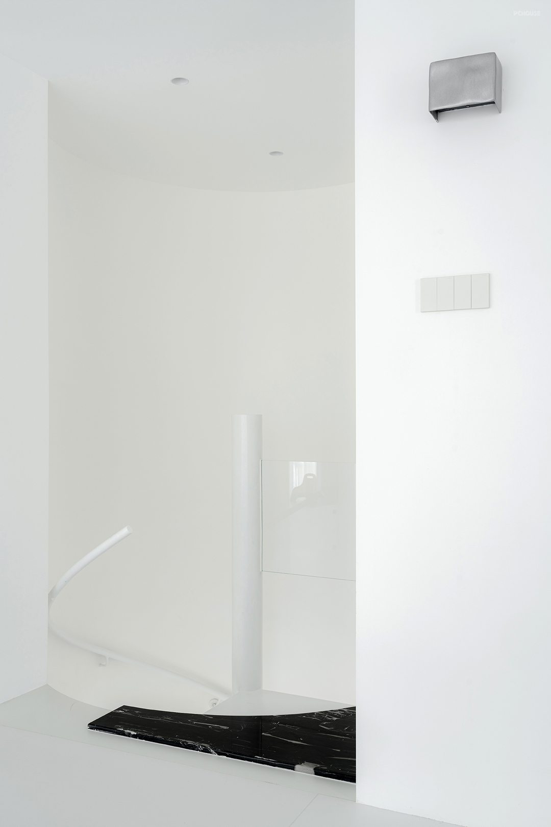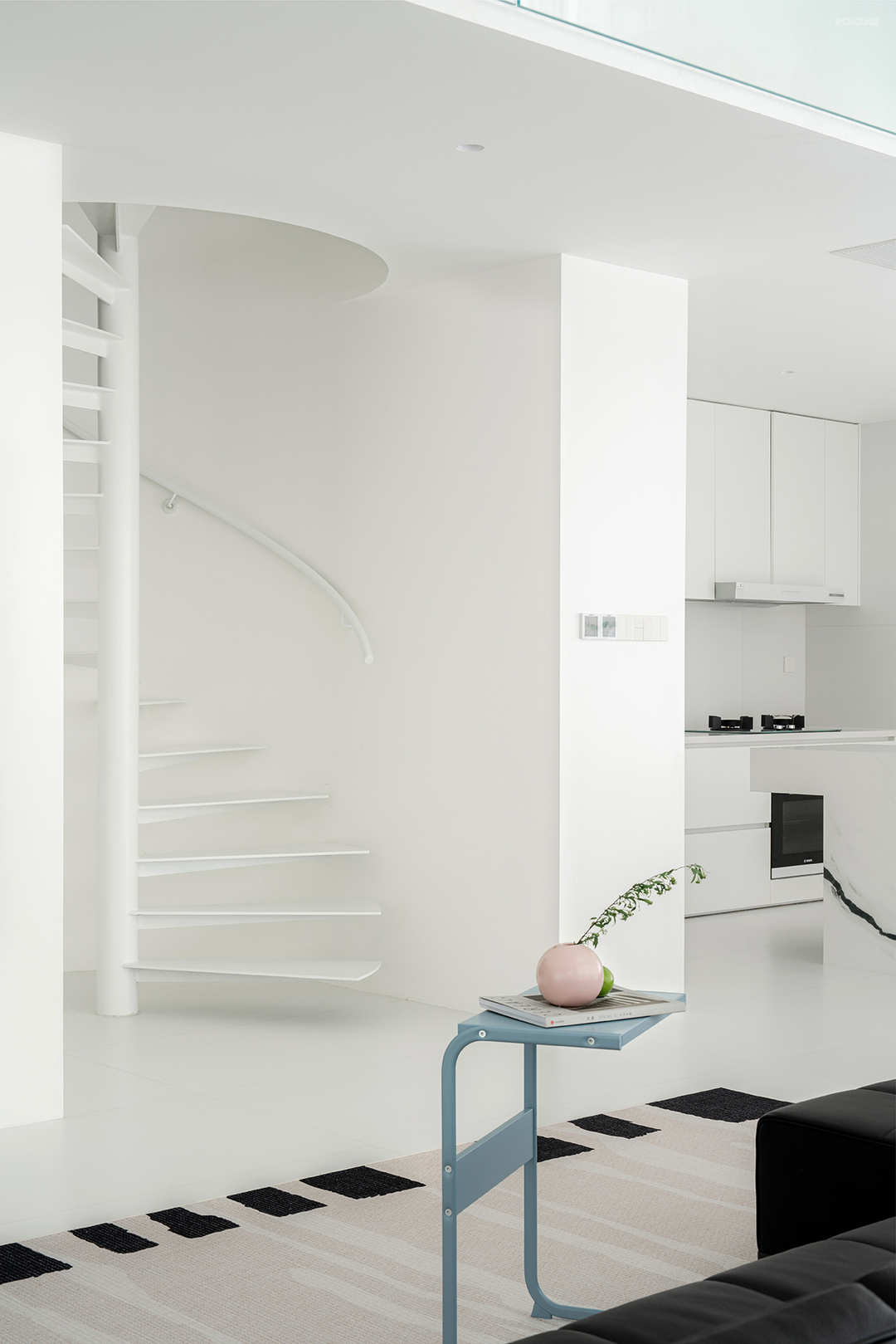 我当然喜欢这样特殊的设计,在通过详细沟通后看,我们把这种特殊化又推进了一步,在空间风格上,我们决定用极简极白的方式来处理空间,之后再软装中加入少量色彩。