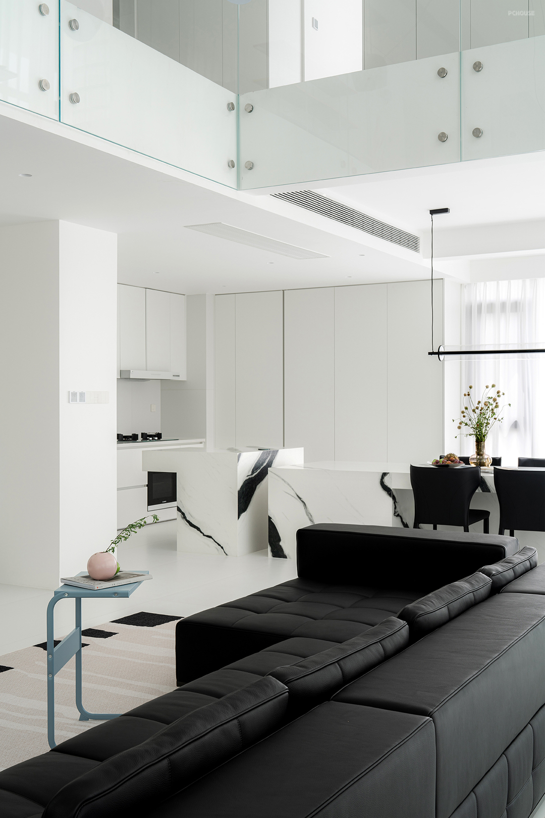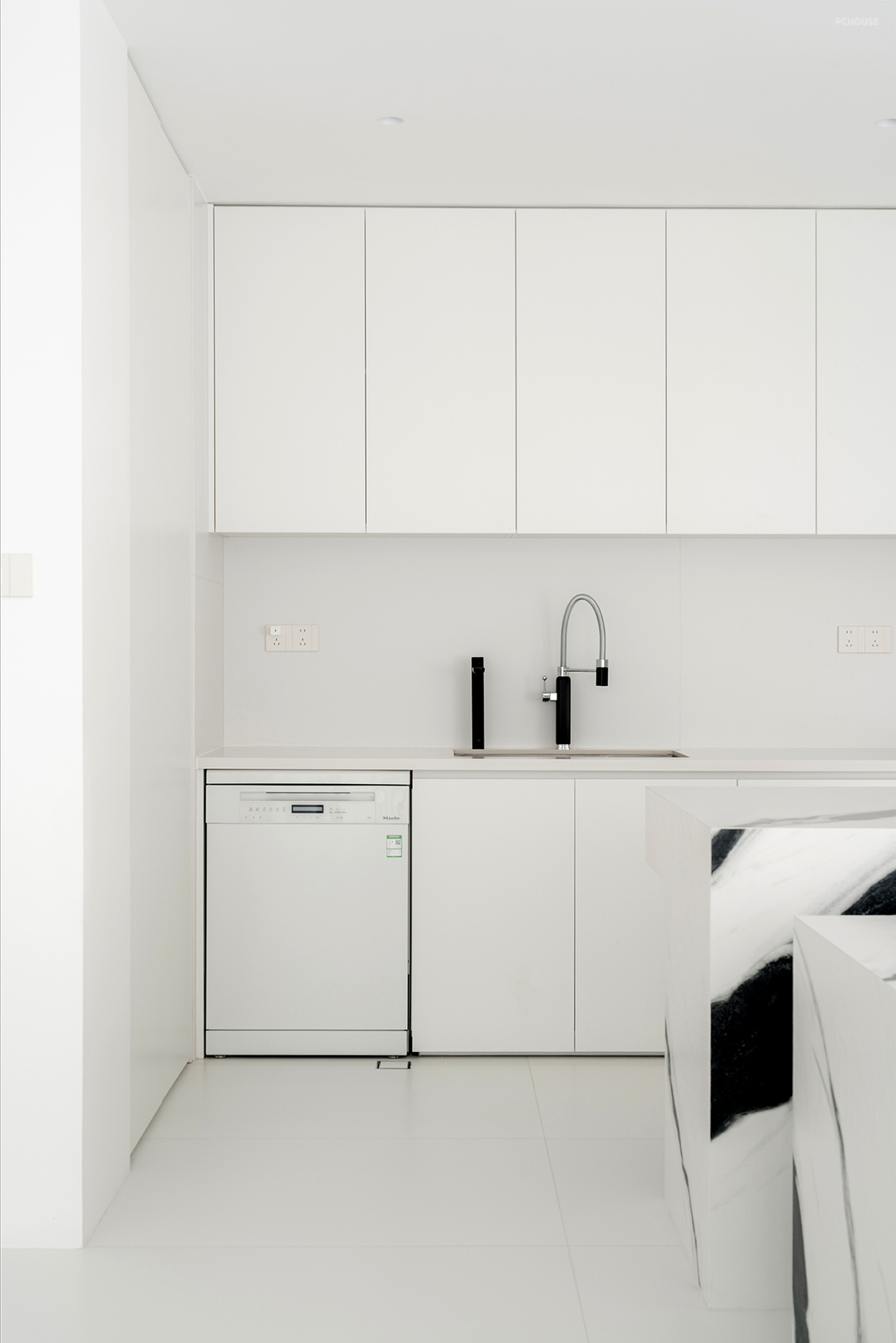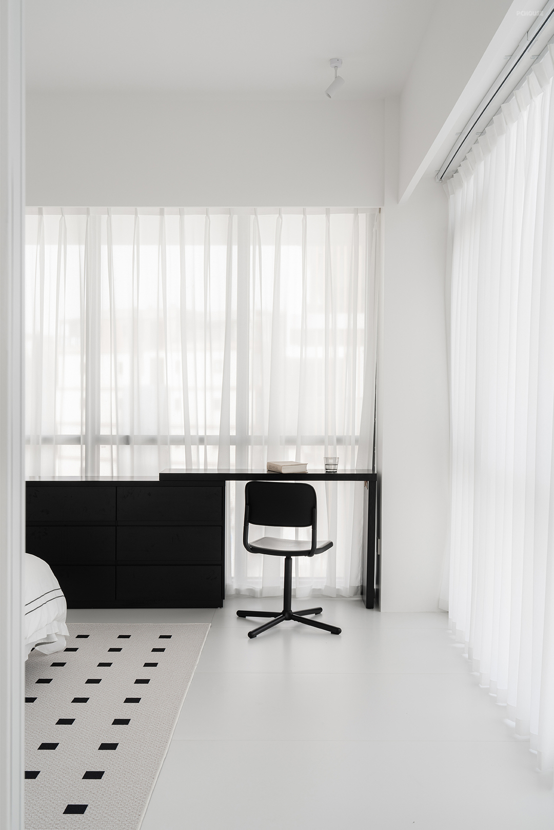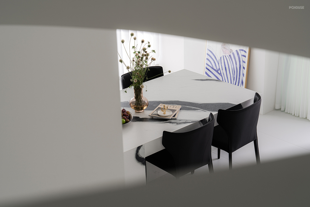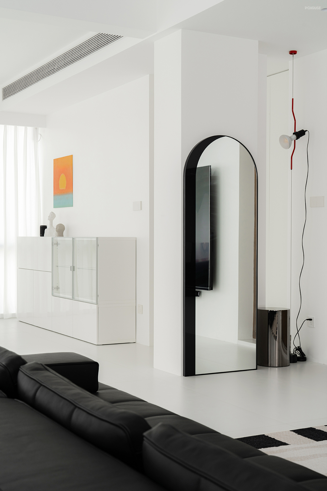 我当然喜欢这样特殊的设计,在通过详细沟通后看,我们把这种特殊化又推进了一步,在空间风格上,我们决定用极简极白的方式来处理空间,之后再软装中加入少量色彩。