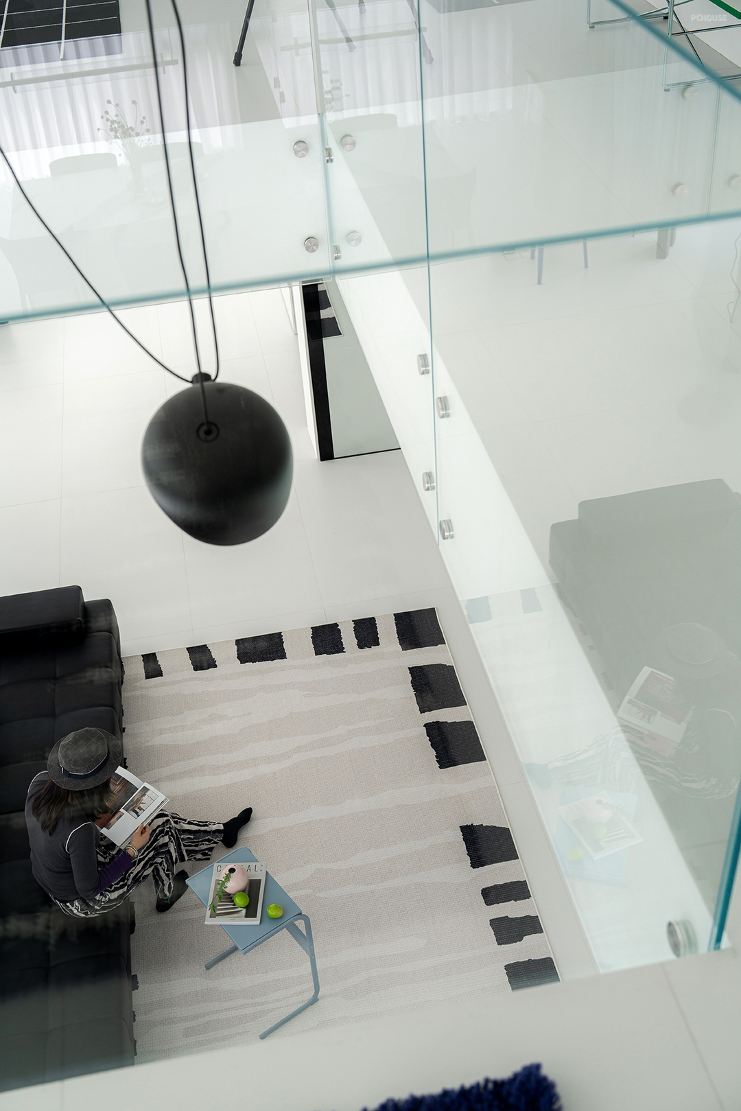 整个一楼拆除了几乎所有原有墙体,除了卫生间均为开放空间,而两层楼之间的沟通,也仅仅保留了中央区域9平米左右的方块挑高,3个flos的aim灯看似散乱地垂在一楼与二楼之间,光与线成了两层楼的沟通媒介。