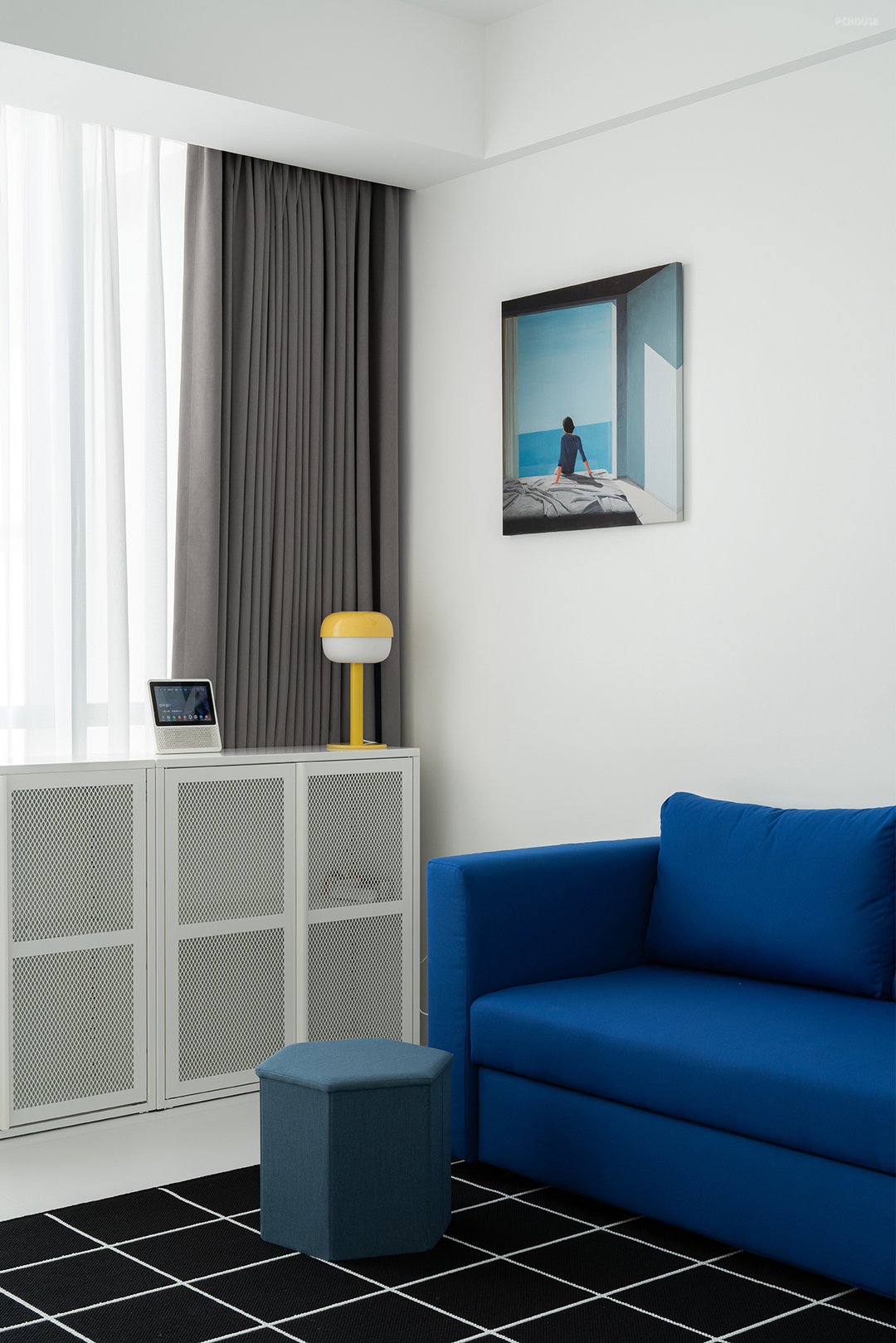 进门右手的空间很宽裕,我们仅在角落放入了一张异形的书桌和一个白色的柜子,红色的手臂灯固定在中央的柱子之上,让空间通过线条色彩产生了连接性。
