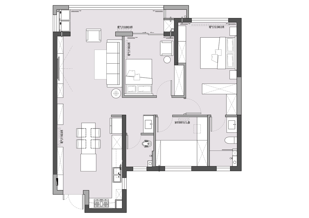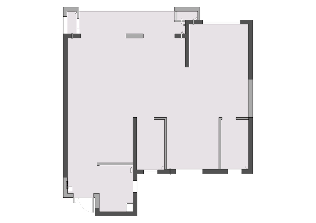 改造前的平面图:1、厨房面积偏小,冰箱纳入厨房后,操作台面不够。2、除了卫生间的隔墙,其余隔墙都未砌,这就意味着这个空间有很多种可能性。3、入户没有鞋柜位置,全屋需要考虑收纳系统。