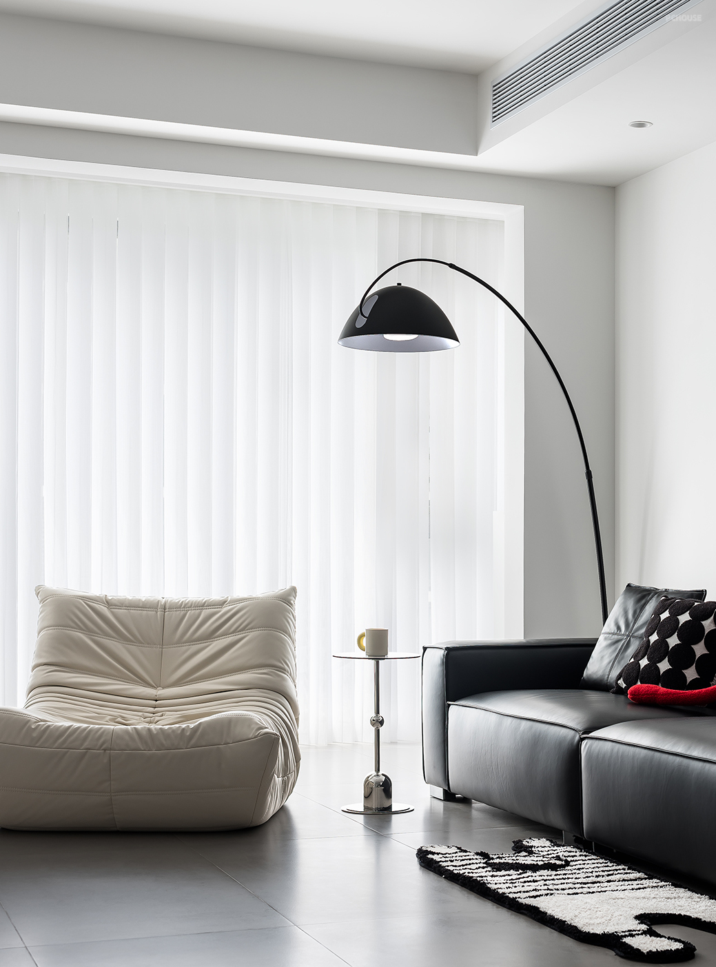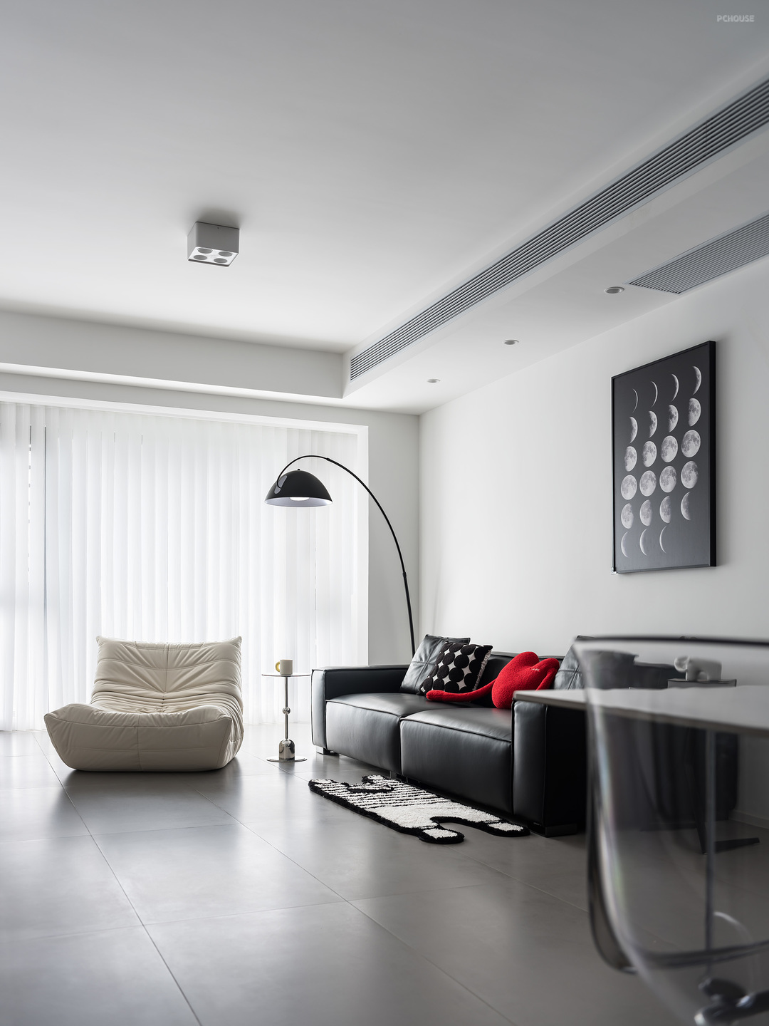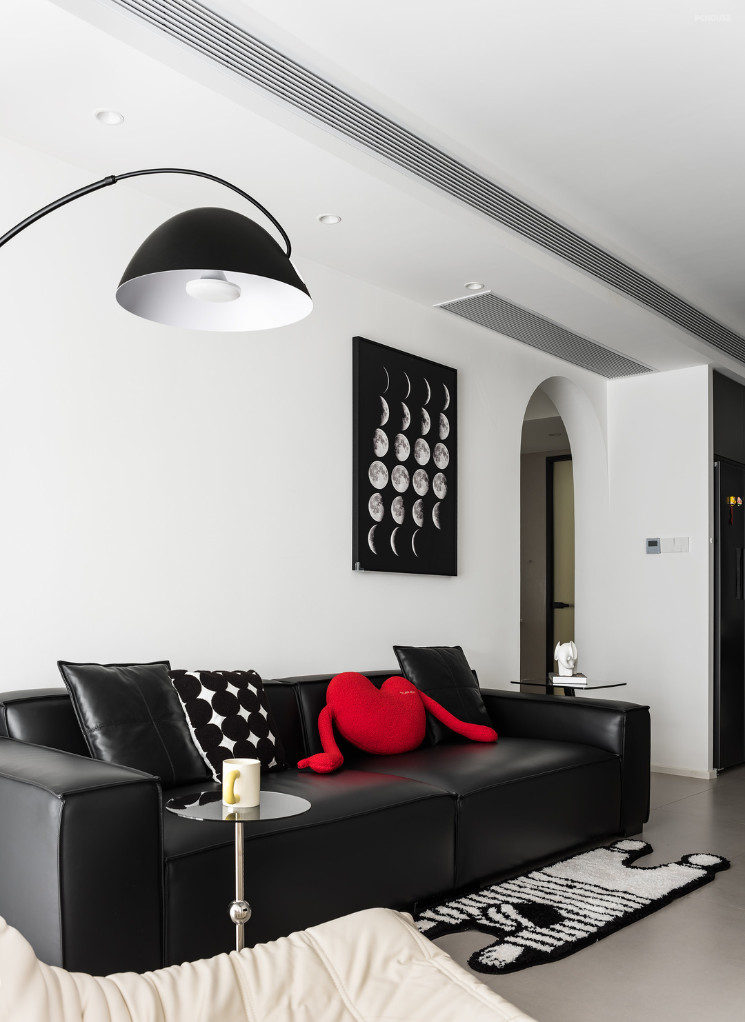 无大地毯,无茶几,主打一个黑白简约,喜欢这种利落通透的感觉。黑色的豆腐块放在客厅耐看舒适,搭配线条感十足的钓鱼灯,慵懒自在,高低搭配空间更有层次。