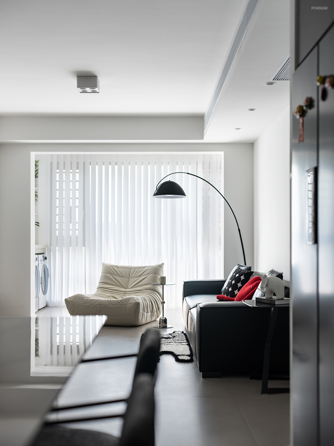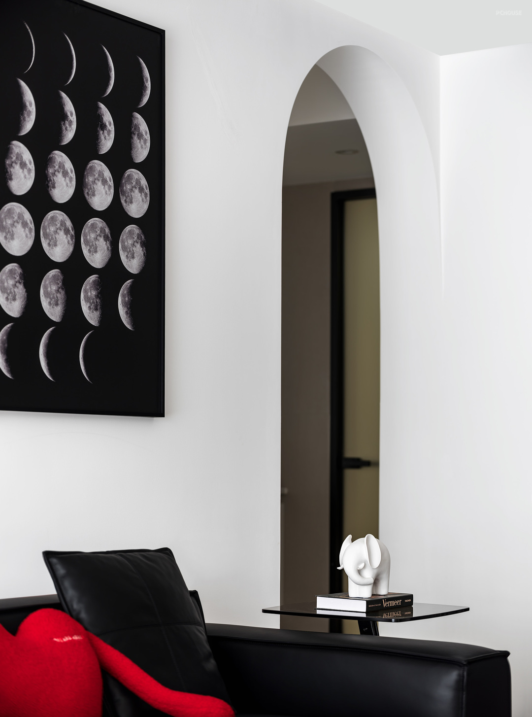黑色的皮质沙发是空间中比较少有的深色物品,高光的质感与空间的白色亚光质感层次叠加对比,相得益彰。