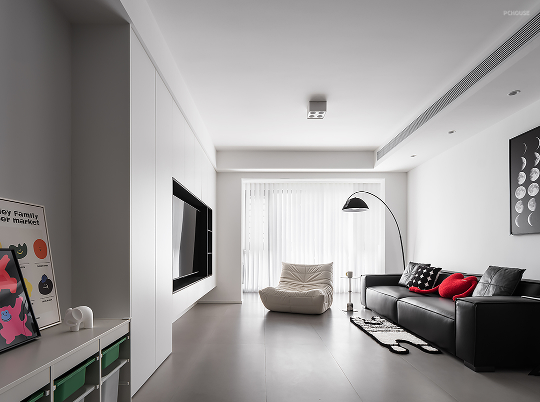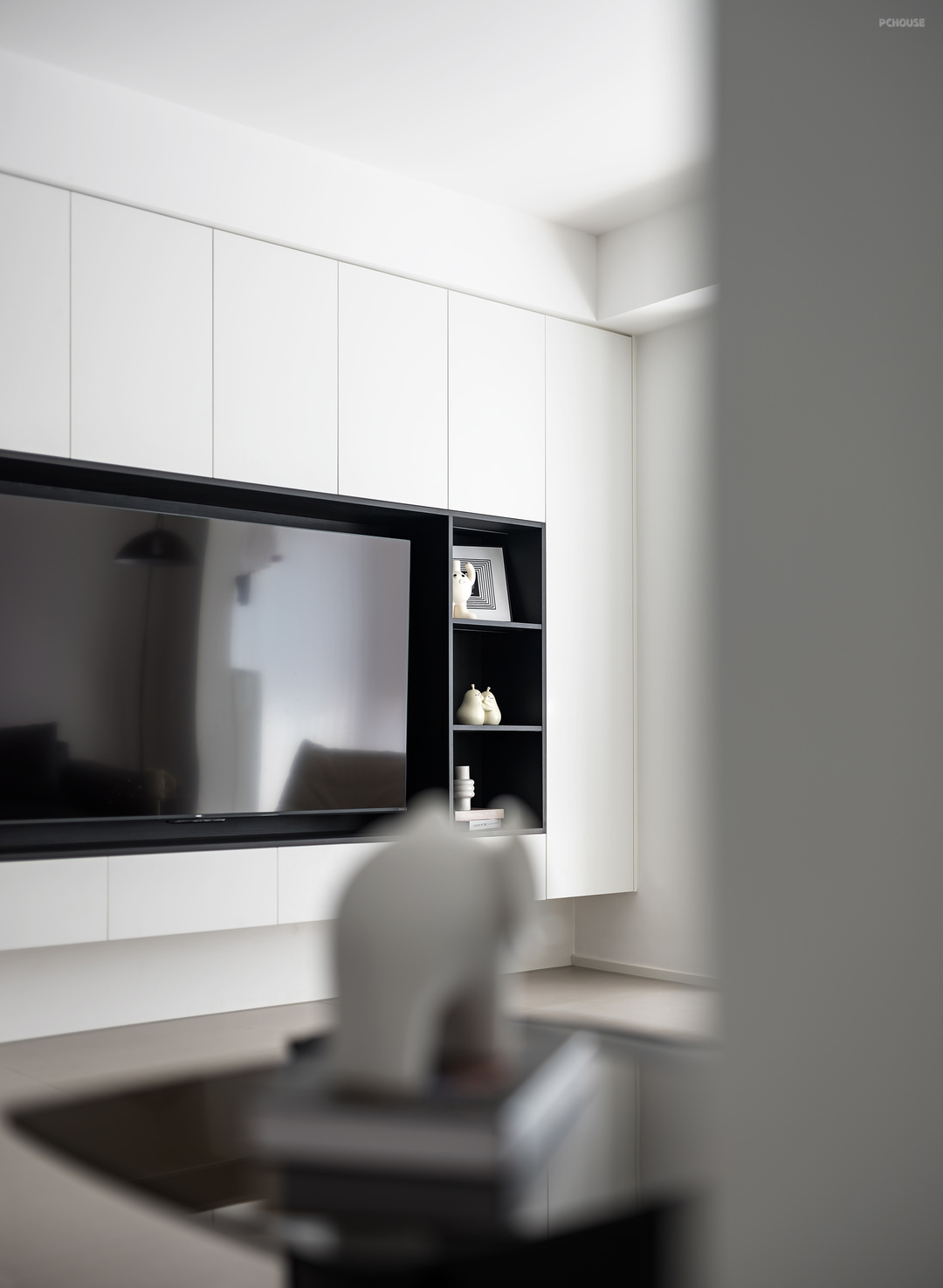 客厅拆除了原始的隔断和阳台的推拉门,整体连通后整个瓷砖通铺,吊顶贯穿到底,线条流畅。电视背景墙采用整墙的白色墙柜,无拉手的按压式柜门最大程度上保证了空间表面的整体性。