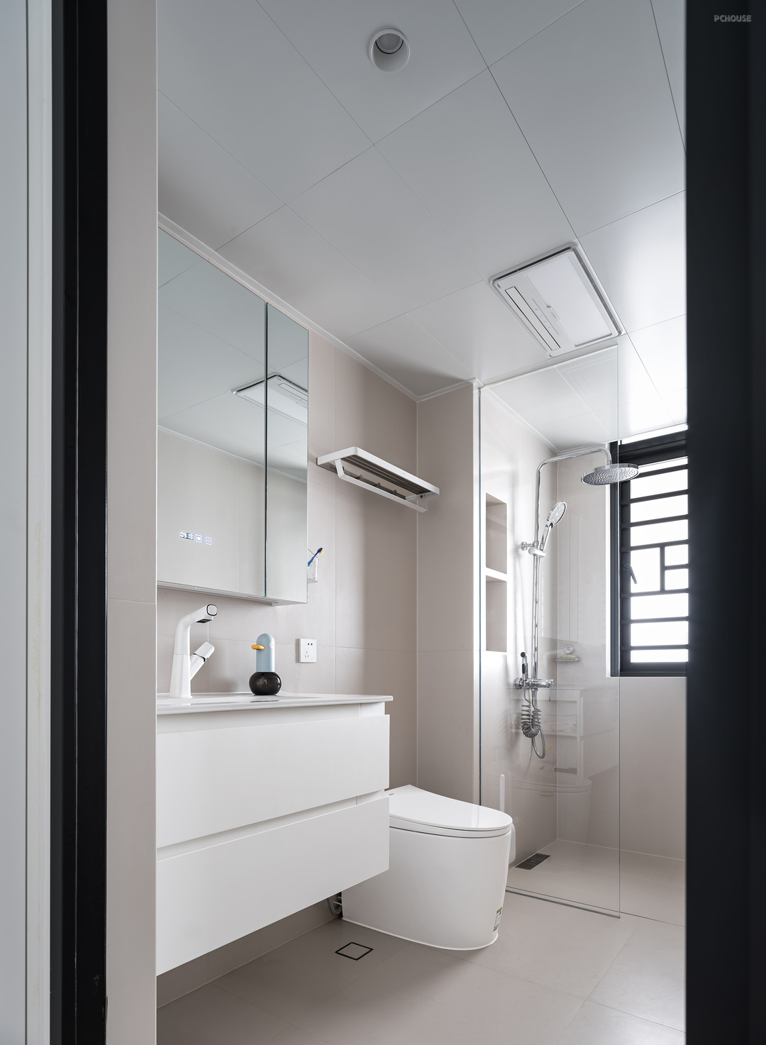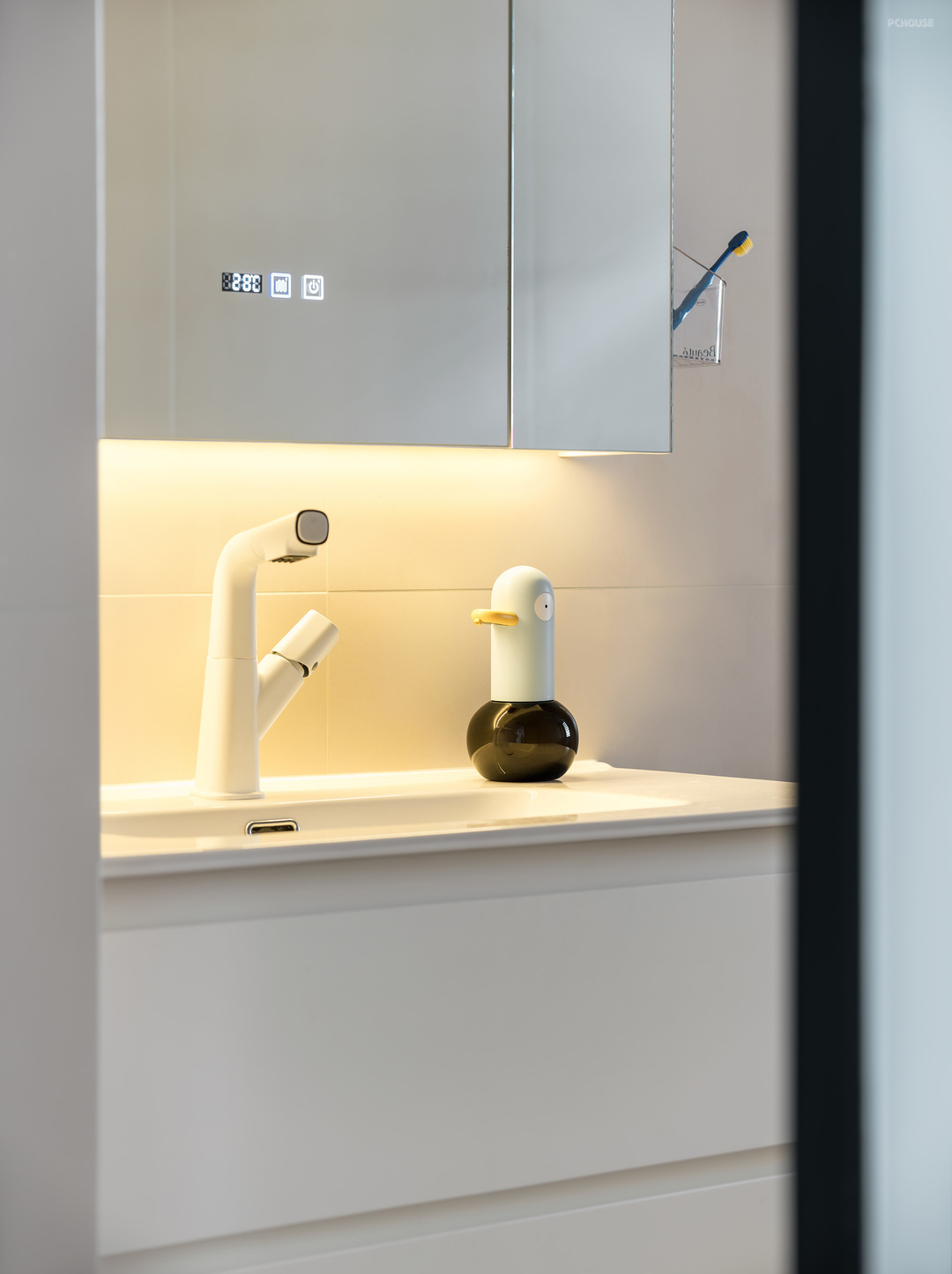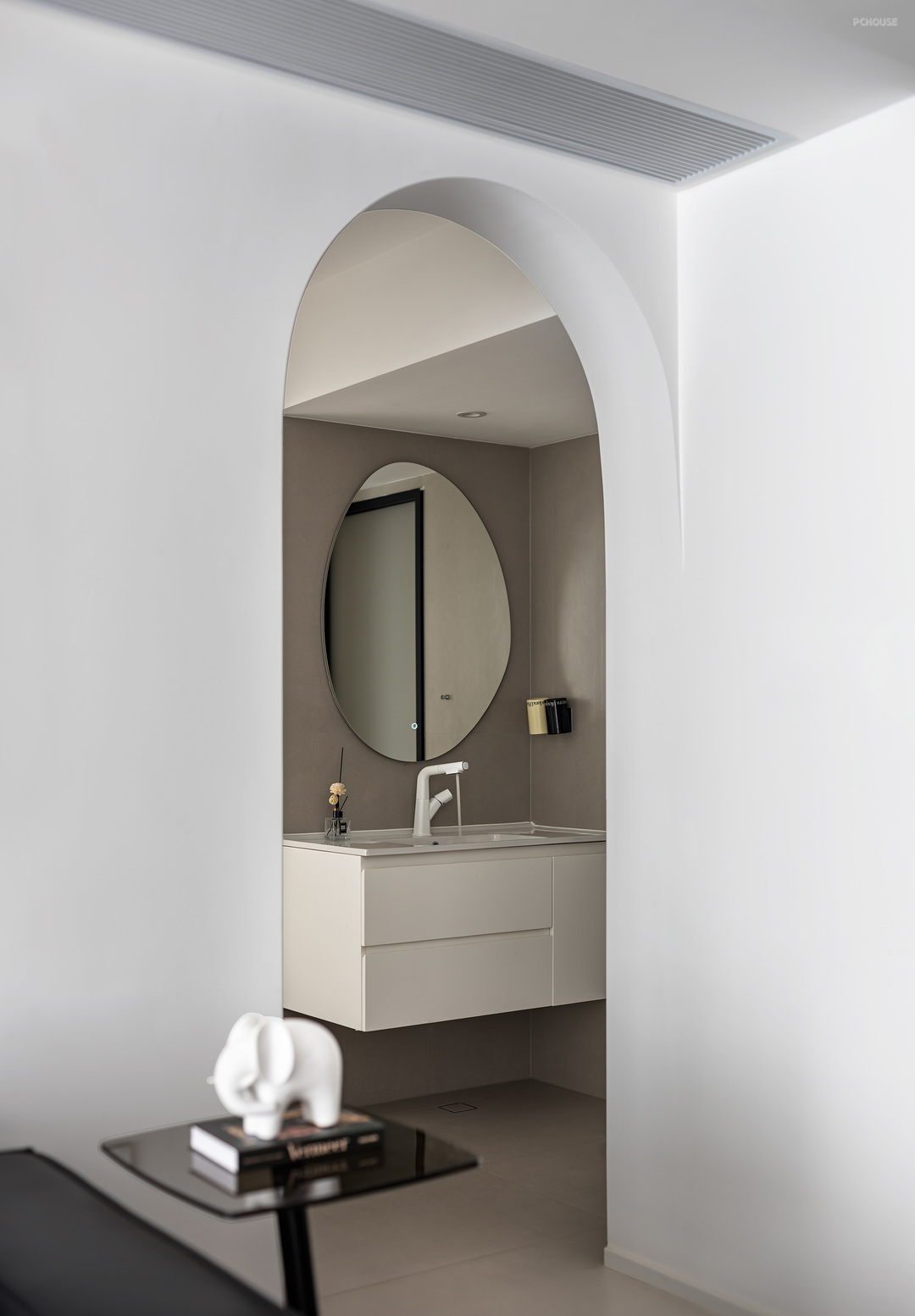 干区通过墙体的改造后,把干区并到公共区域,不规则的镜,让空间的通透感和艺术性增强,台盆柜体采用悬空设计,打扫卫生无死角。