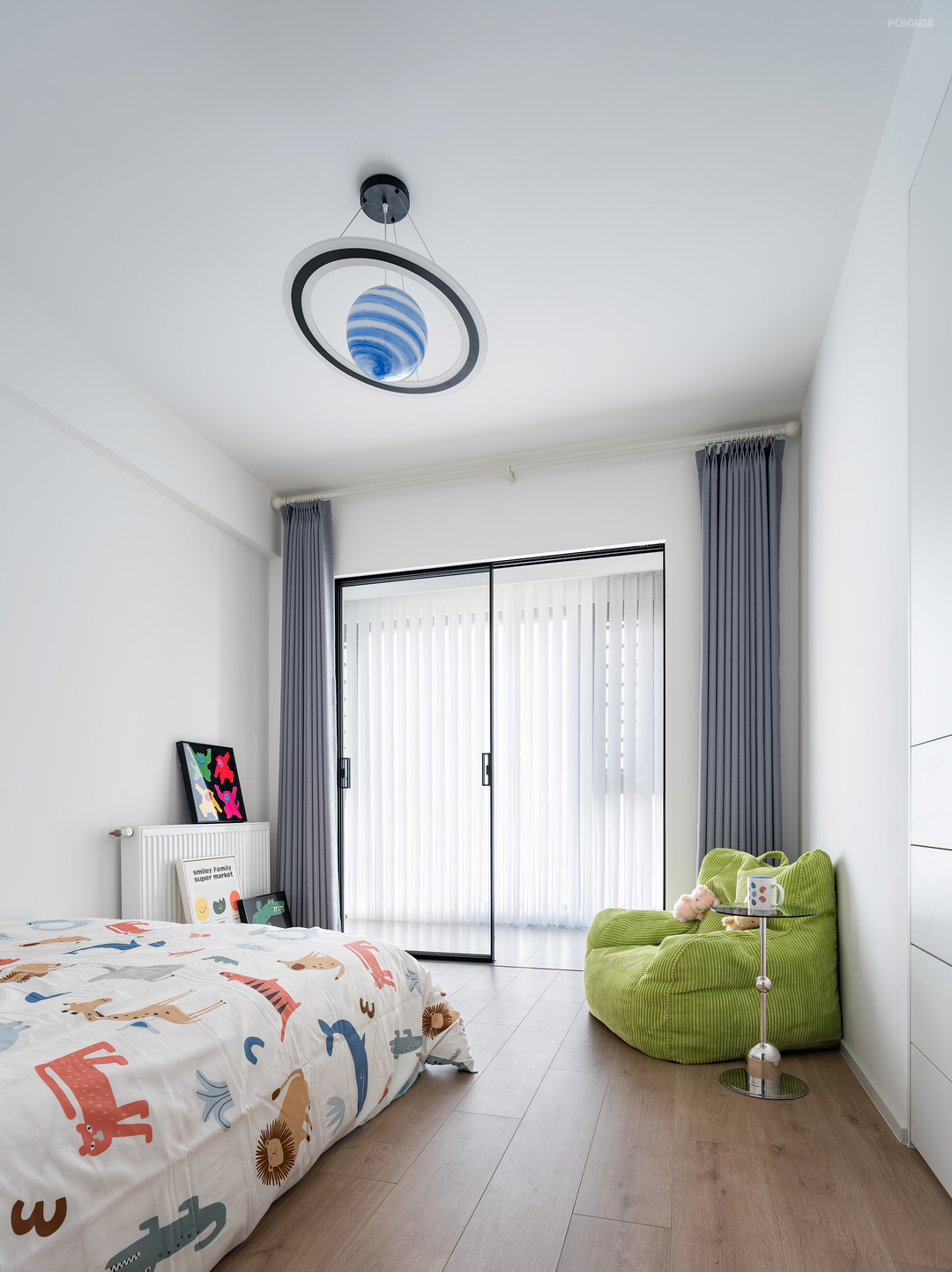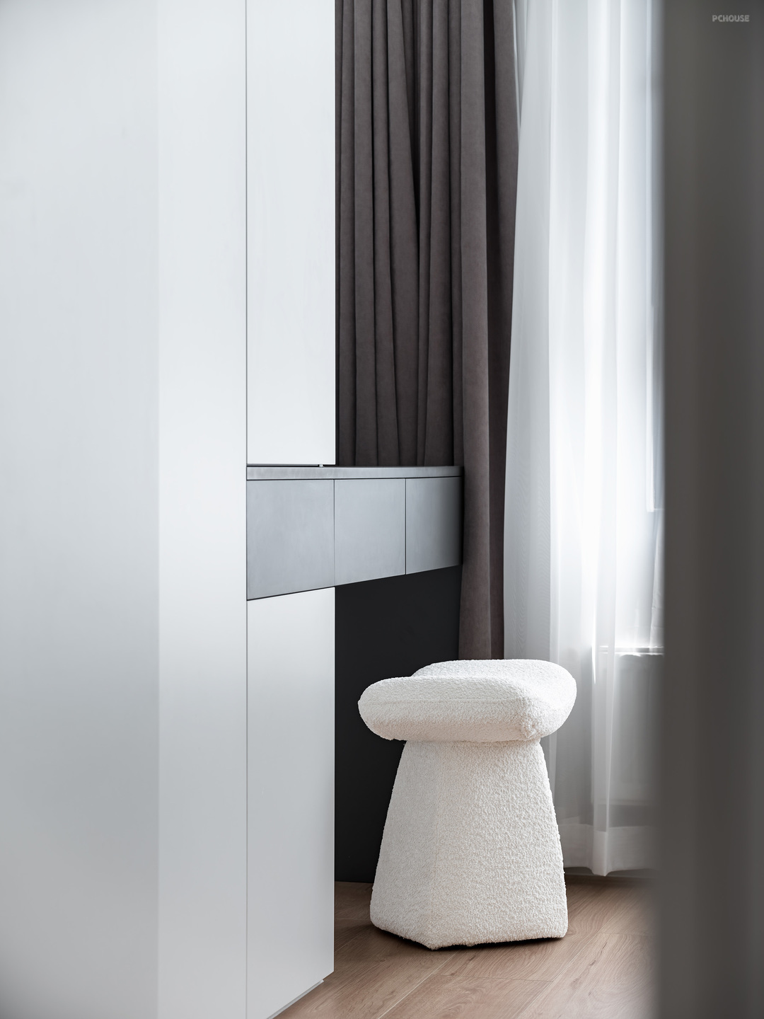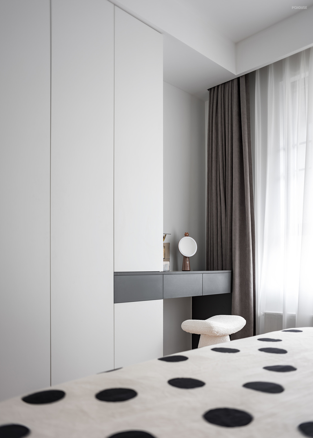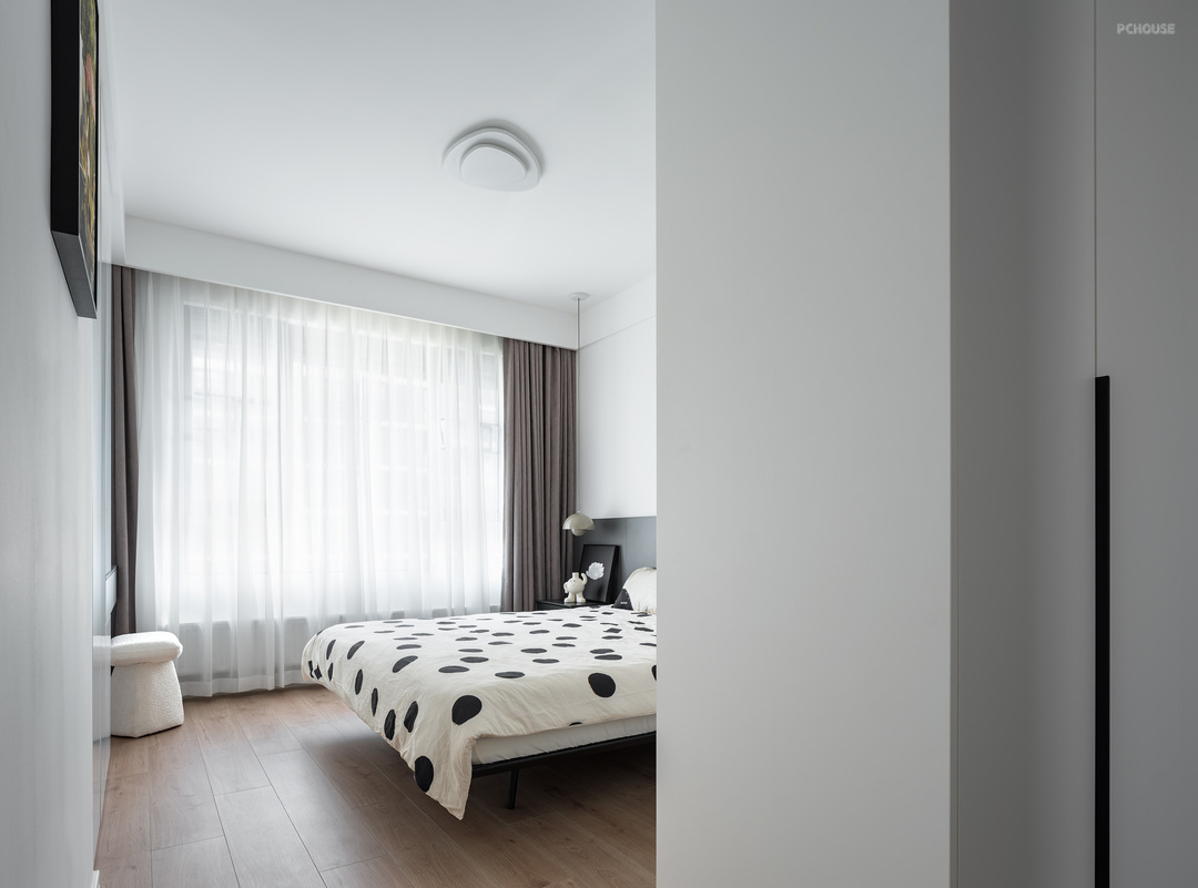 主卧的设计以温馨舒适为理念,采用白色作为整屋的色彩主调,搭配上木质地板,深色半墙护墙板,柔和的氛围灯营造出极为居家的卧室氛围。