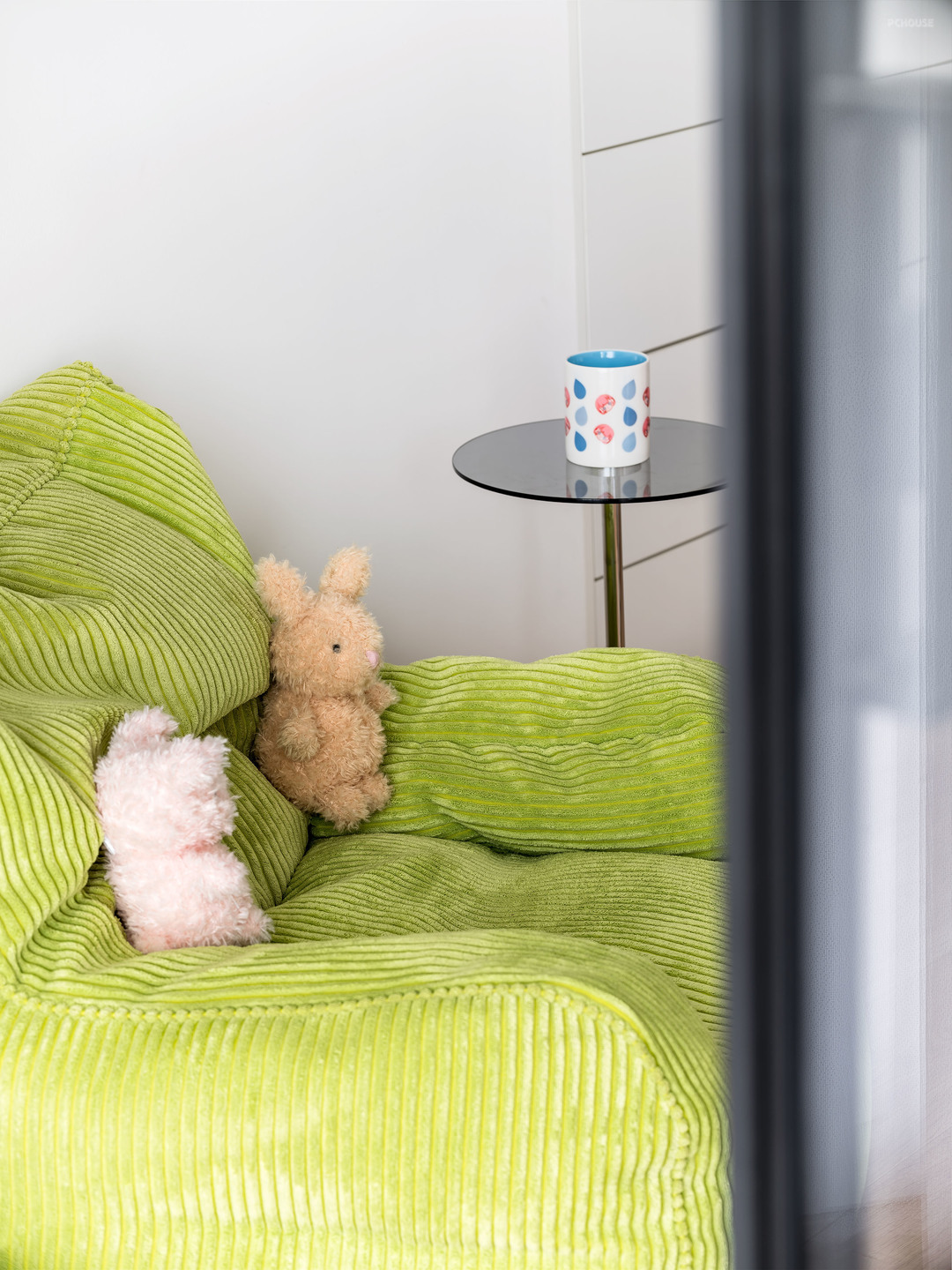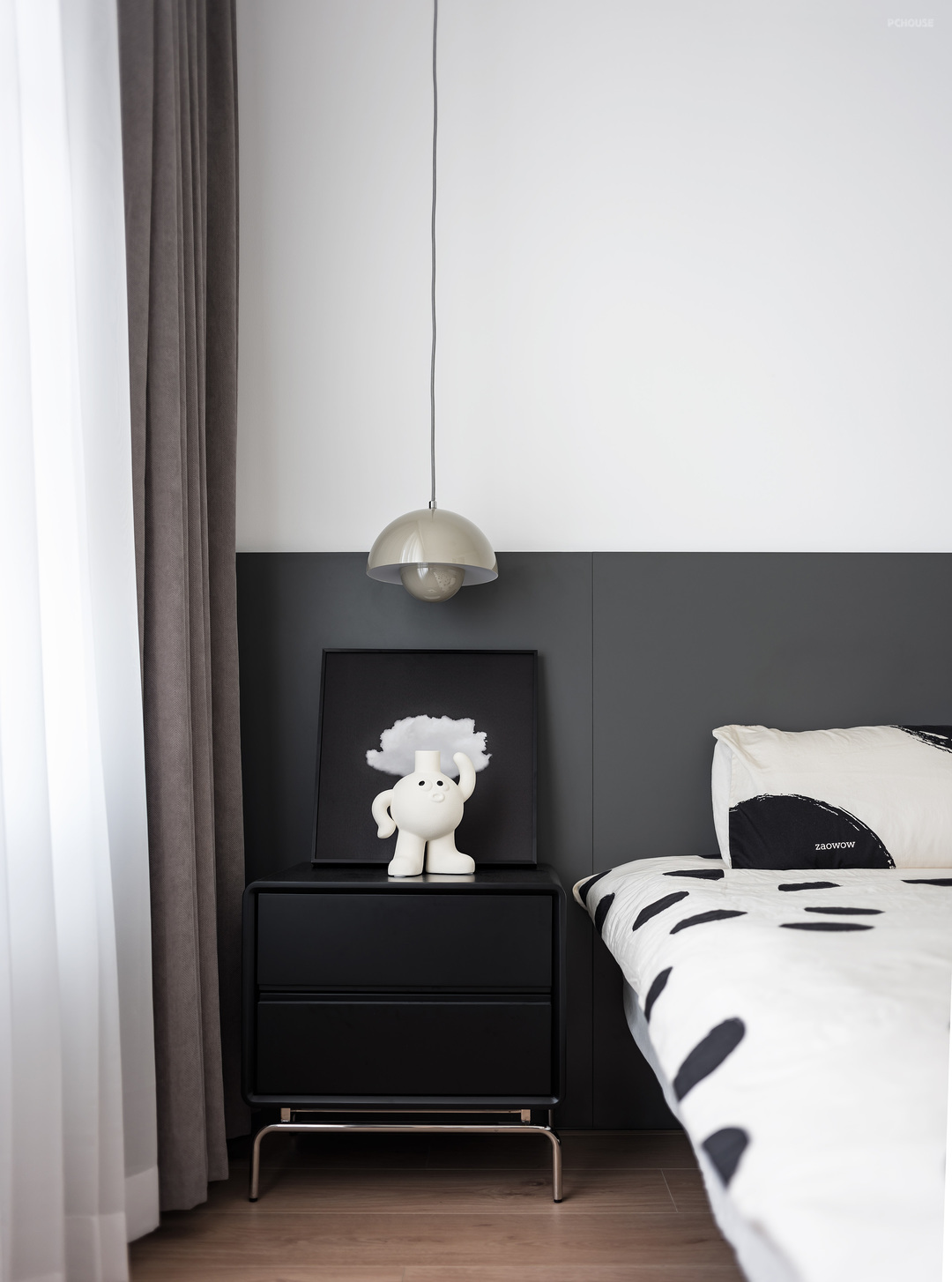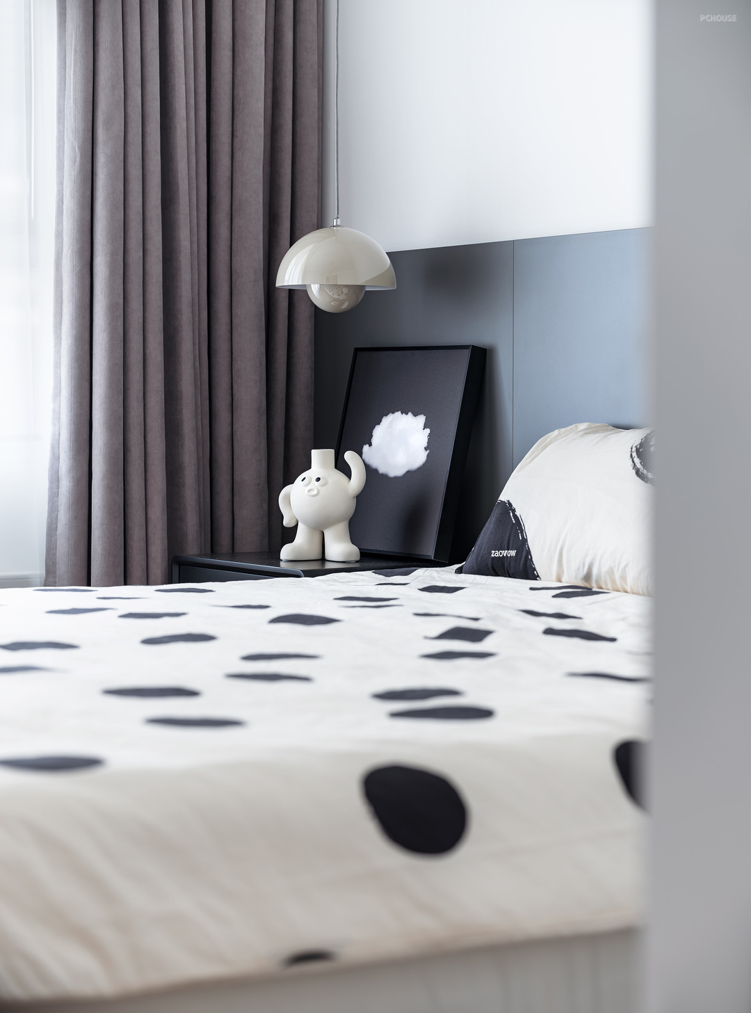 主卧室床头搭配丹麦品牌&Tradition的花苞灯,颜色清新,很有质感。