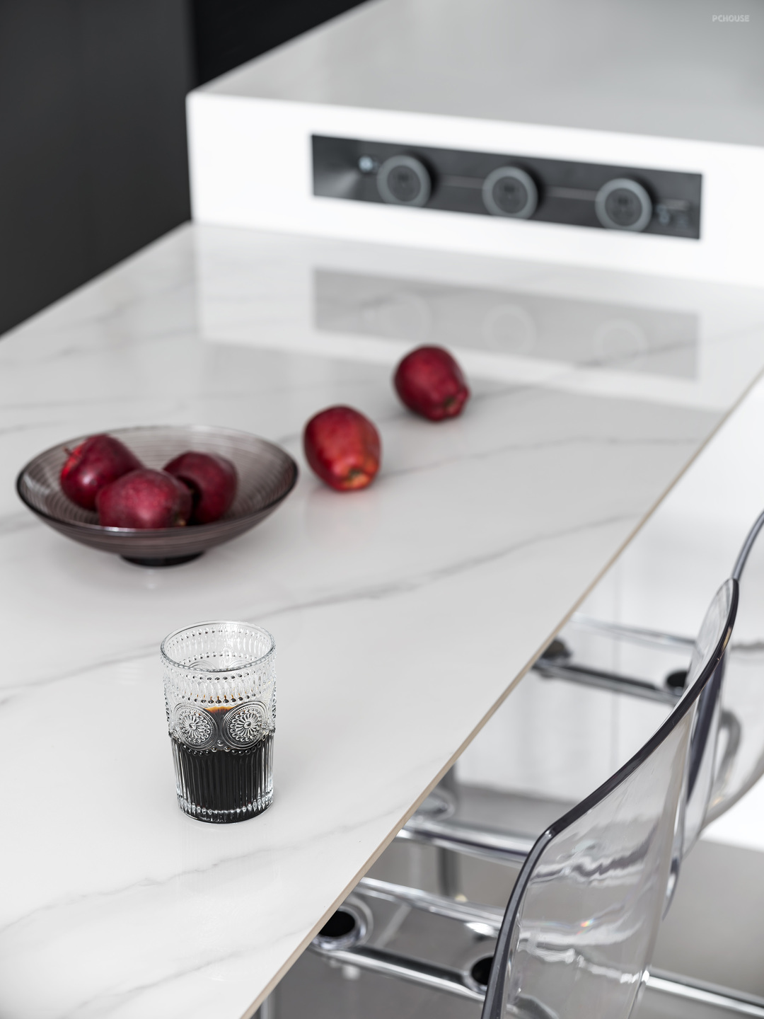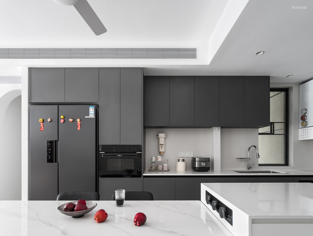 厨房拆除隔断后,空间上与客厅融合,极为宽敞,布置也变得更加灵活,1.8米的餐桌搭配上简约的黑色餐椅,看起来更加优雅自如。在开放式厨房做饭,视线可遍及客厅、餐厅,可以边烹饪美食边和家人聊天。