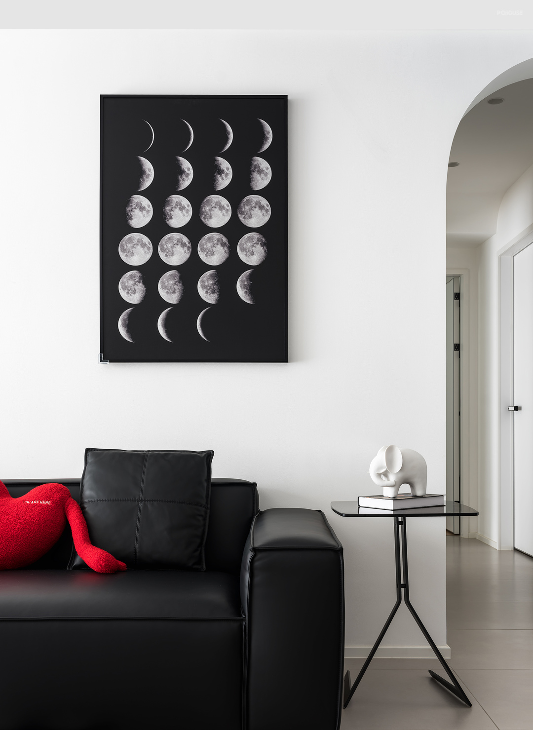 墙壁上挂置的日月星异,还原月阴晴圆缺的真实状态,每一个画面都是独一无二的。同样是黑白色调,在空间能达到一种微妙而平衡的氛围。