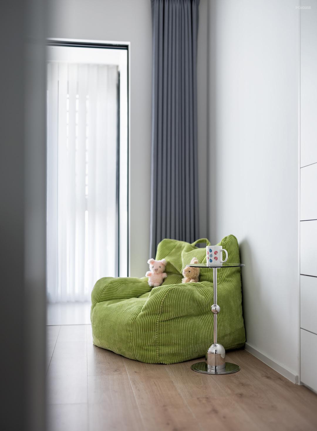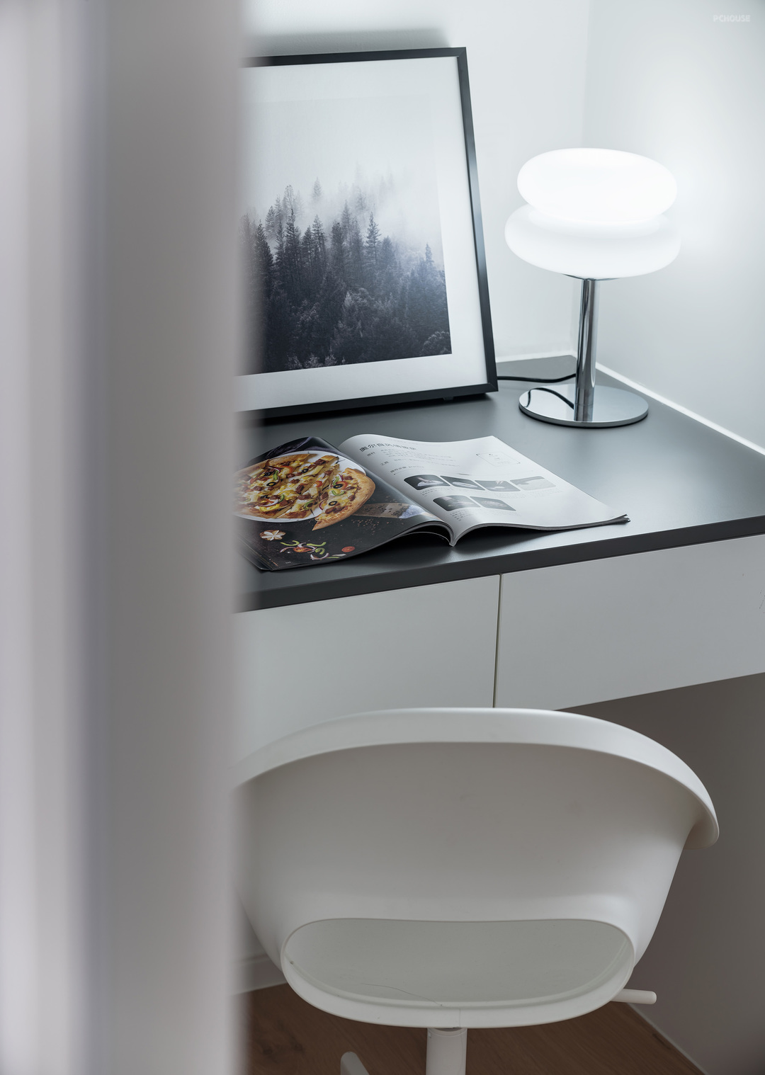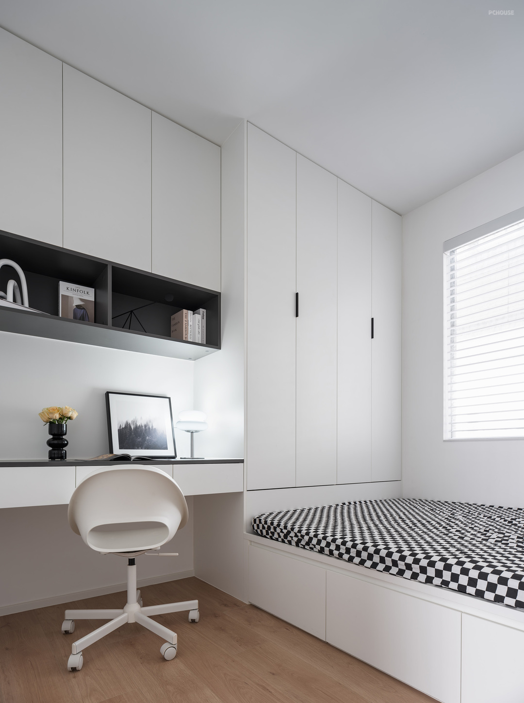 书房以榻榻米多功能房呈现,一体式衣柜和书桌增强了空间的连贯性,兼具美观和功能性。靠床上方是储物柜,平常不使用的衣服或者生活用品都可以收纳起来。
