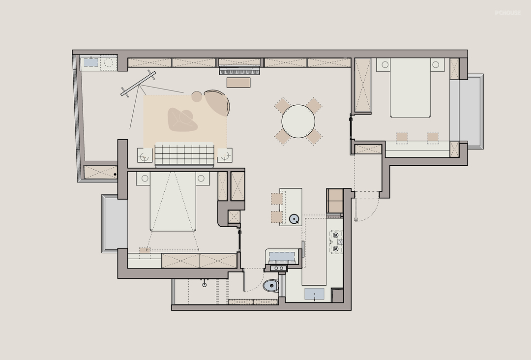 将原有卧室和客厅之间的墙体进行拆除和新建,来增加客厅和餐厅尺度,并拆除客厅和阳台之间的移门,打破空间界限,来扩展视野与室内采光,让整个公共区域更加通透开阔。
