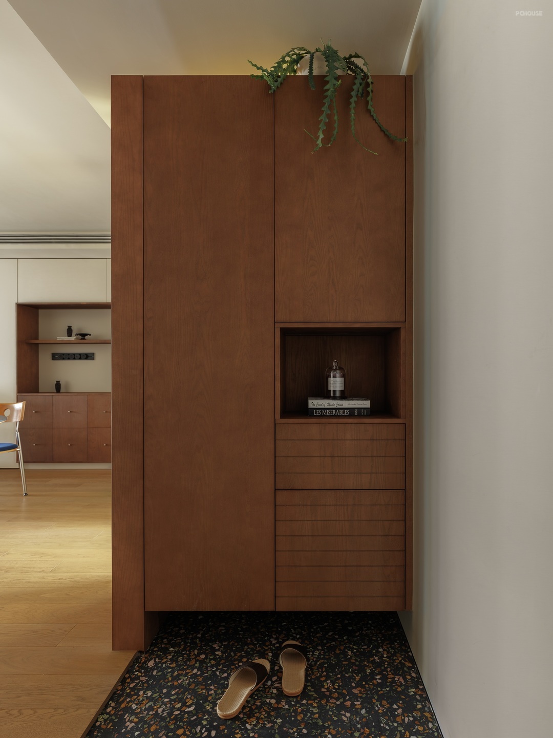 一体式到顶的储物柜,不仅让视觉上具有和谐统一的开阔整洁感,同时实用功能与空间质感也得到了大幅度提升;