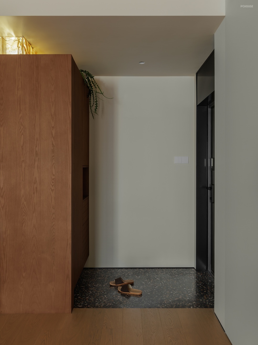 原本玄关空间比较狭小,采光也不好;我们将进门玄关墙体内推,来增加玄关柜尺度;并采用墙体与玻璃砖穿插设计,以及悬空鞋柜,让空间尺度和光照得到释放。