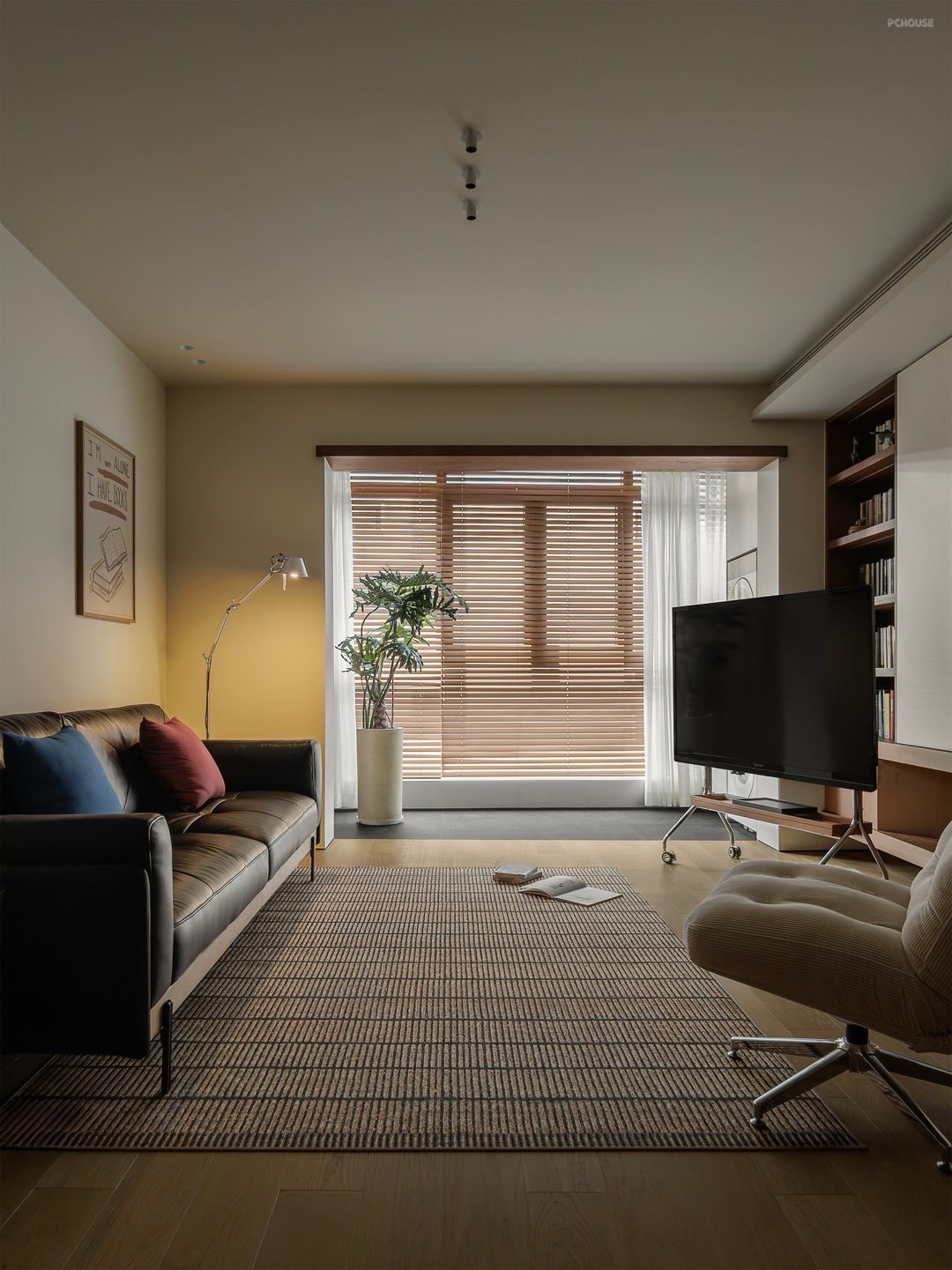 大面积的落地窗引入充足的自然光线,让整个空间明亮而温暖。同时选择摈弃复杂的背景墙装饰,选择大面积留白延伸至顶,低保和色系搭配无主灯设计,来营造家的腔调与精致氛围;