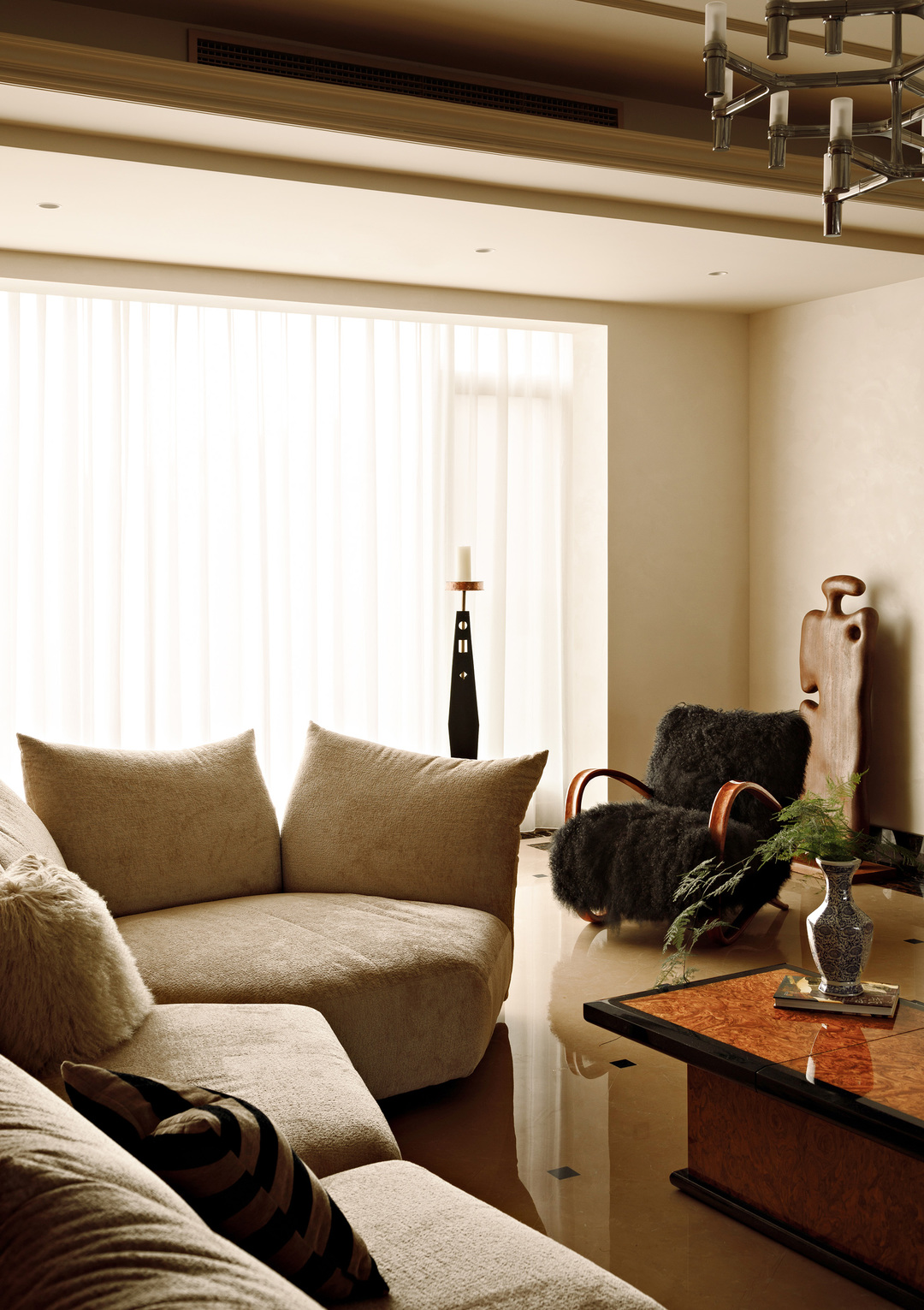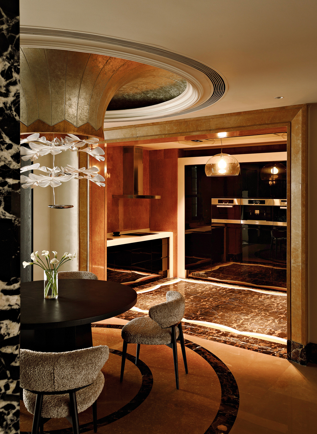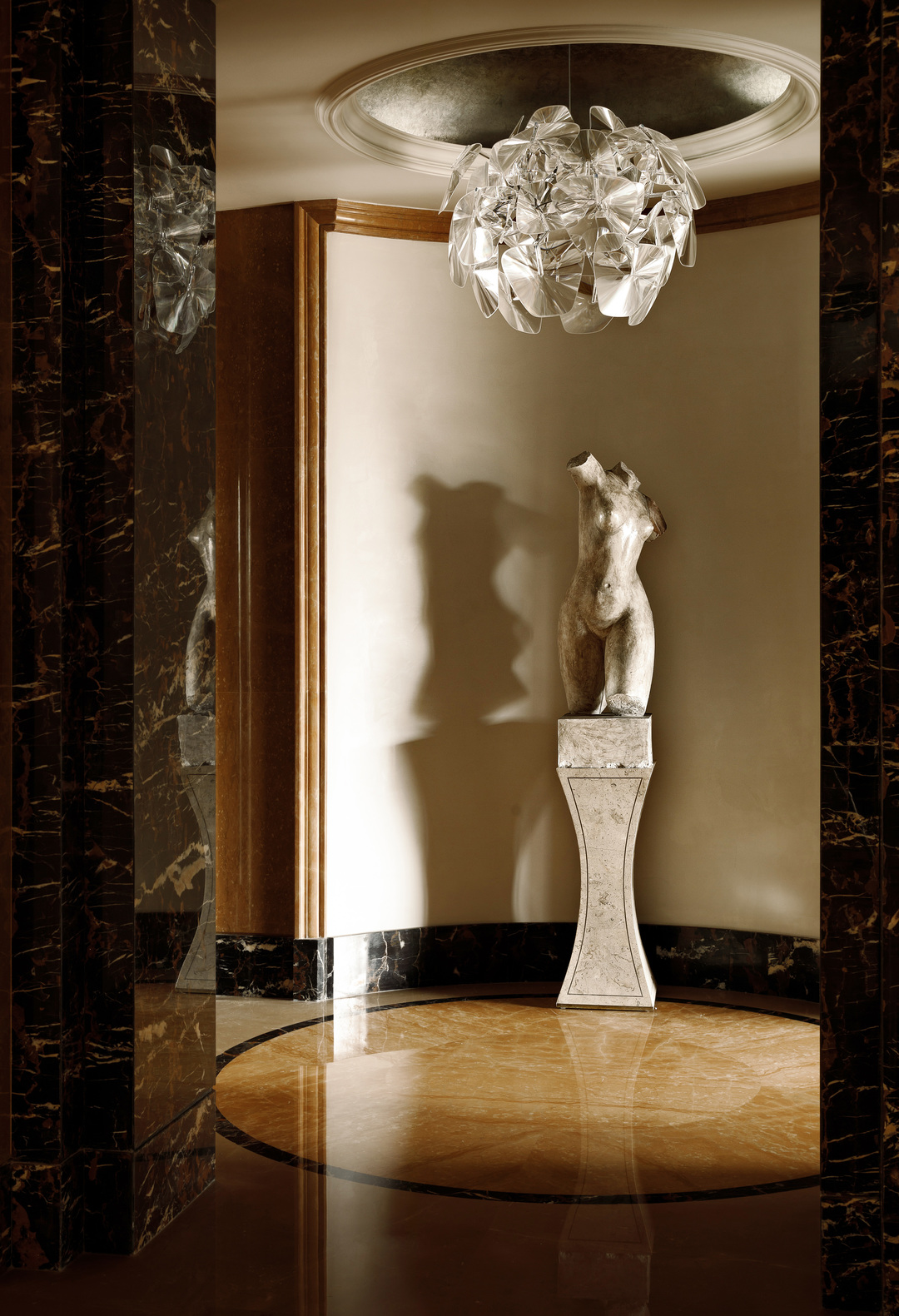 进门后的视觉终点,是通向卧室私区的走廊。我们将一尊大理石雕像放置在圆形走廊的尽头,让它成为视觉的焦点,减少向内打探的可能性。替换了原本的水晶灯,改以更具个性的设计师款,在银箔贴面的基座衬托下显得更具气质。