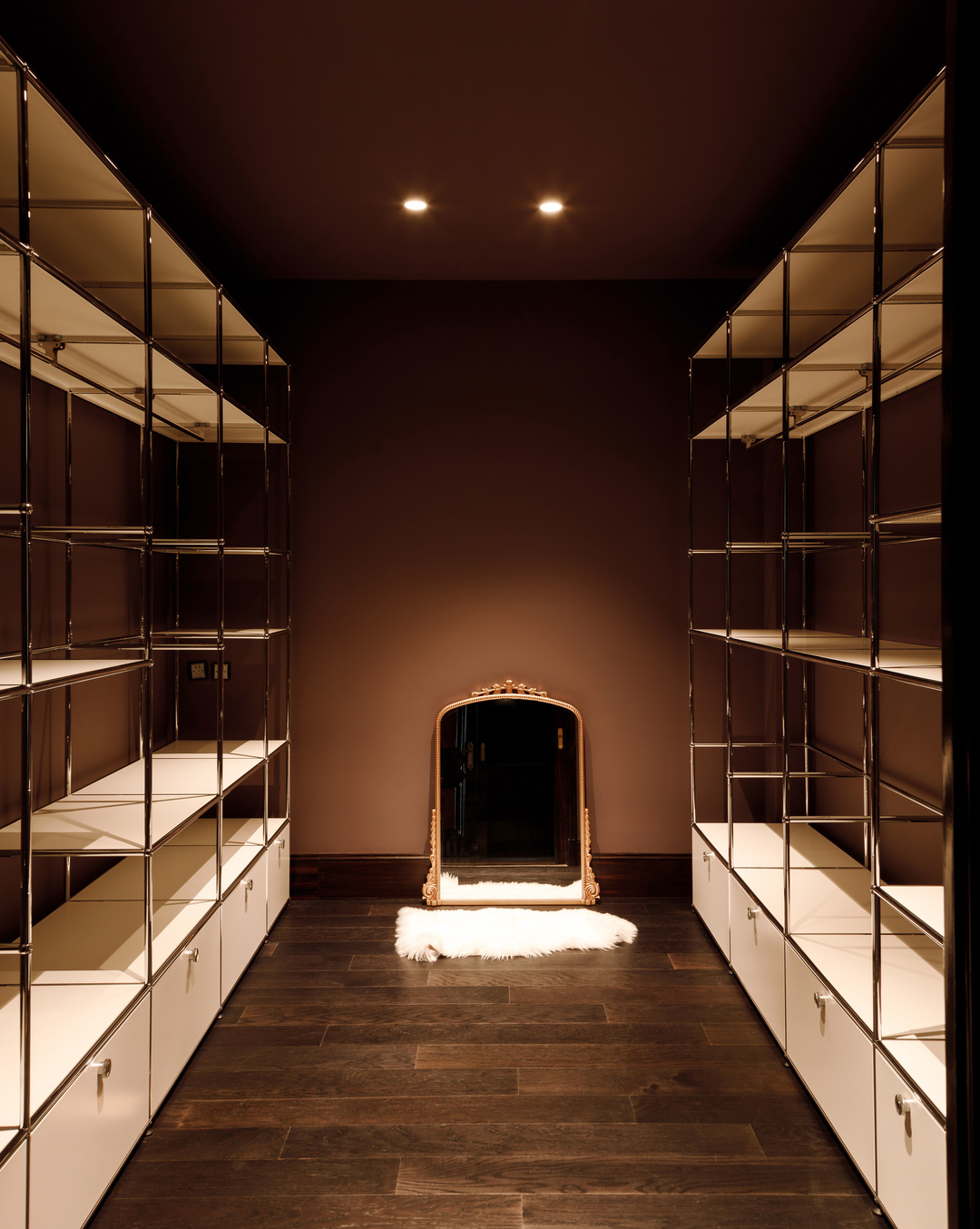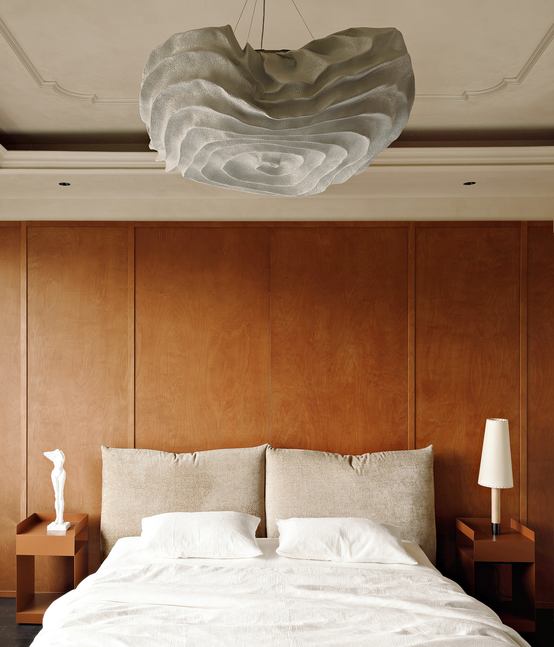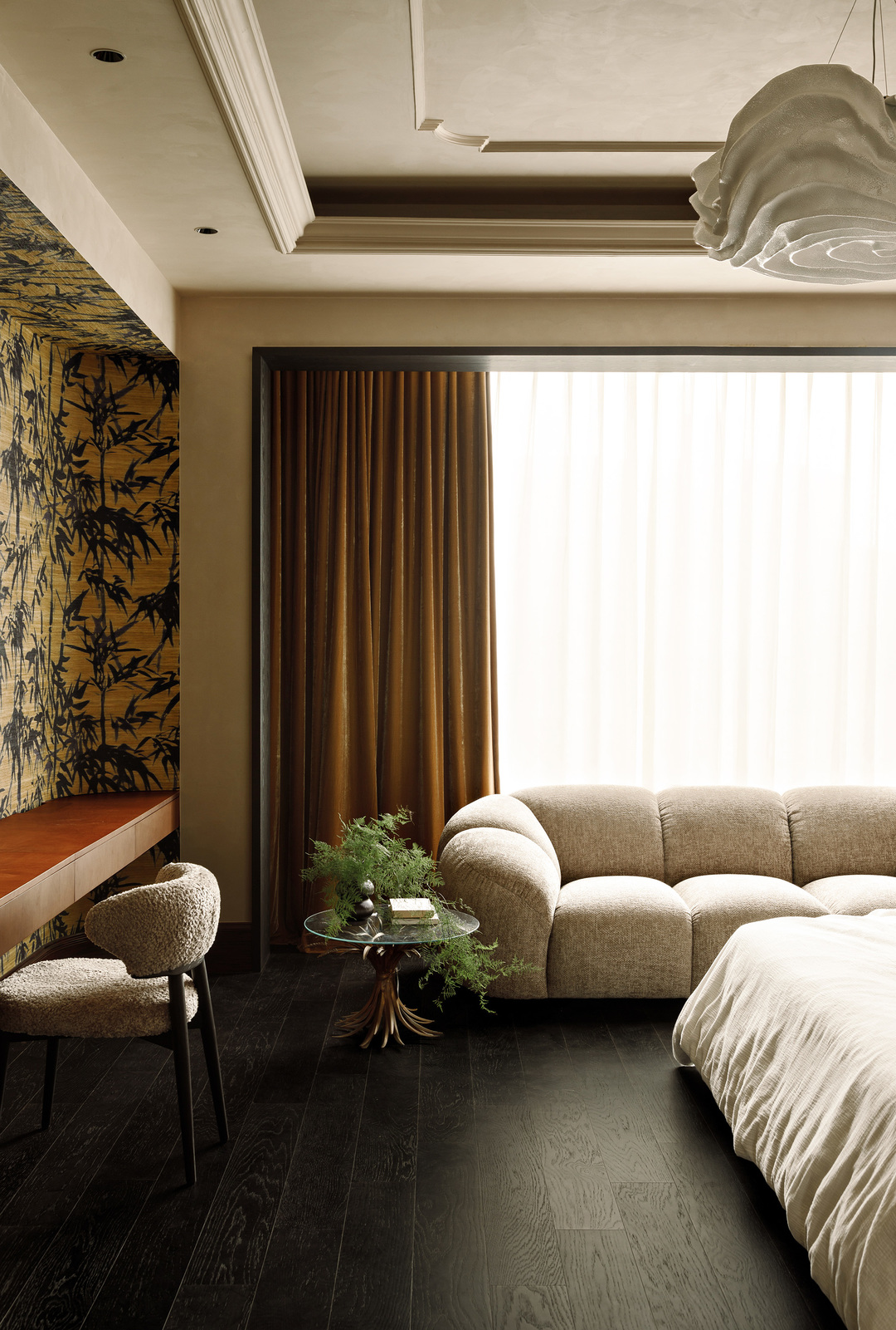 进门后的视觉终点,是通向卧室私区的走廊。我们将一尊大理石雕像放置在圆形走廊的尽头,让它成为视觉的焦点,减少向内打探的可能性。替换了原本的水晶灯,改以更具个性的设计师款,在银箔贴面的基座衬托下显得更具气质。