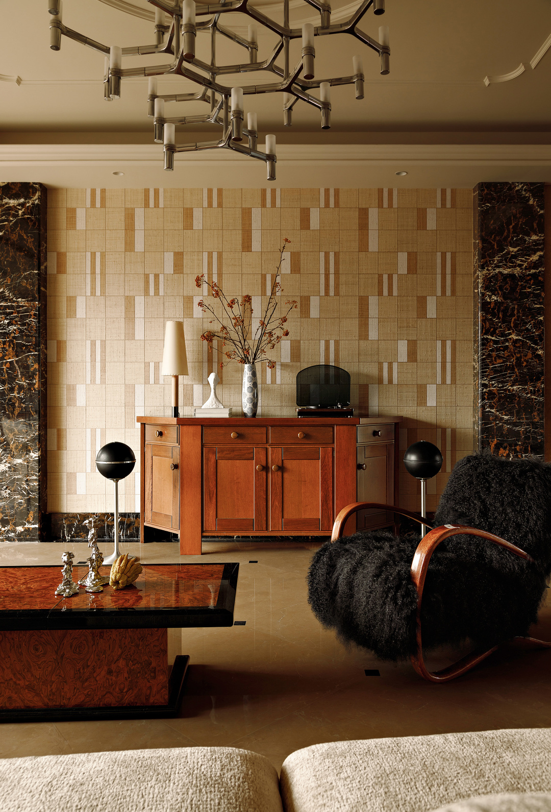 1.保留空间中的奢石材料与线条,定调静奢的老钱风格,处理成符合当下审美的设计