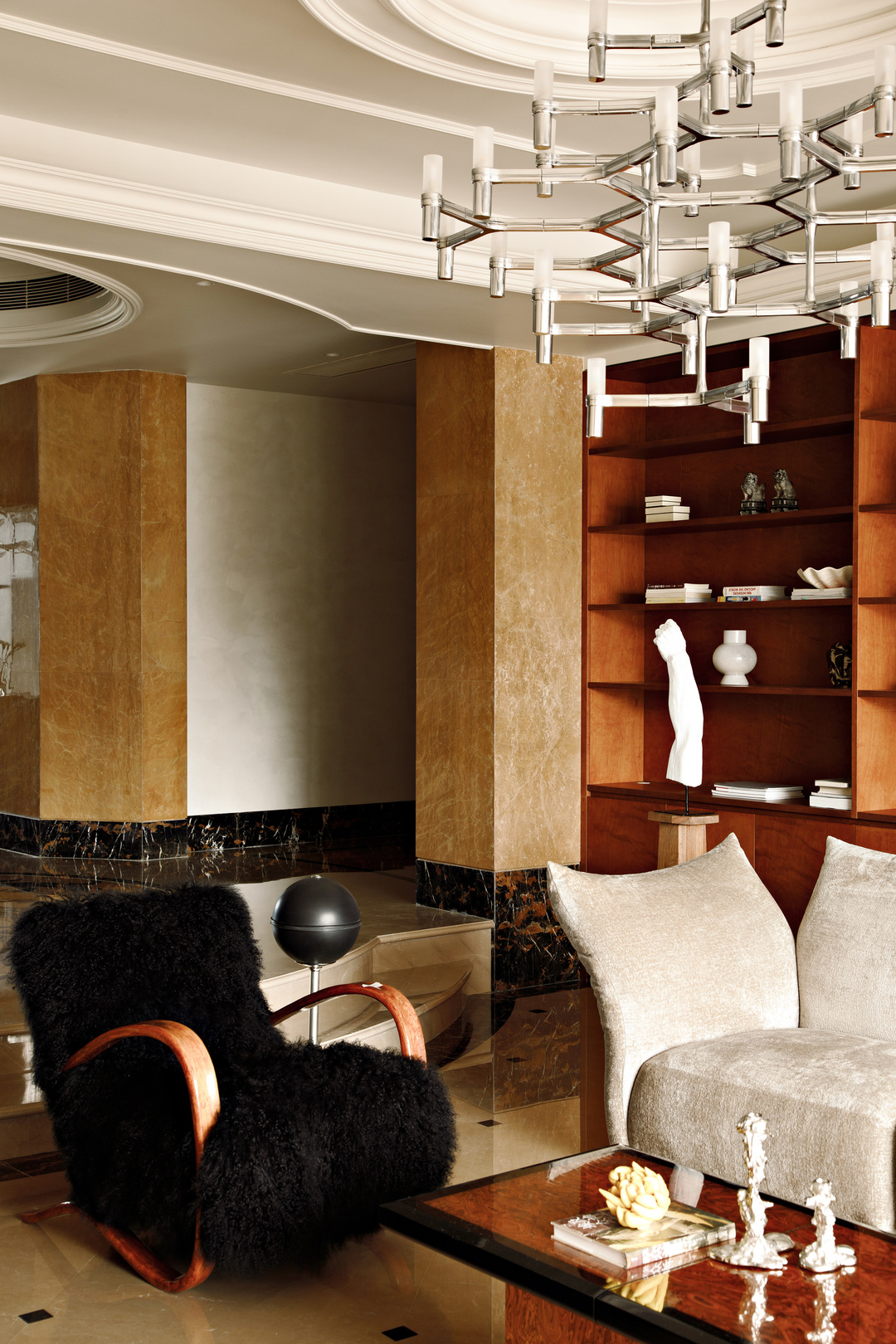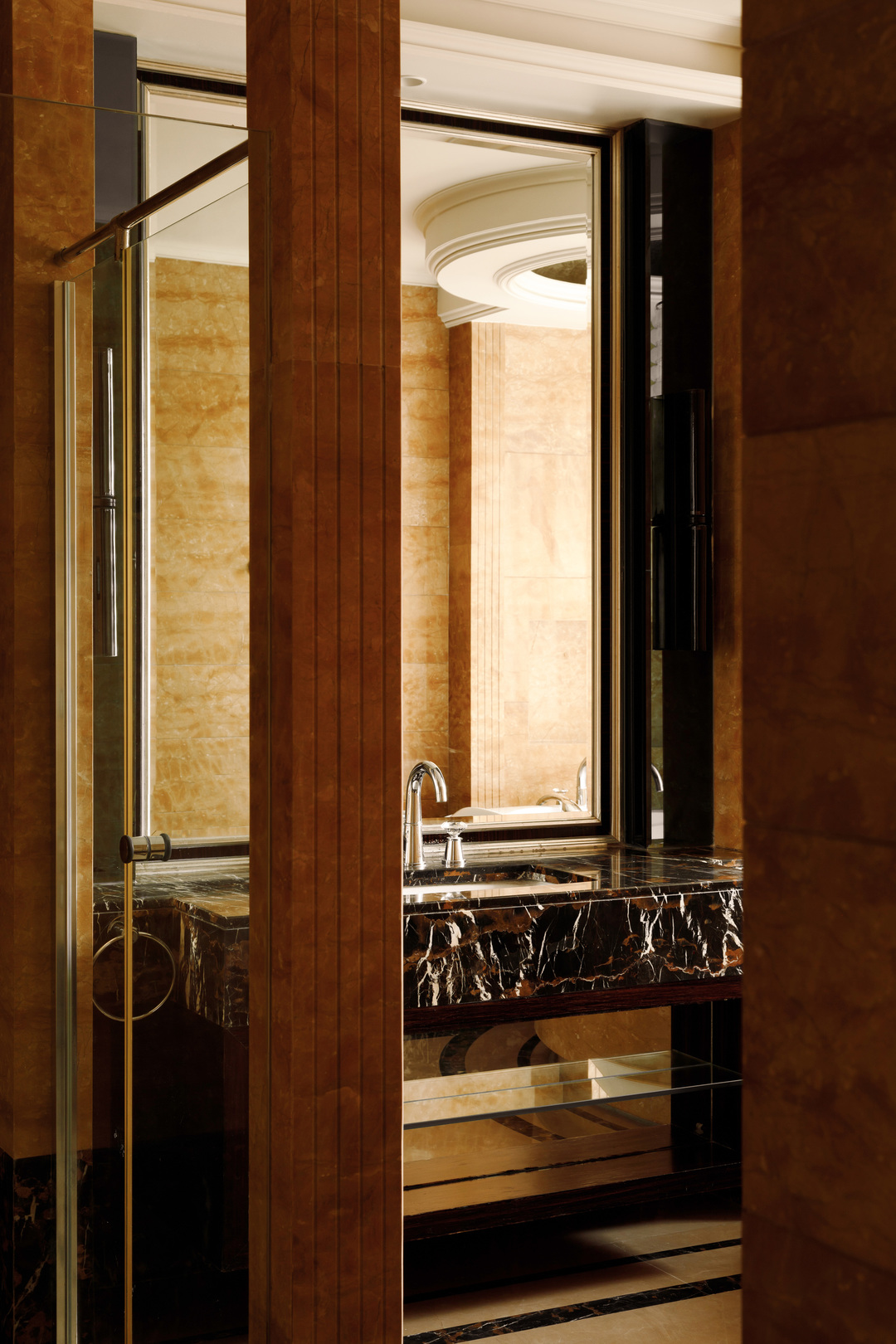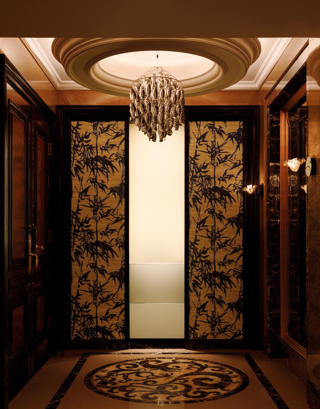 初次来到这里,给我们最深刻印象的,就是黑檀木的入户大门。沉稳大气的枣红色以及随着时间浸润表面的实木油脂,绝非任何现代的产品能够模仿,我们据此确定了室内木作的颜色。将埃及黄大理石重新结晶打磨,光亮的表面映出上方金属吊灯的华丽倒影。
