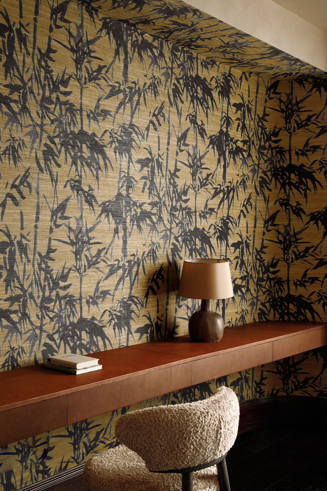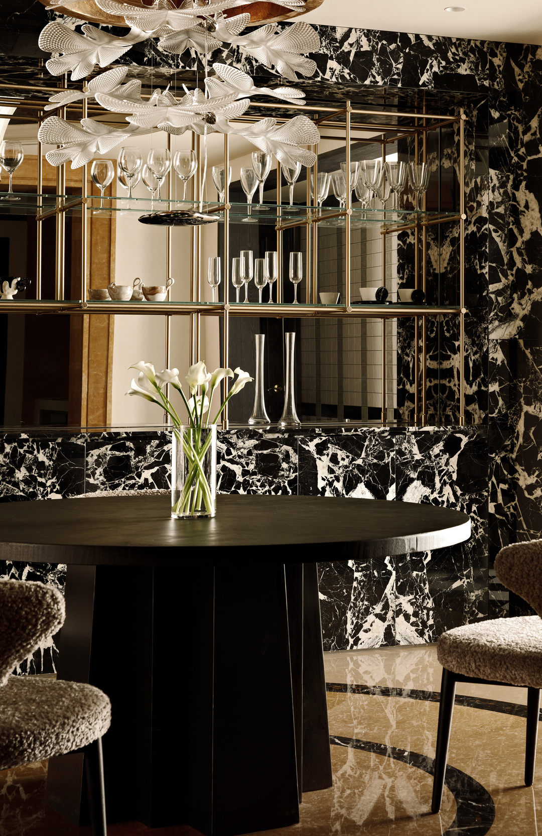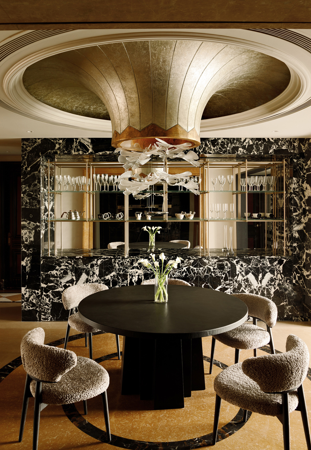初次来到这里,给我们最深刻印象的,就是黑檀木的入户大门。沉稳大气的枣红色以及随着时间浸润表面的实木油脂,绝非任何现代的产品能够模仿,我们据此确定了室内木作的颜色。将埃及黄大理石重新结晶打磨,光亮的表面映出上方金属吊灯的华丽倒影。