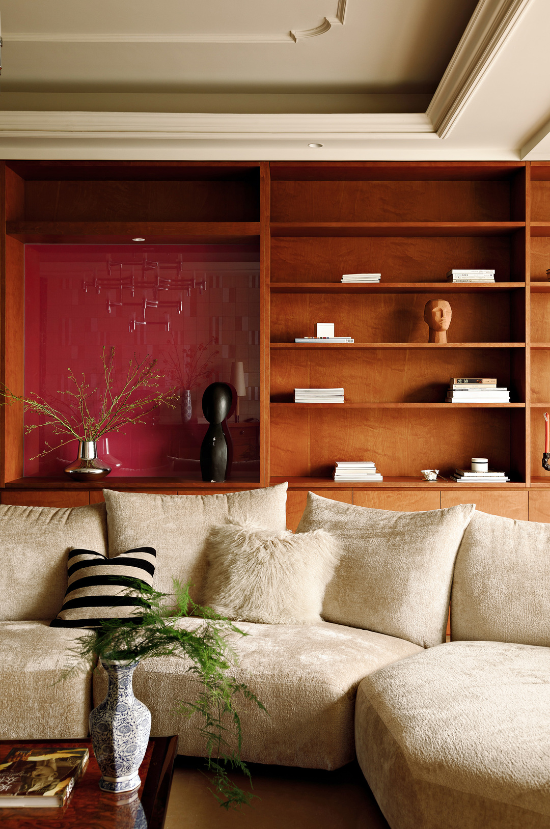 我们敲掉了华而不实的罗马柱,以及既占空间又过时的立面装饰。在拆除了原始的电视背景墙后我们发现,吊顶和墙面的衔接并不理想,即便修补好了,新旧材料对比也难免会有色差。于是我们调转了客厅的方向,将电视背景墙的位置改为定制书柜,以获得更好的整体观感。