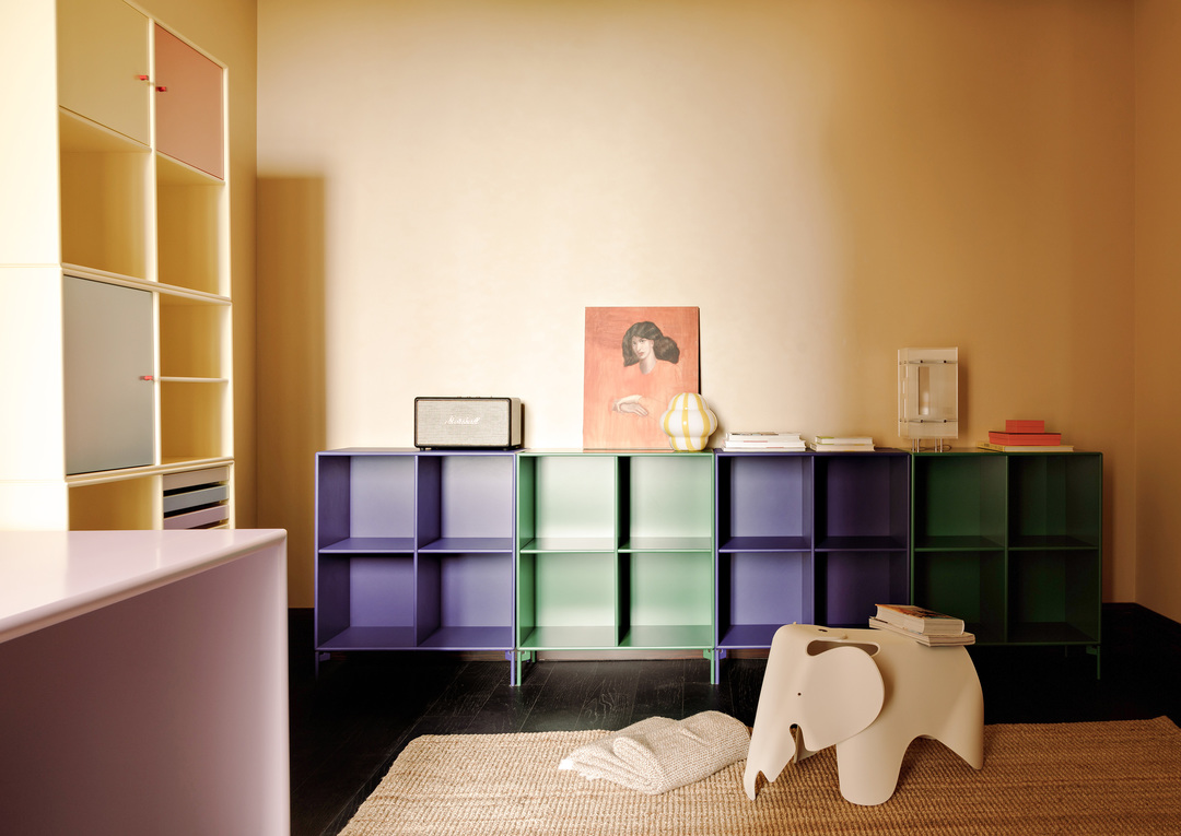 书柜前的沙发放置在空间中部,围绕沙发形成一个回形动线。书柜上方为开放格,放置藏书和唱片,下方是封闭结构,儿童玩具可以收纳其中。阅读、玩耍、欣赏音乐,业主家庭活动所需的道具都可以在沙发背后的收纳系统中轻易找到和安放,既避免了客厅利用率低下,又杜绝了客厅杂乱的可能。