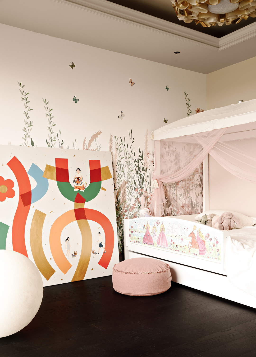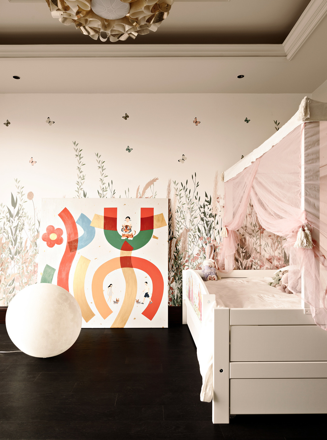 因为业主局改的想法,户型面积又足够充分,没有太大硬伤,因而我们仅对空间功能进行了调整。考虑到即将入住的是一对年轻夫妇,一个1岁的宝宝和2只狗狗,未来还需要一个住家的阿姨,显然这个家需要一些成长的空间。业主需要一个书房来处理工作上的事务,它还要承载阅读、亲子甚至展览的功能。男女主人的收纳要分开,要有各自独立的衣帽间。