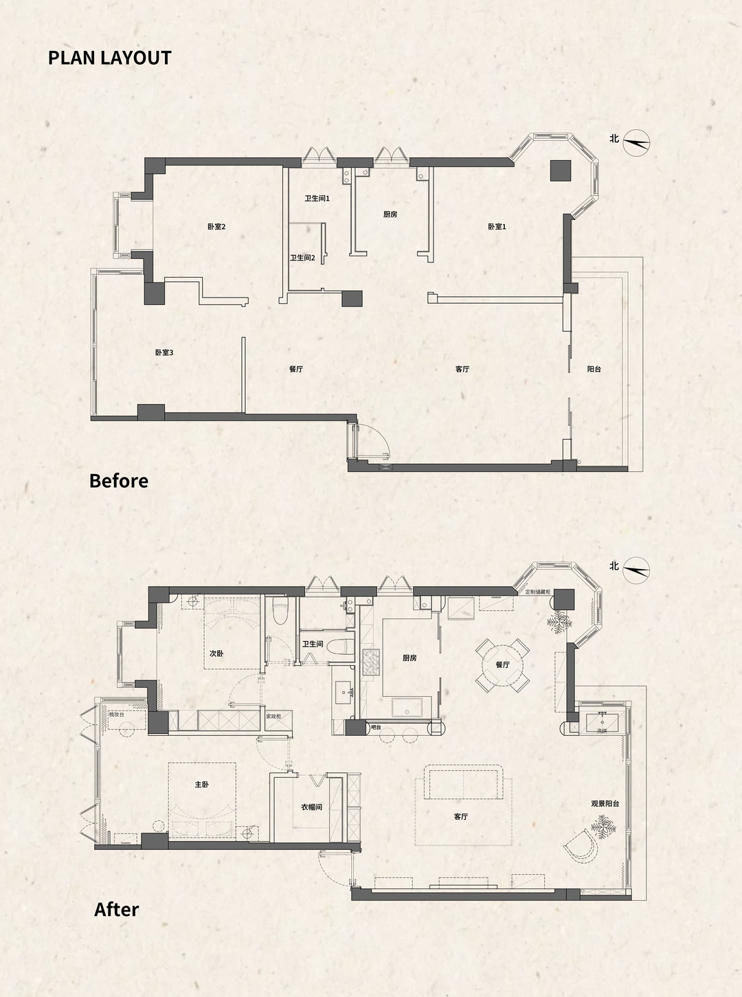 1. 释放南侧次卧,获得了完整的景观面和采光面,公区更加通透,使用场景更丰富;