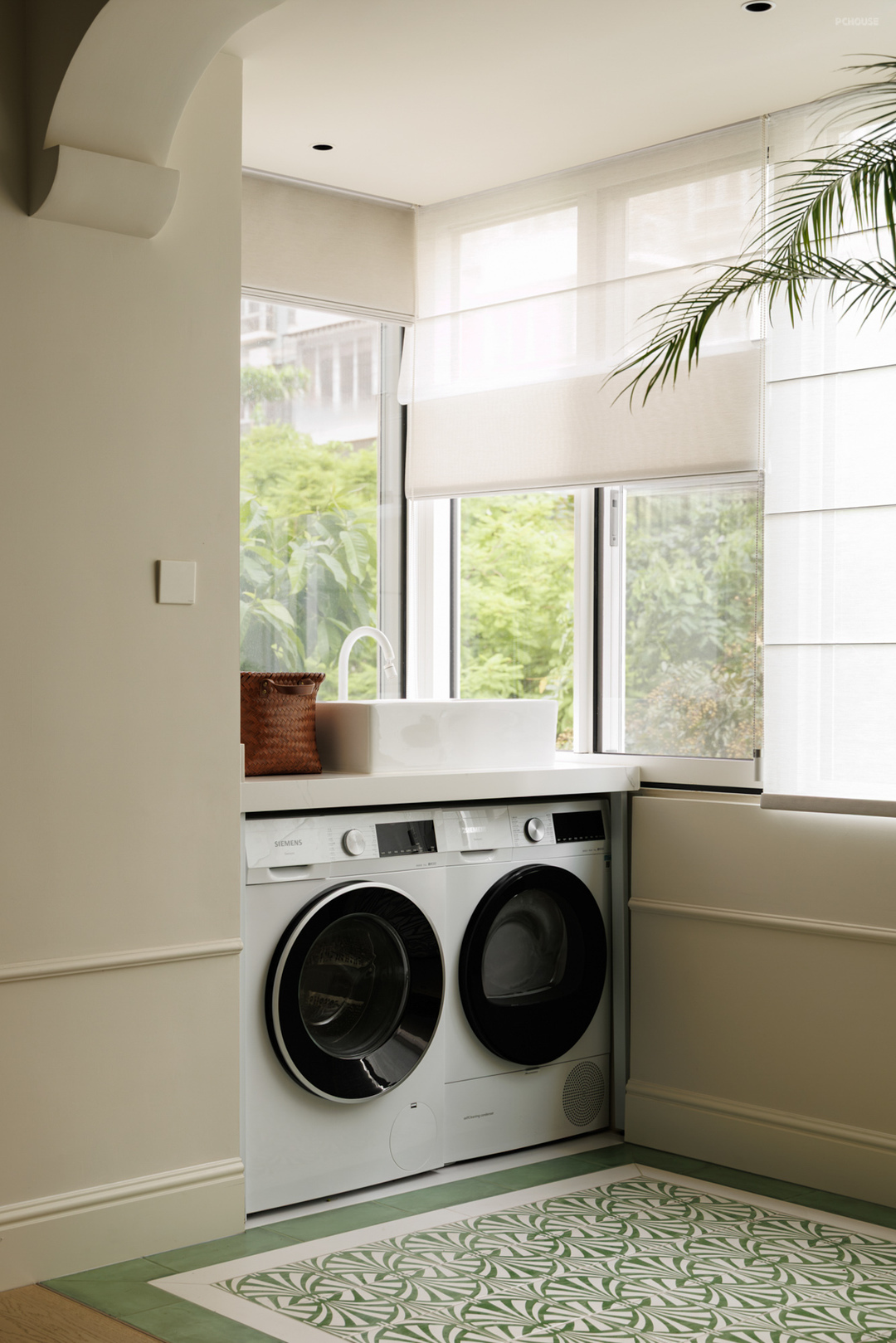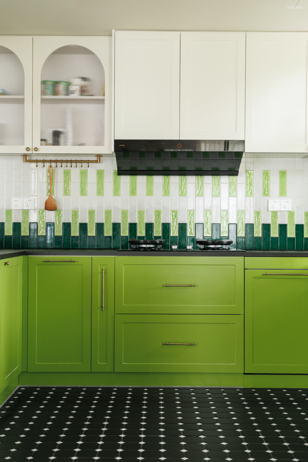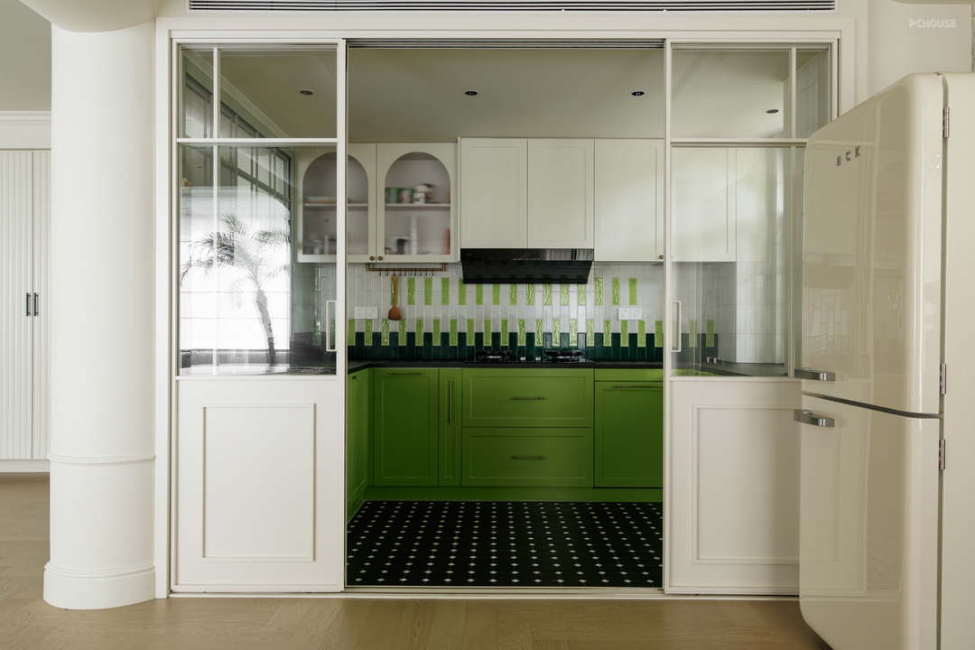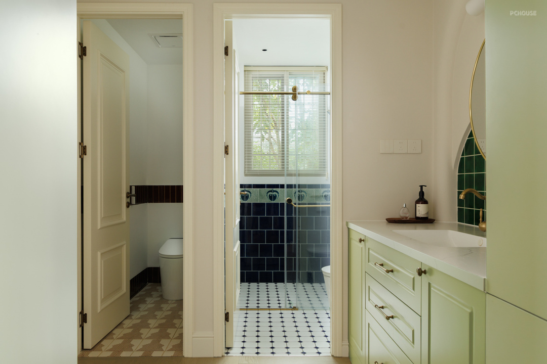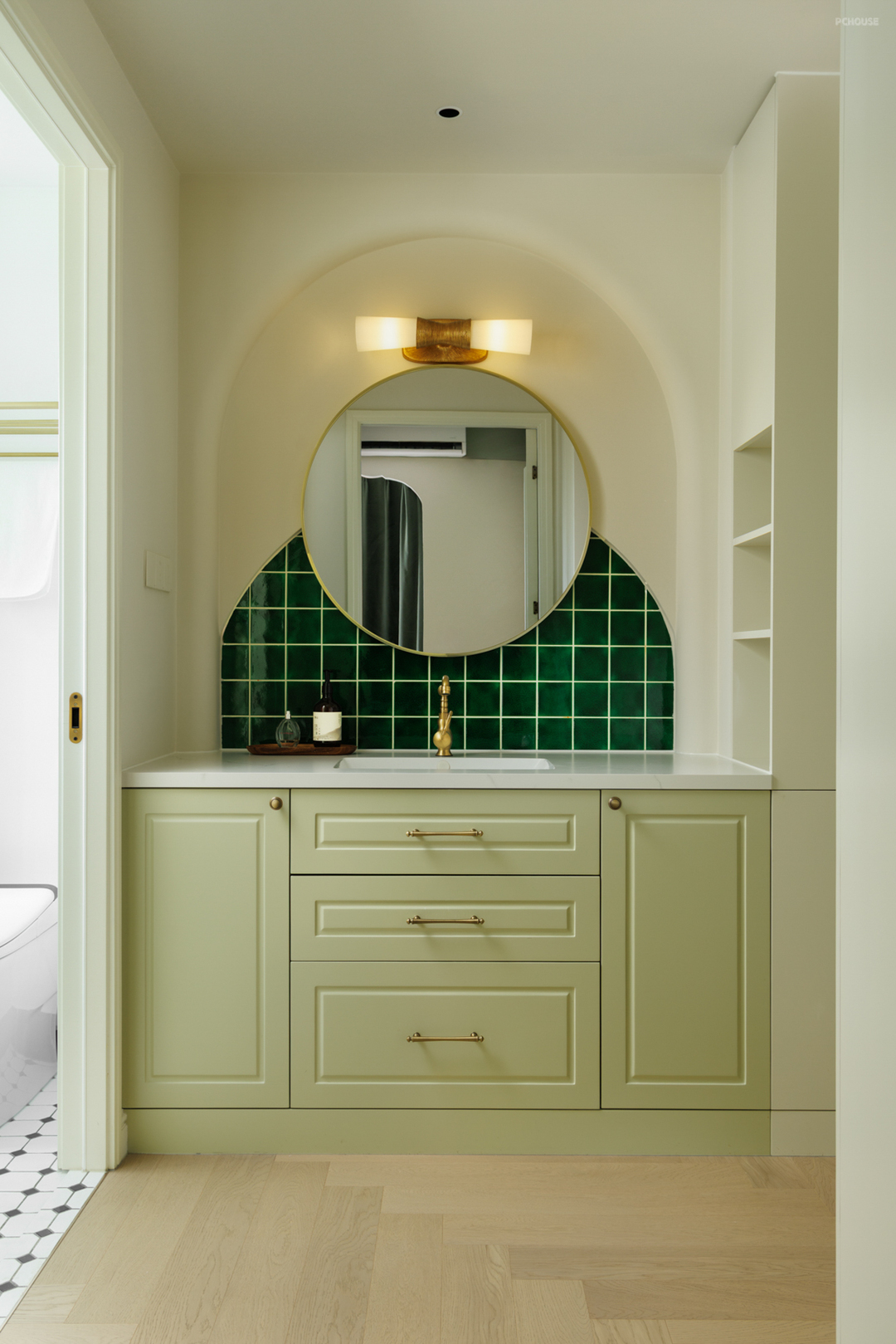 内凹的波浪板储物柜,有更柔和美好的珠光效果。饰面花样纹饰点到为止,留足呼吸感,在清爽的绿意中透出古典浪漫的情调。