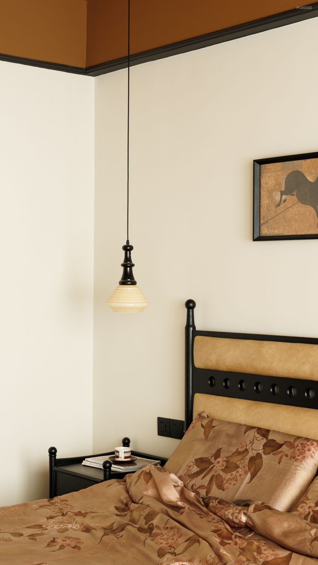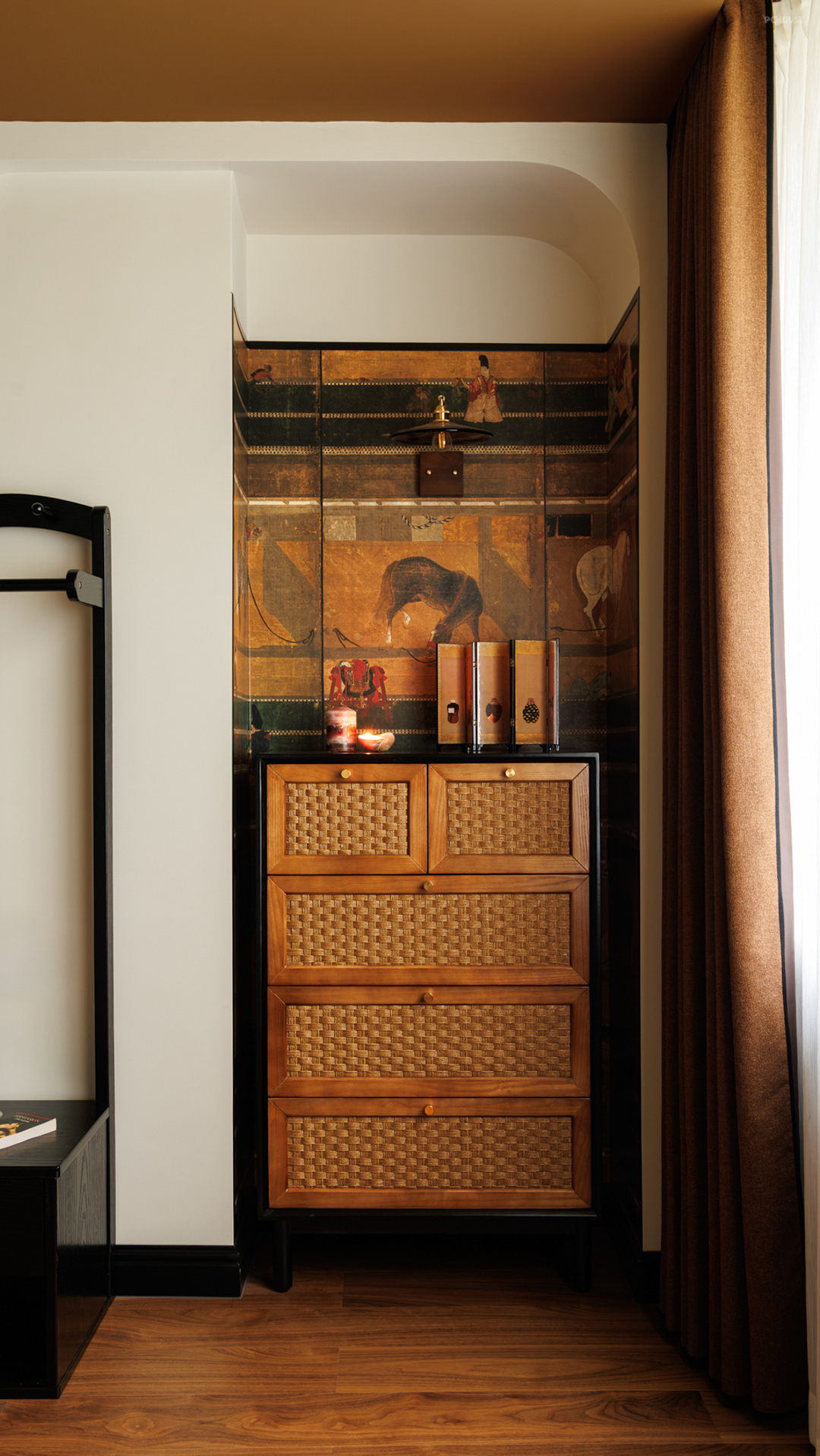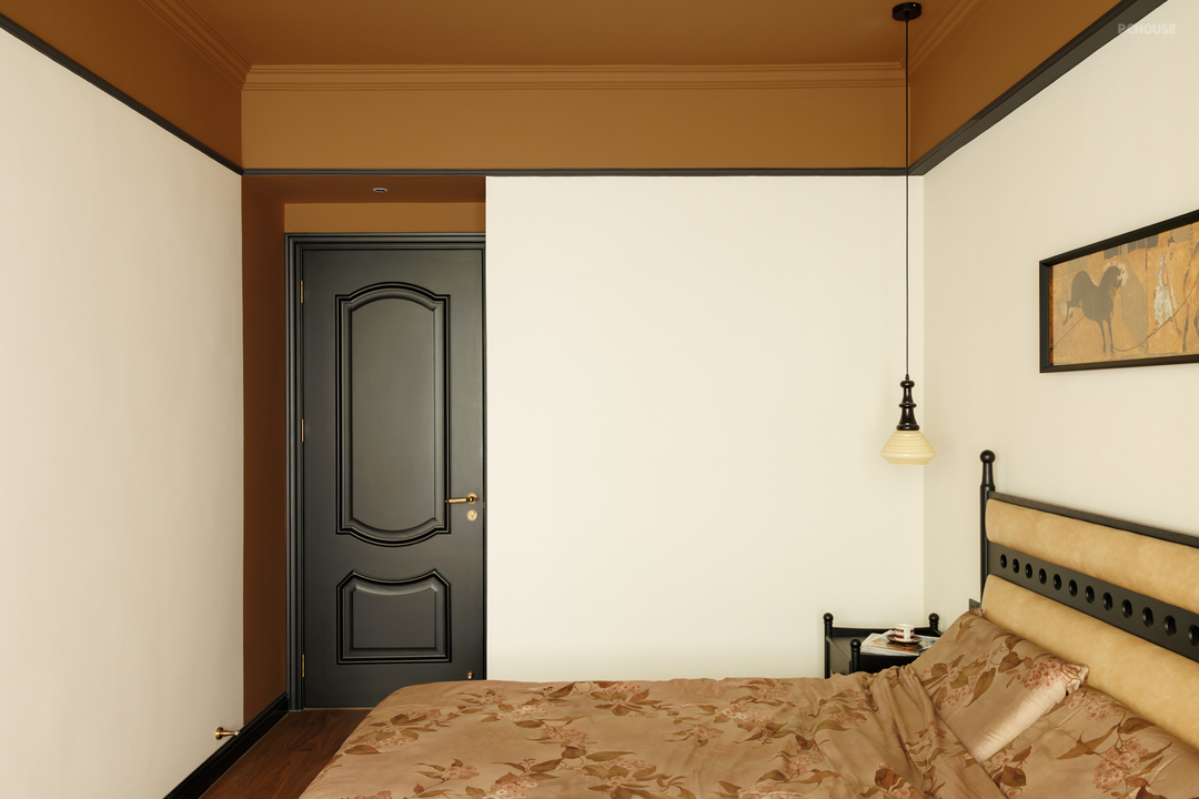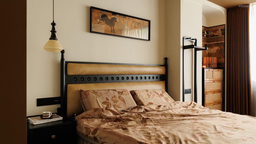 主卧有较强烈的法式中国风意味,适当压暗睡眠区的基调,氛围正好。在工作日的夜晚,窝在床上,就着一杯小酒一部电影一盏香氛蜡烛,一天的疲惫旋即消散。