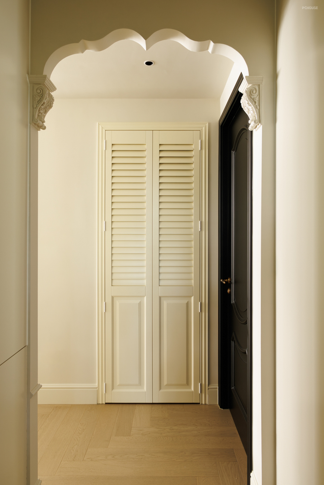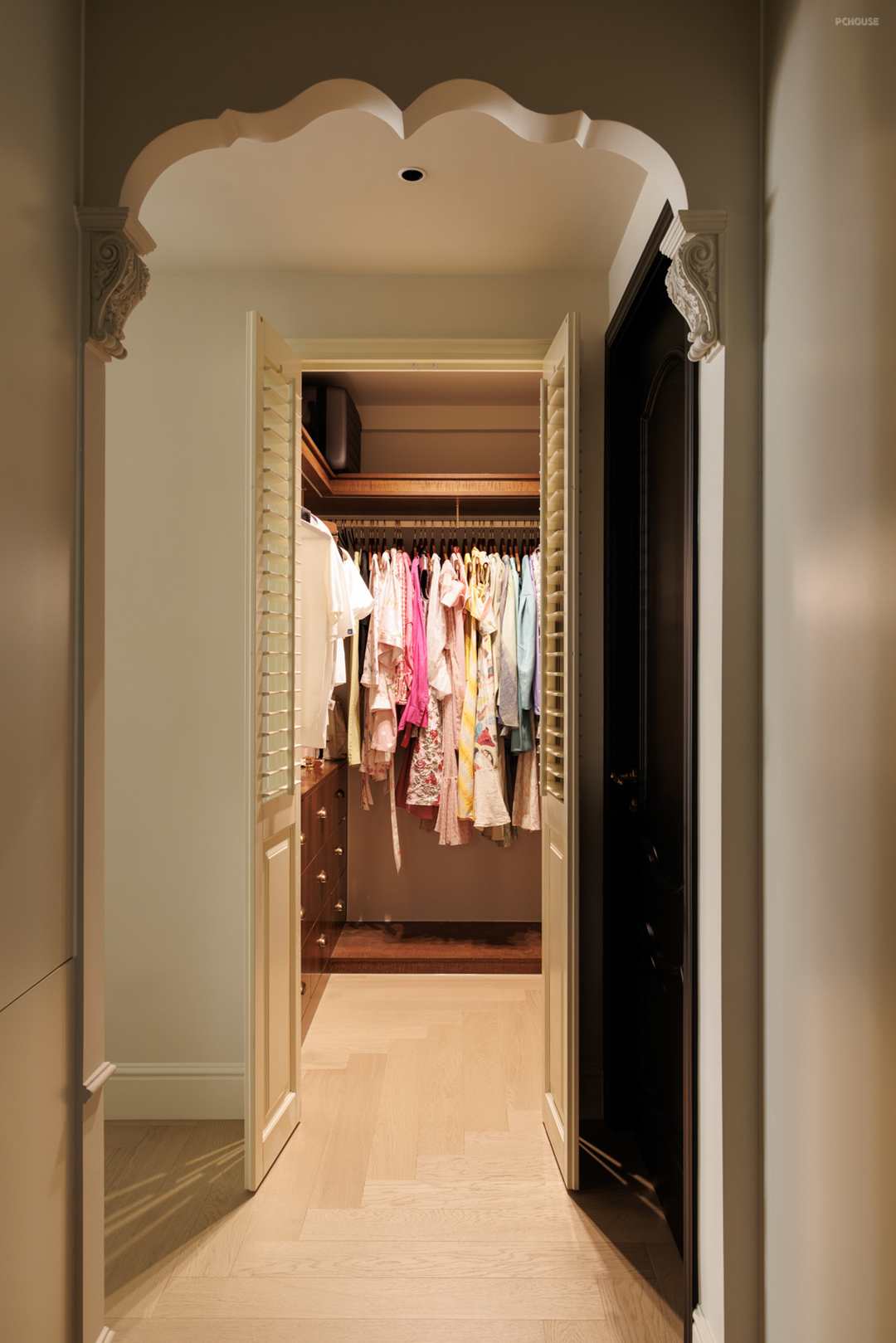 这个不到3㎡的衣帽间,并未遵循常规布局思路,它独立在主卧之外,成为一个更灵活的储物间。暖黄色的灯光洒落在特别挑选的胡桃木纹板和青古铜半月形拉手上,温馨中带着典雅。