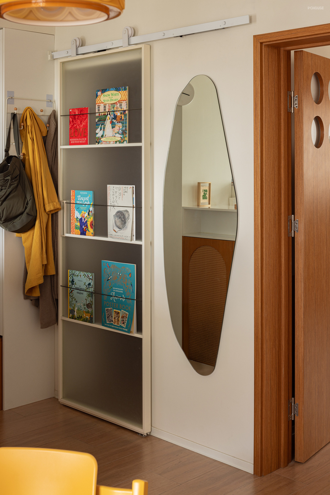 房间内侧的高度不足1.3米,我们把它设计成了孩子的衣帽柜。通过四扇移门围挡。这个空间像是属于孩子的小仓库,