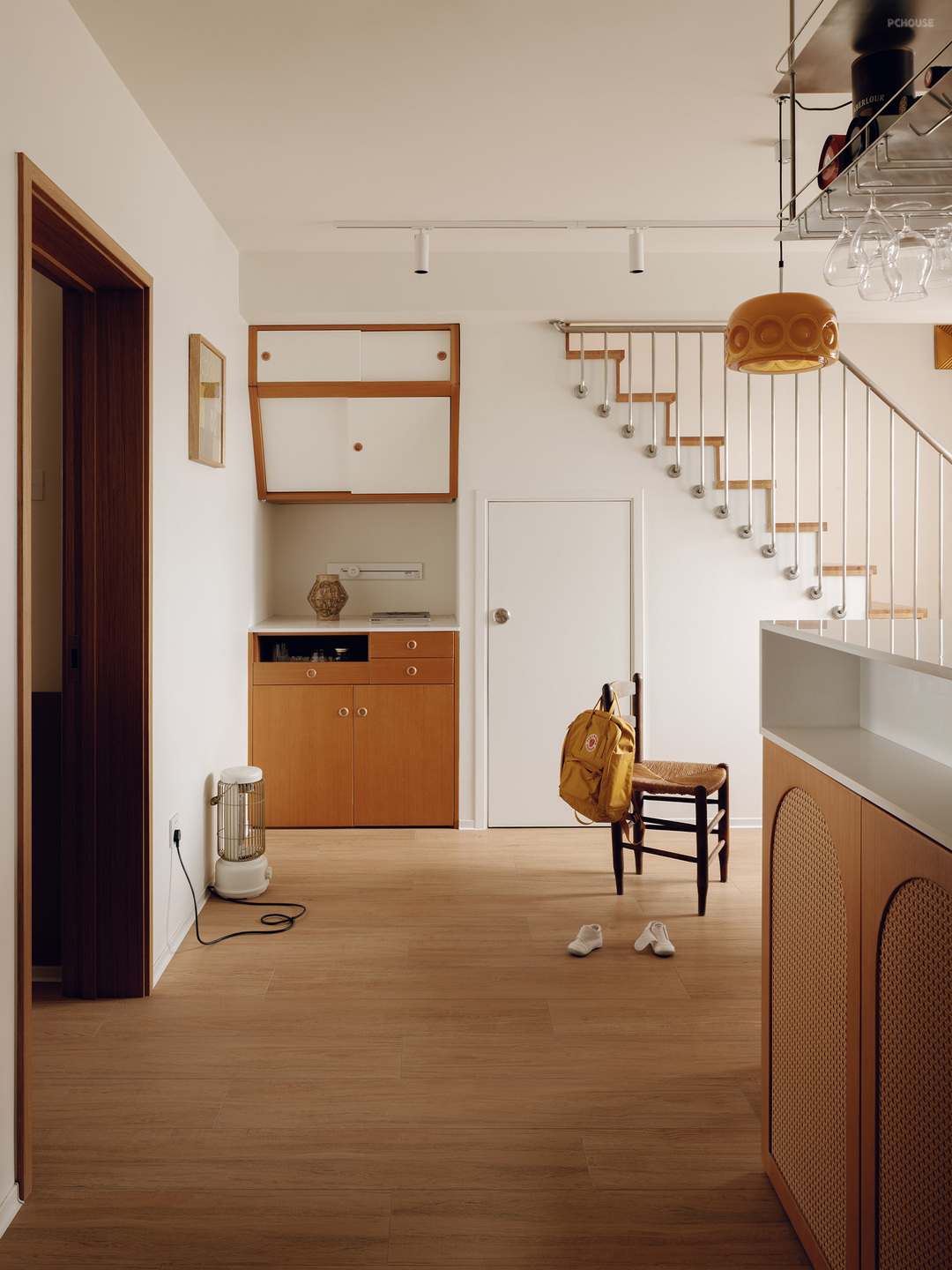 通向二层的楼梯。我们利用楼梯下方的空间打造了一个水吧台,楼梯