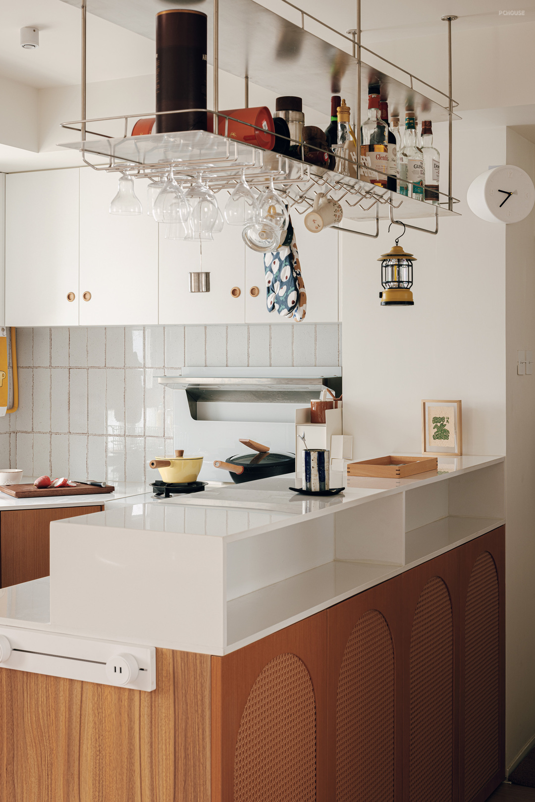 我将灶台右手边的台面定义为吧台。上方吊装杯架,下方则是二阶梯式的台面设计。白天这里是厨房,到了夜里,它也能变身家庭酒吧。