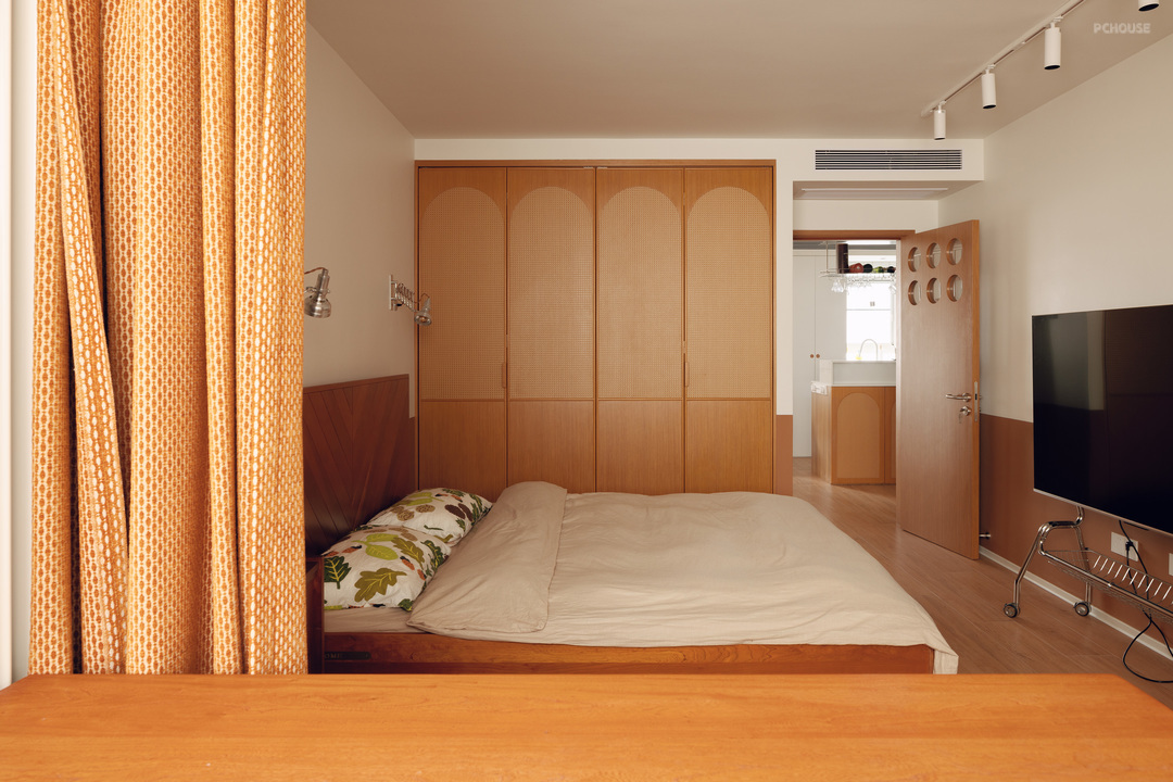 1F主卧延续木白色调,门与柜体选择的是柚木材质,质地出众。