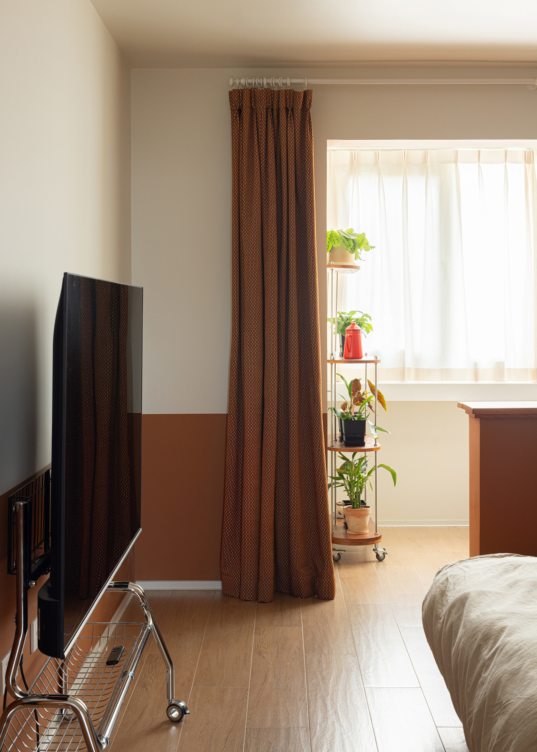 选择了比柚木色稍深的咖色做半墙涂装,视线上连接了阳台的墙垛与