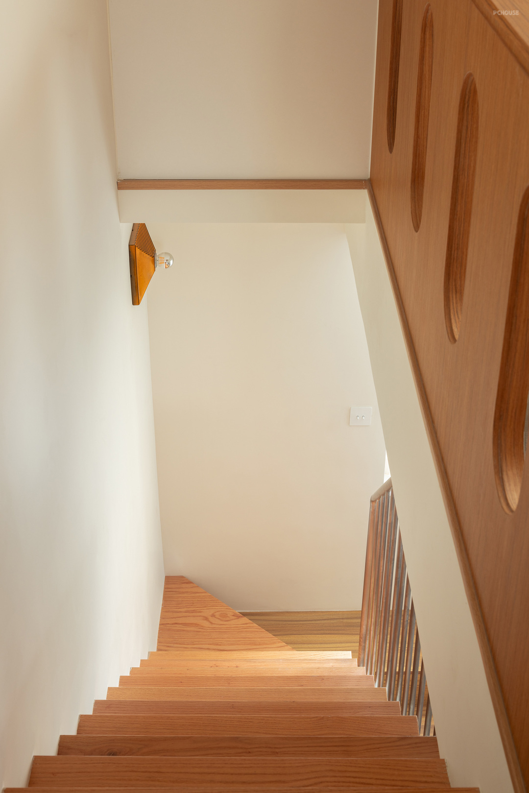 登上楼梯,转角处的壁灯来自Hustadt Leuchten1970年款式,几何