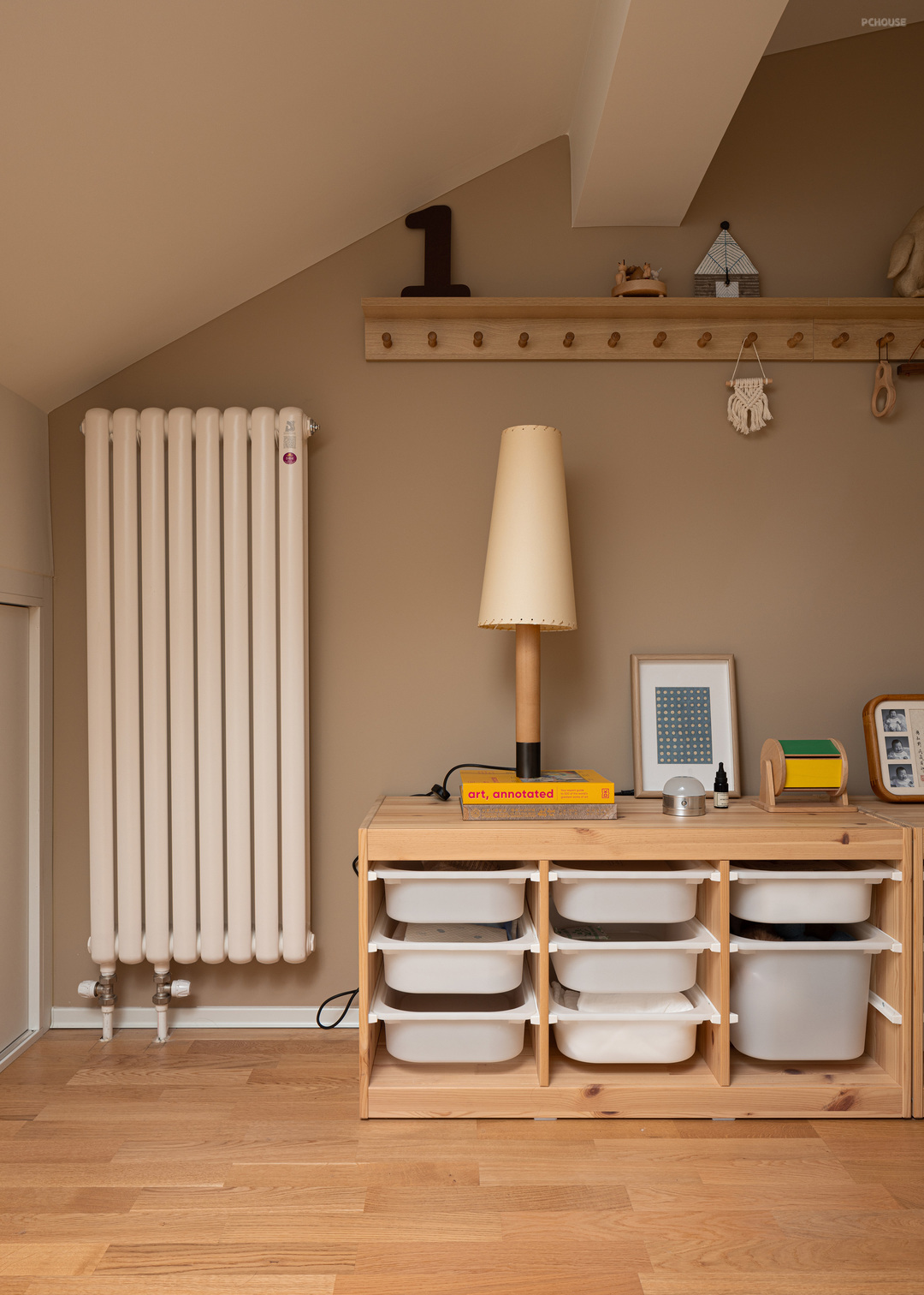 儿童房以蒙氏教育理念打造,创造出安全且丰富的空间。蒙氏箱体儿童床来自枝丫木品,儿童沙发来自Maniyani, 储物柜来自宜家。
