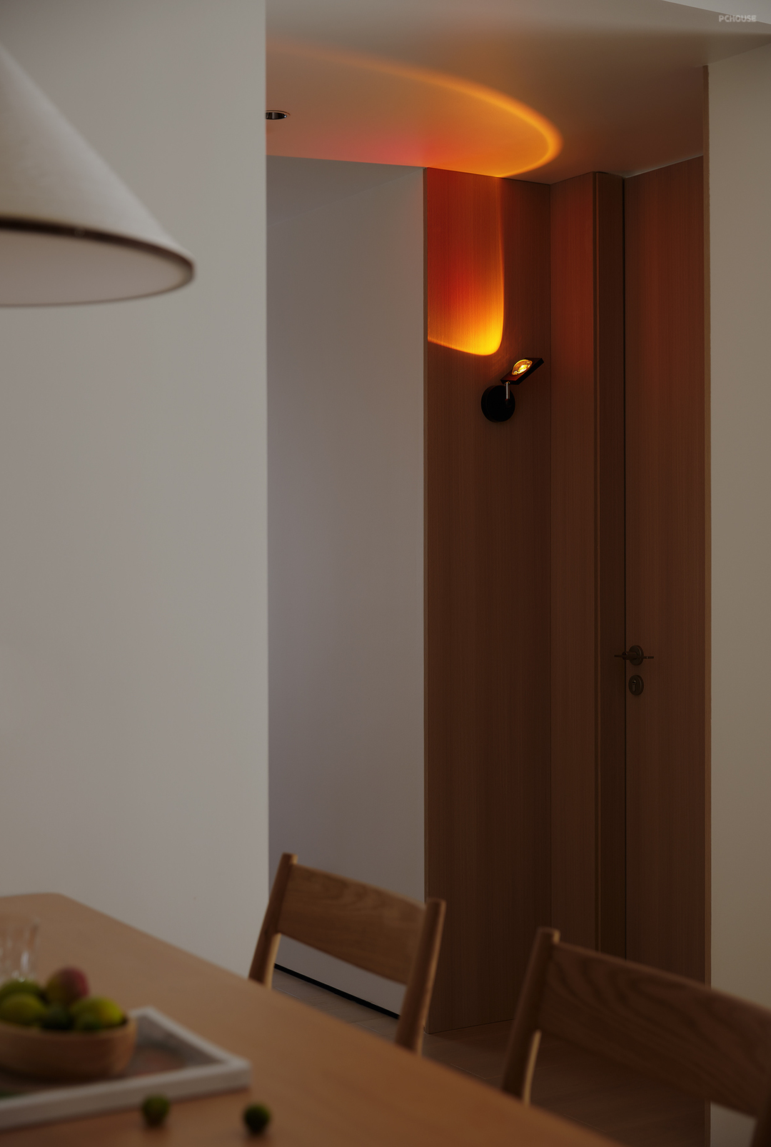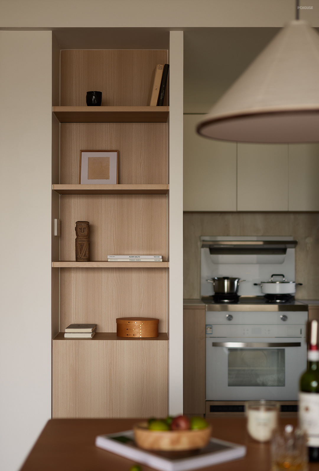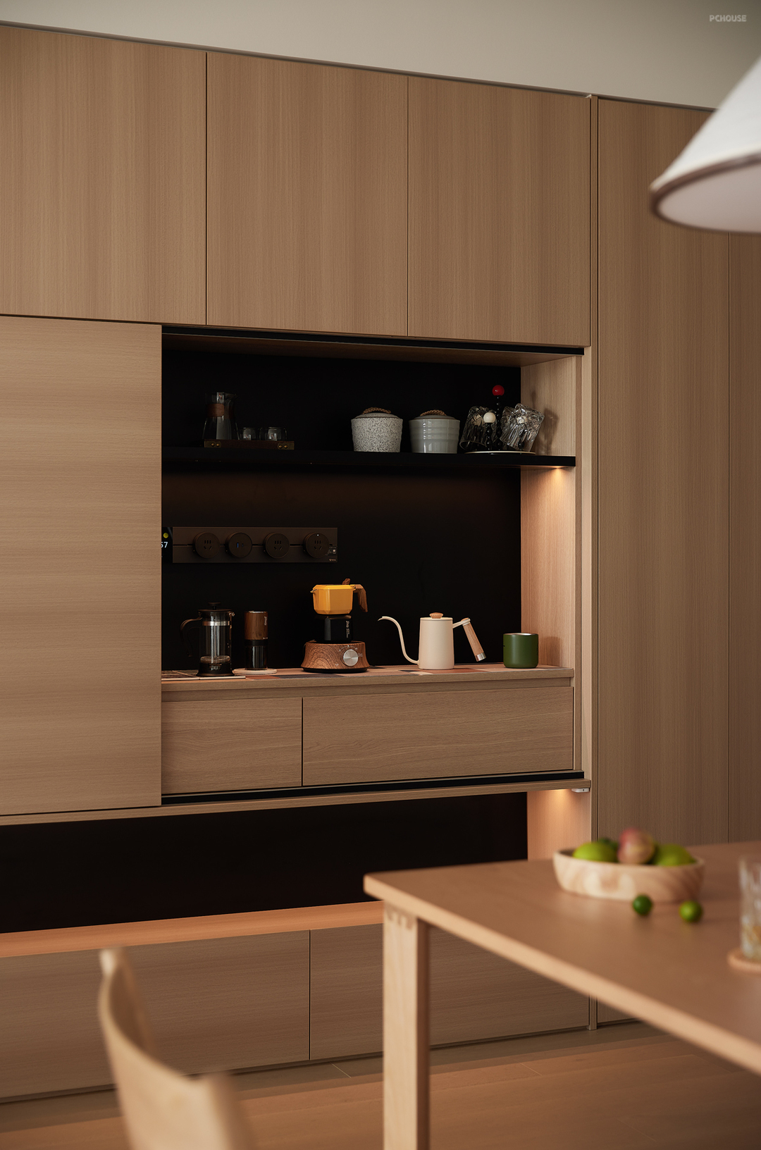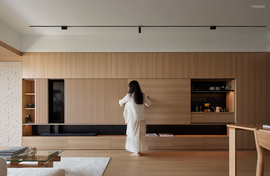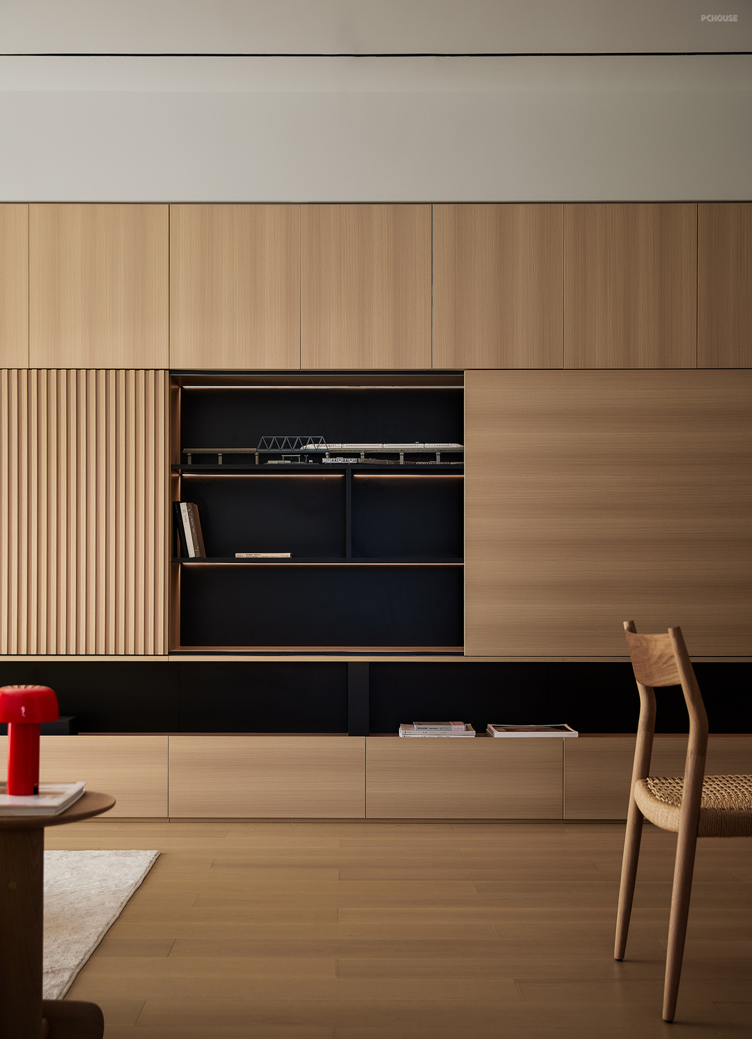 壁龛式的设计贯穿客餐厅,将电视、酒吧区与储物柜融为一体,移门的轨道设计赋予空间极高的灵活性,无论是空间划分还是功能切换,都得心应手。