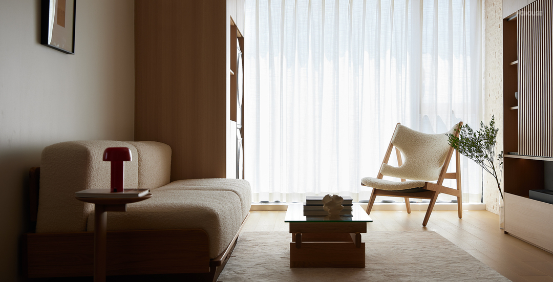 客厅与阳台无缝连接,阳光透过轻盈的窗帘洒入室内,温暖的光线宛如一层柔和的滤镜,赋予空间一种安静而深远的氛围。
