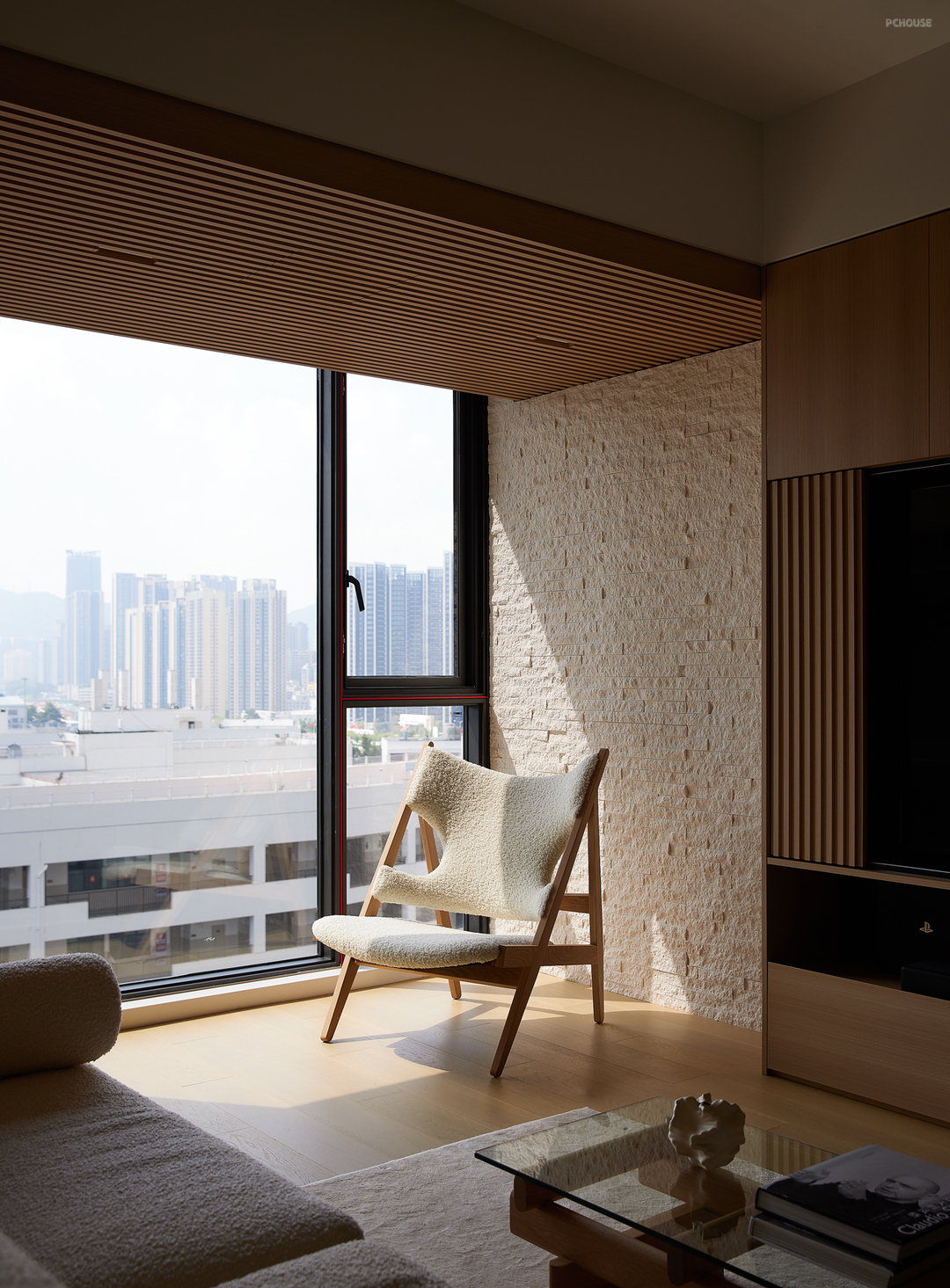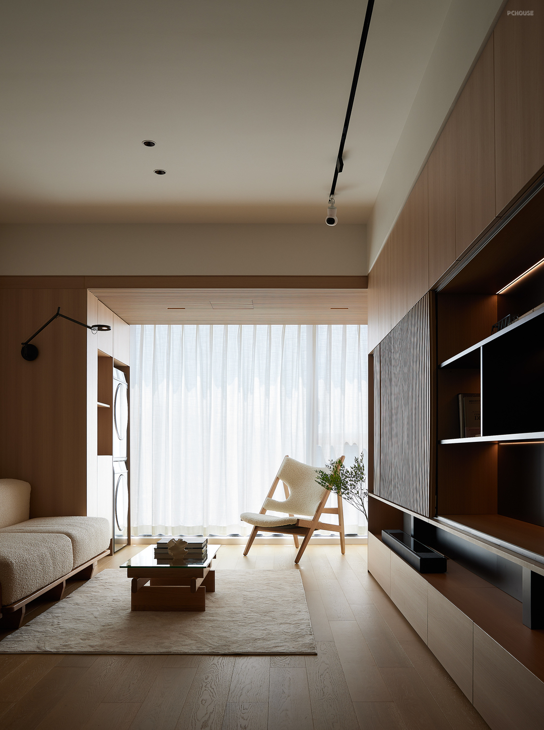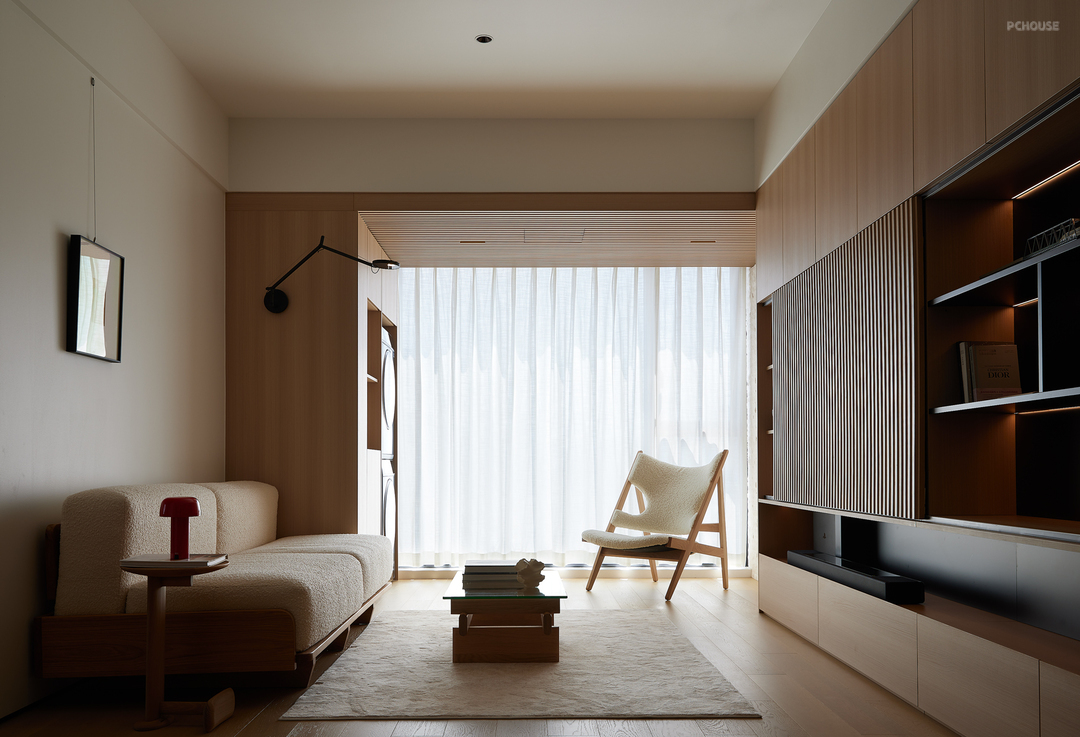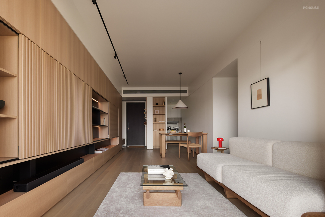 温润的木饰面从阳台的吊顶延伸至电视背景墙,创造出贯穿始终的流动视觉,增强了空间的统一性与连贯性。