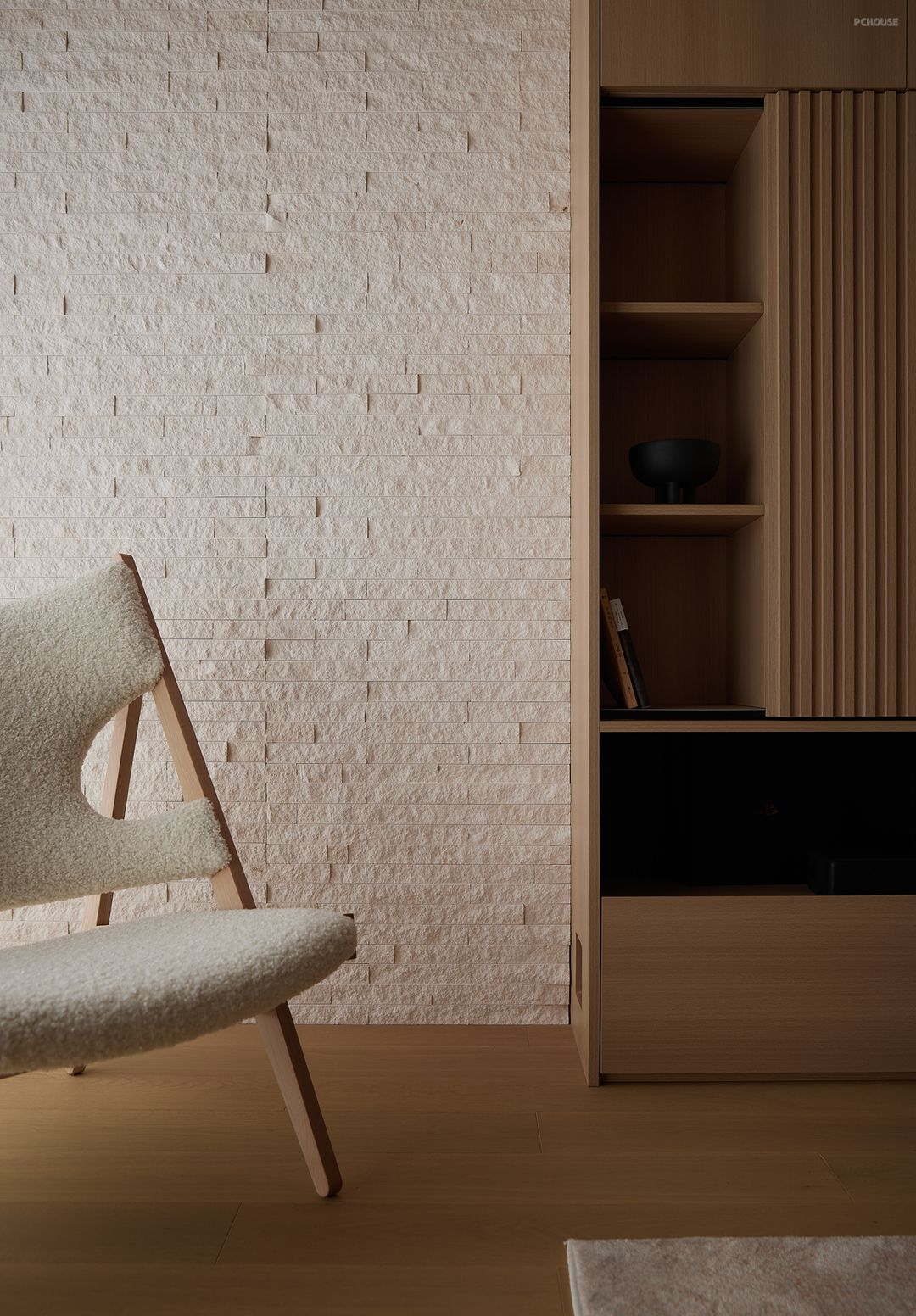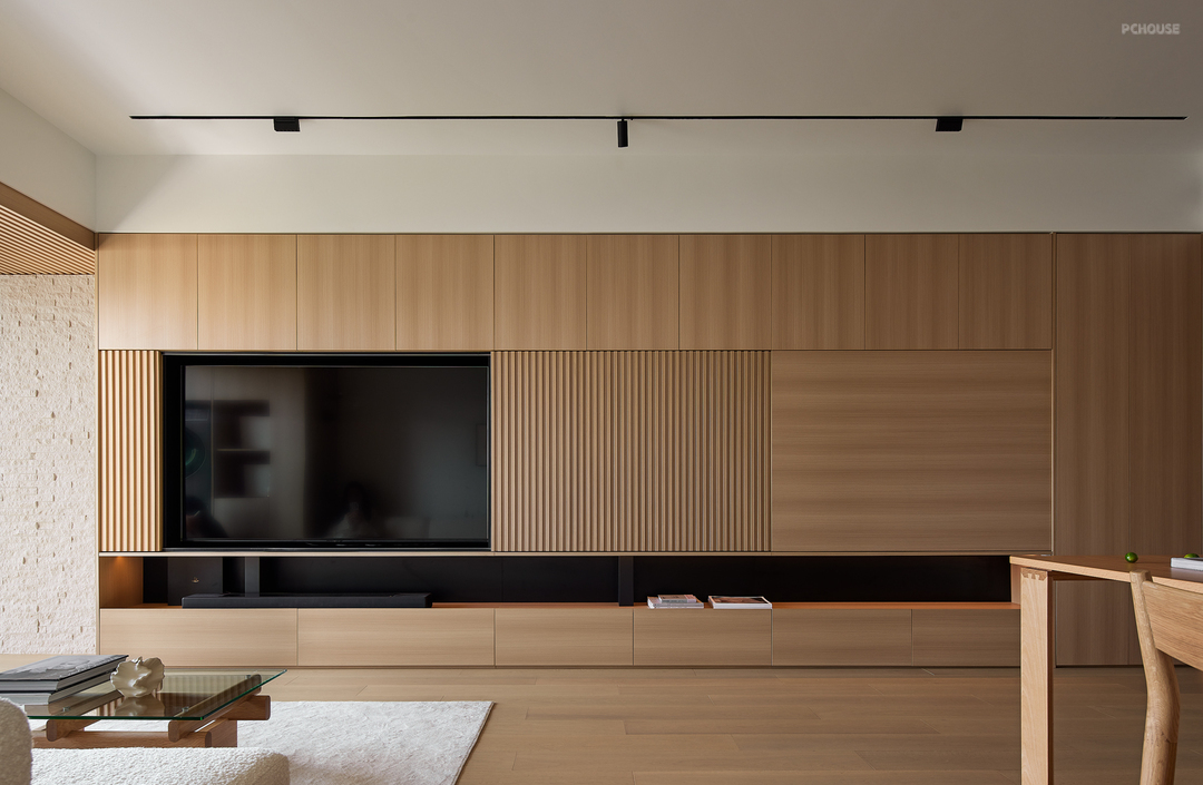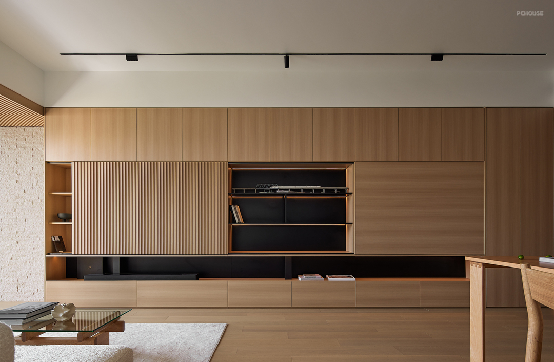 电视背景墙不仅是视觉的中心,也将材质、收纳与空间功能巧妙结合。栅格与肌理的天然装饰,使得设计更具自然气息,令空间显得既静谧又高雅。