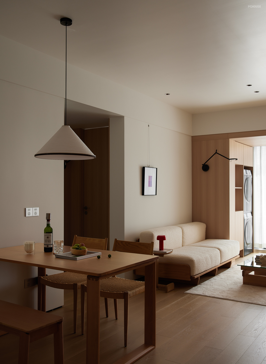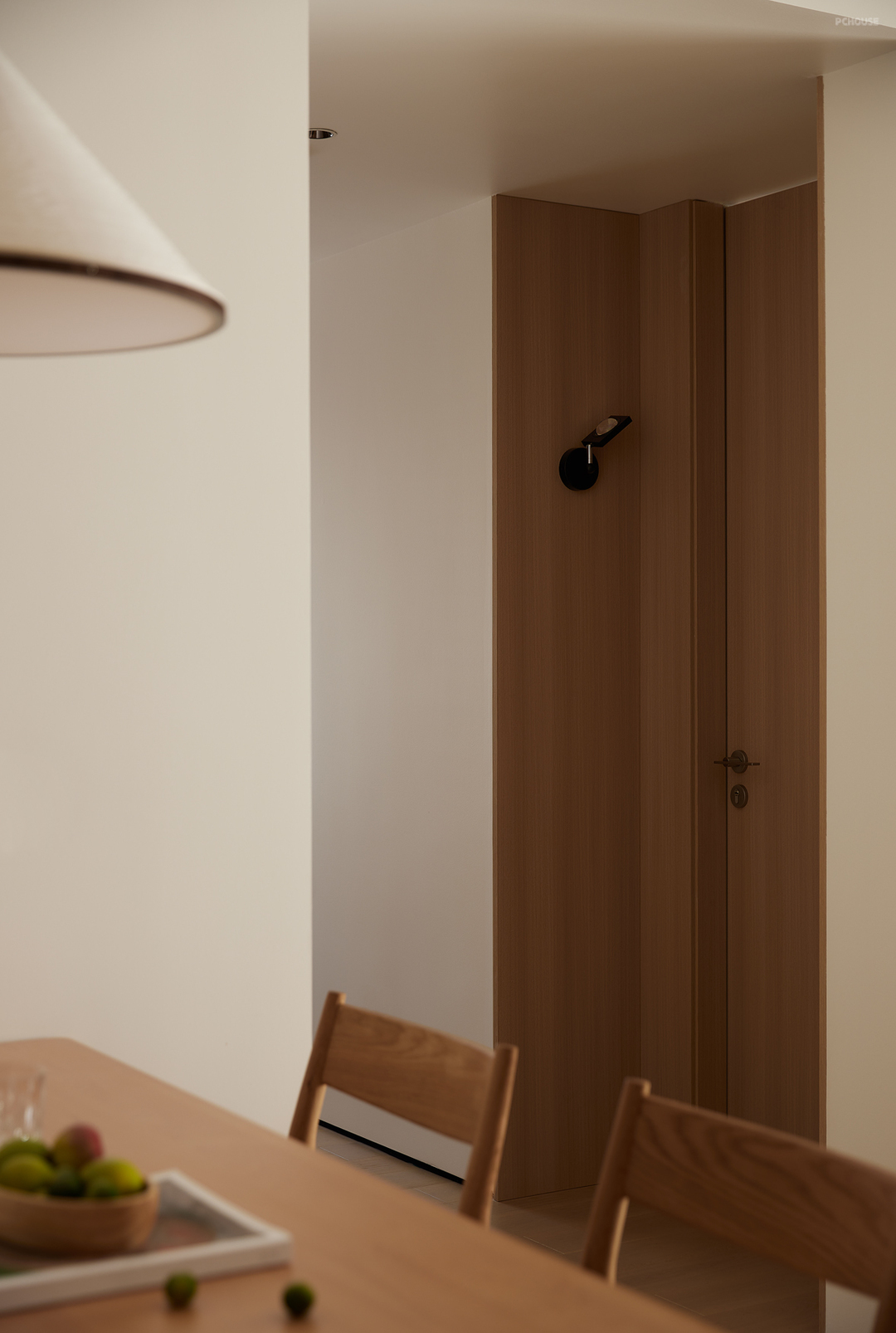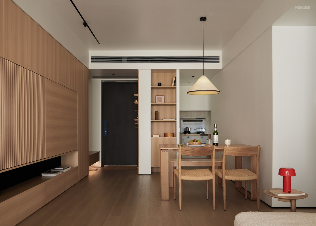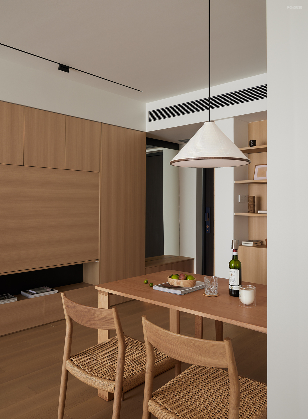 餐桌延续了客厅的木材元素,创造出空间间的内在联系与统一。