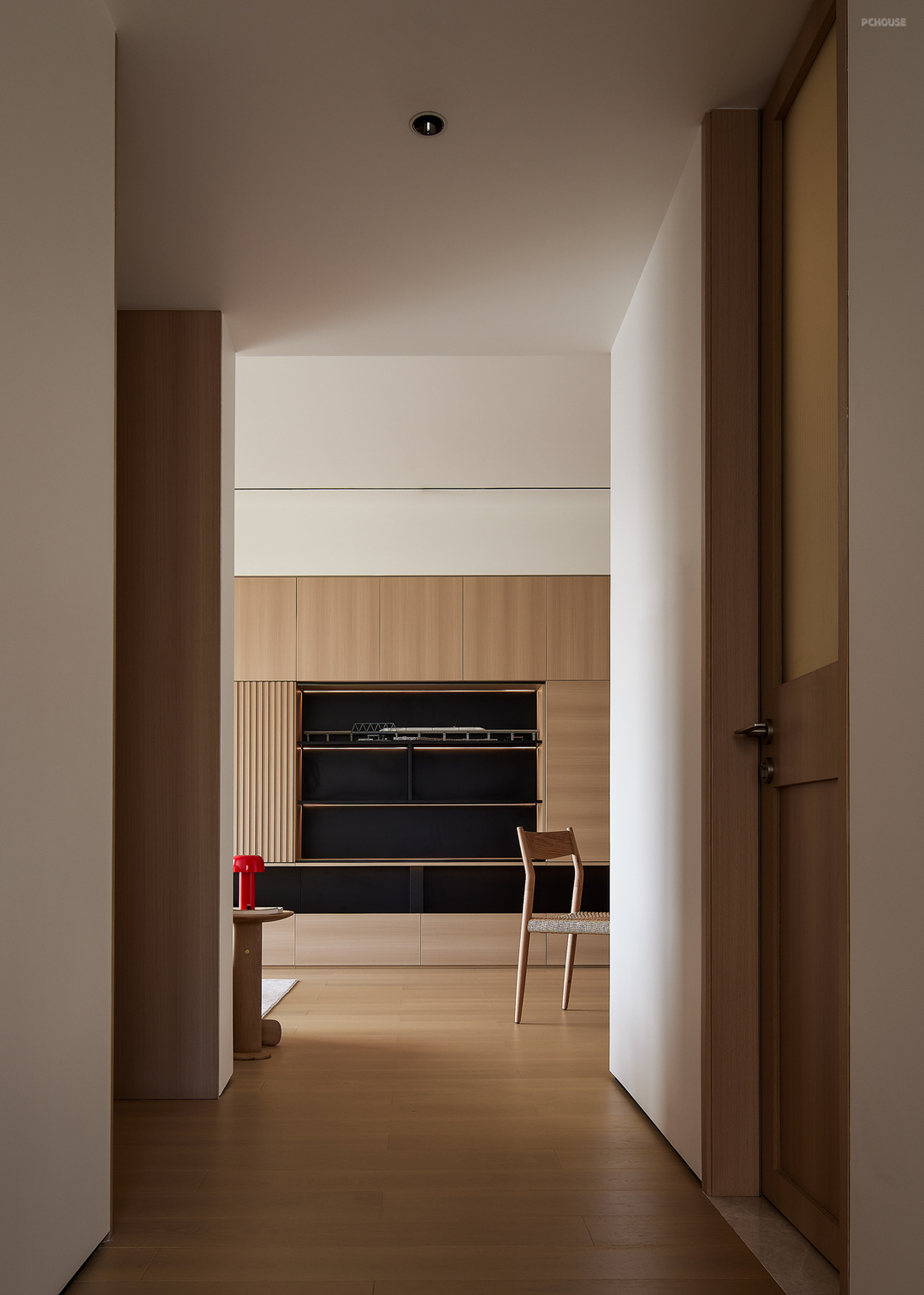每一处空间的利用都精准而考究。入口左侧的壁龛不仅丰富了收纳空间,也优化了视觉效果,让整个区域显得明净有序,展现出轻松流畅的生活节奏。