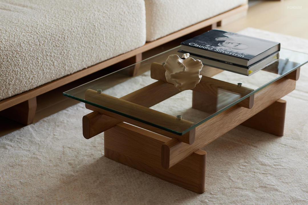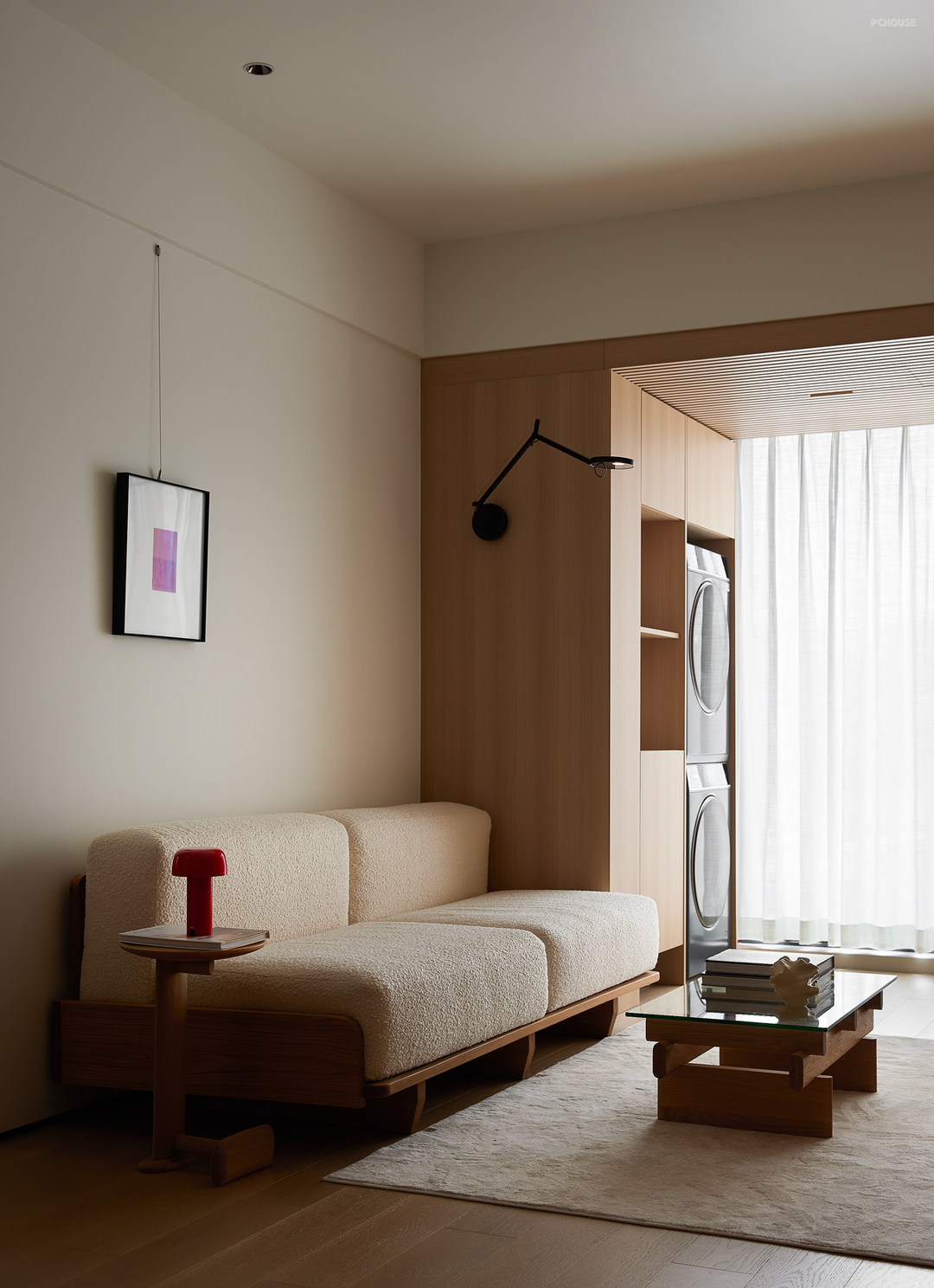 米白色沙发与天然木纹茶几的搭配,整个空间在柔和的色调中形成了和谐的呼应,细腻的材质与清新雅致的氛围彼此交融,营造出一个舒适温暖的居住场域。