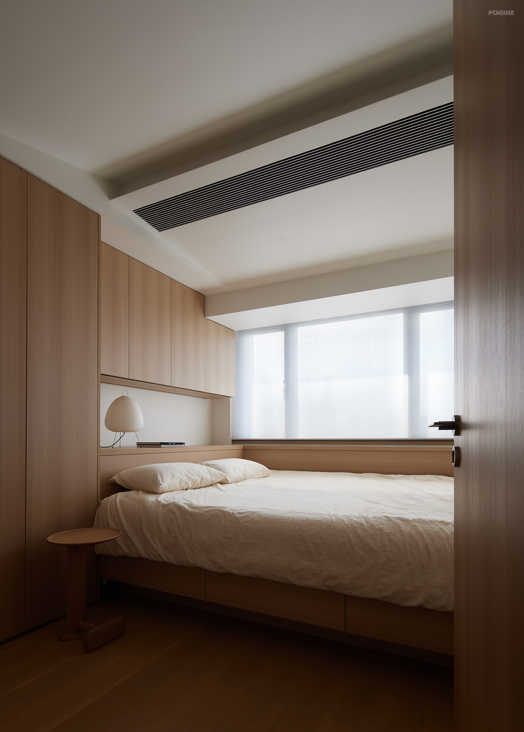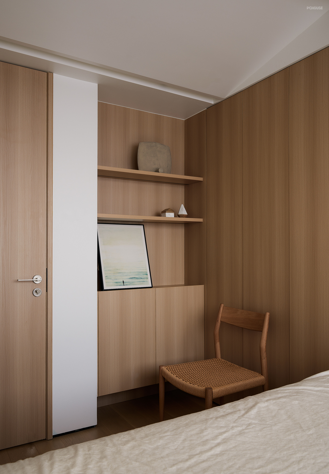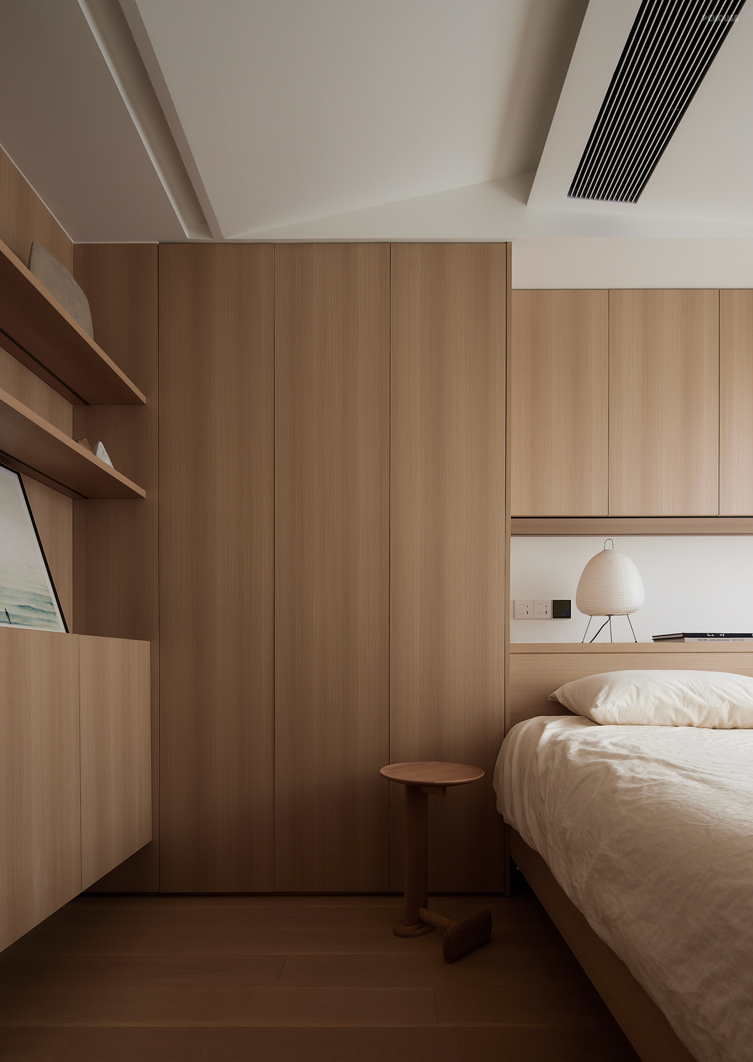 整个卧室被温润的木色包围,构建出坚实而沉稳的空间骨架,从入口到衣柜再到背景墙,每一寸木质的延展都渗透着温暖。