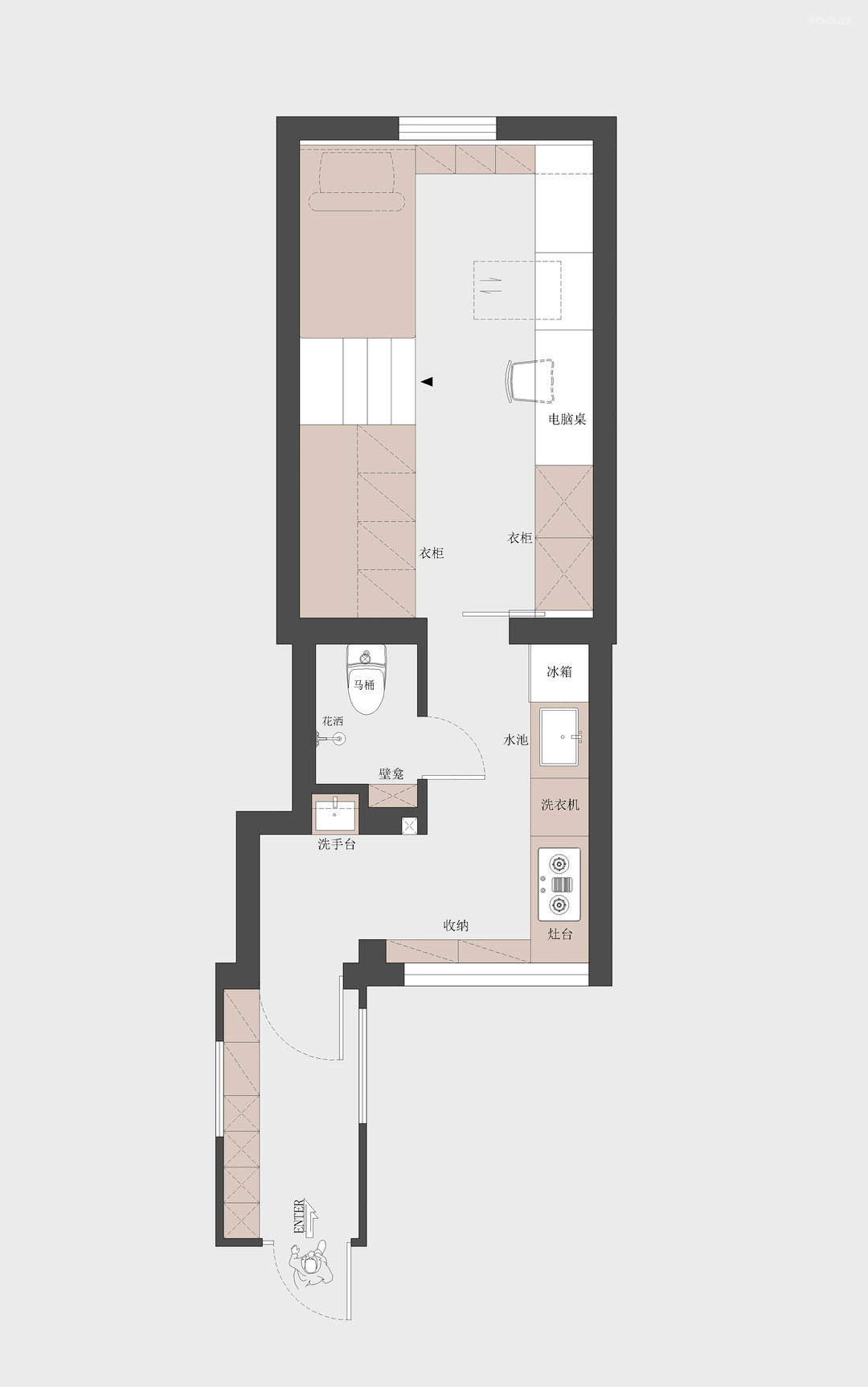4:卫生间利用靠近玄关区的原始门洞做洗手池,实现干湿分离,进门洗手