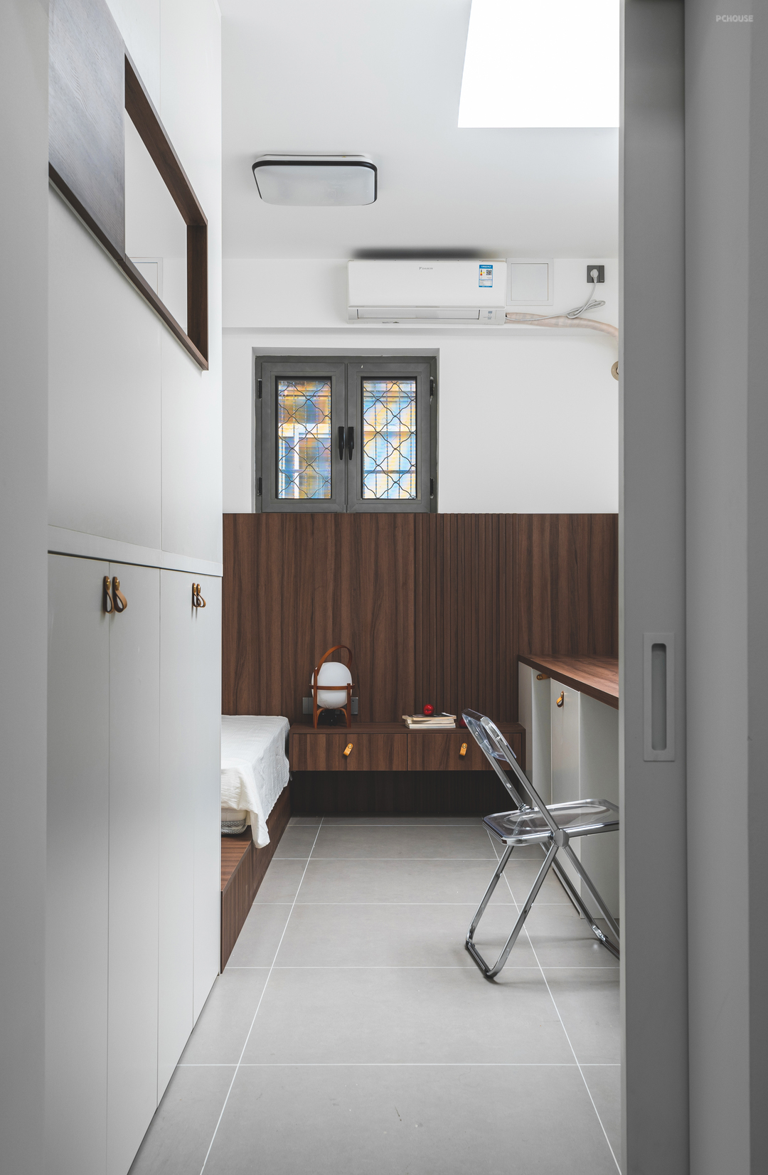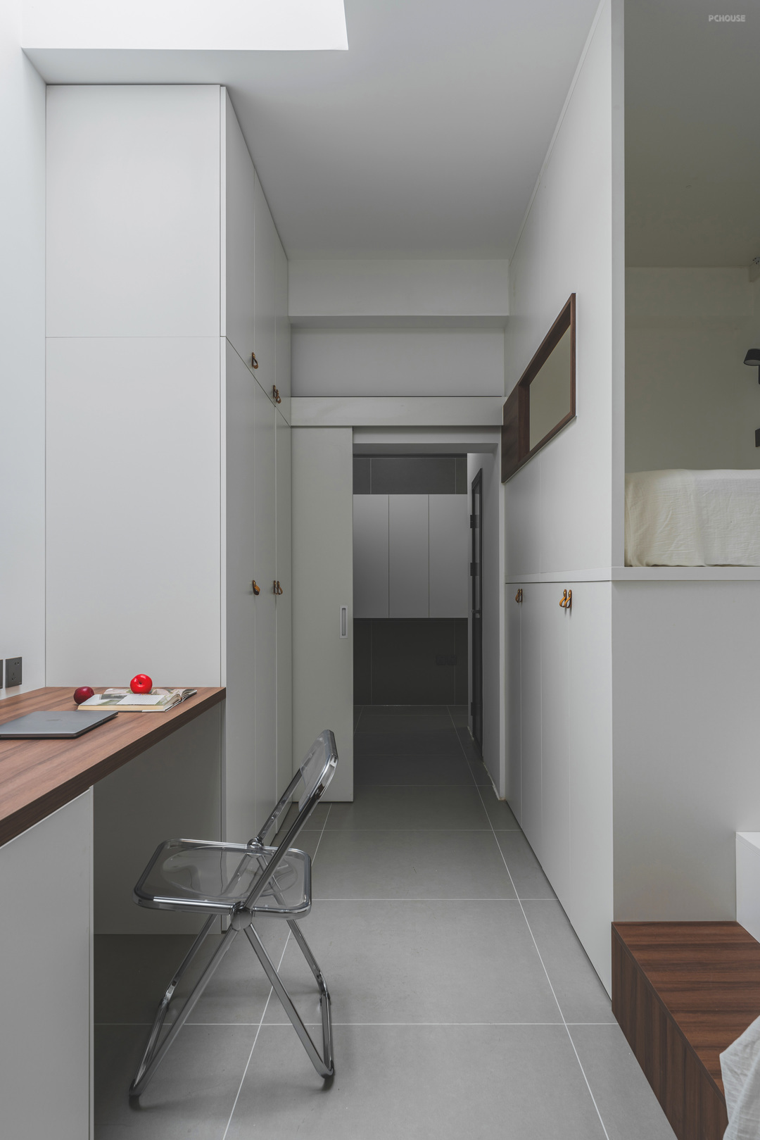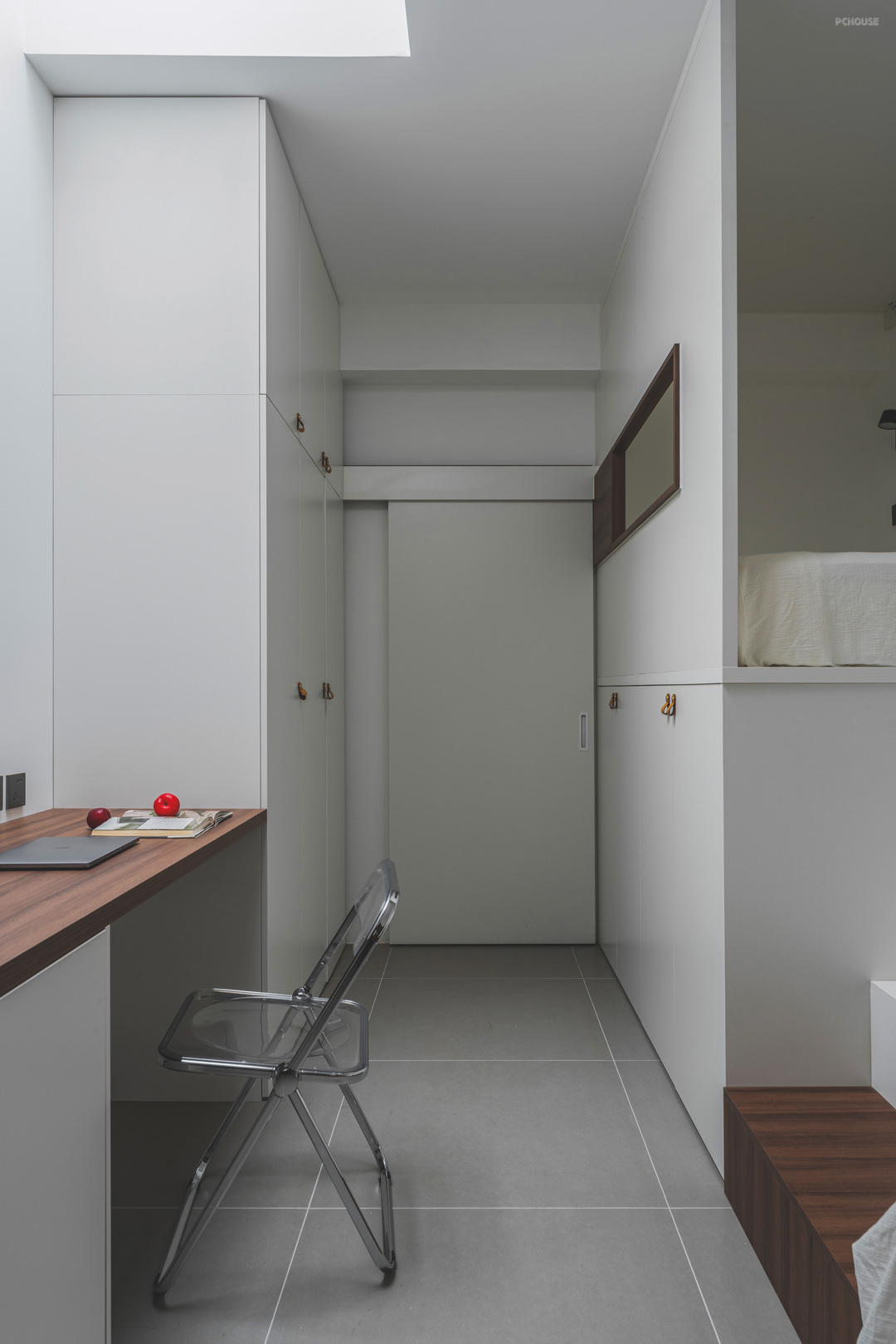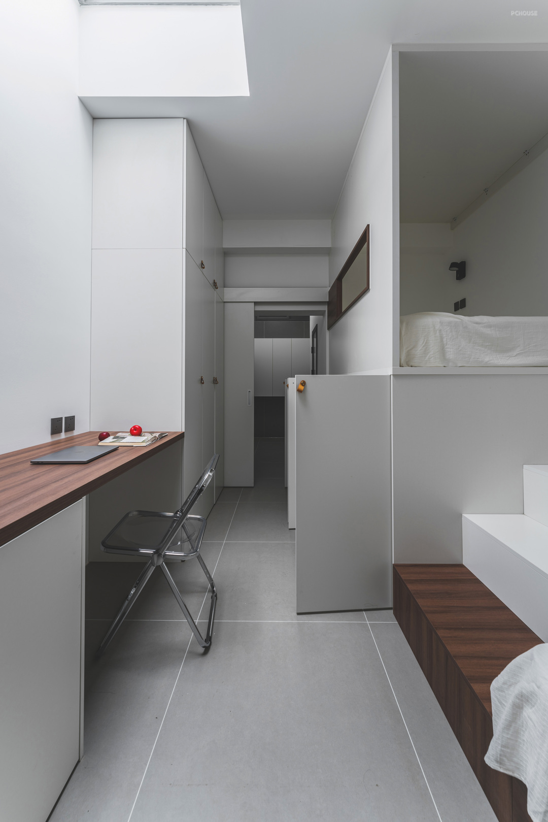 卧室区域沿着左侧做睡眠区,上床下储物,充分利用层高空间,右侧是业主偶尔办公的区域,在顶部开了天窗以后,大大的改善了睡眠区的采光,进门再也不用开灯了