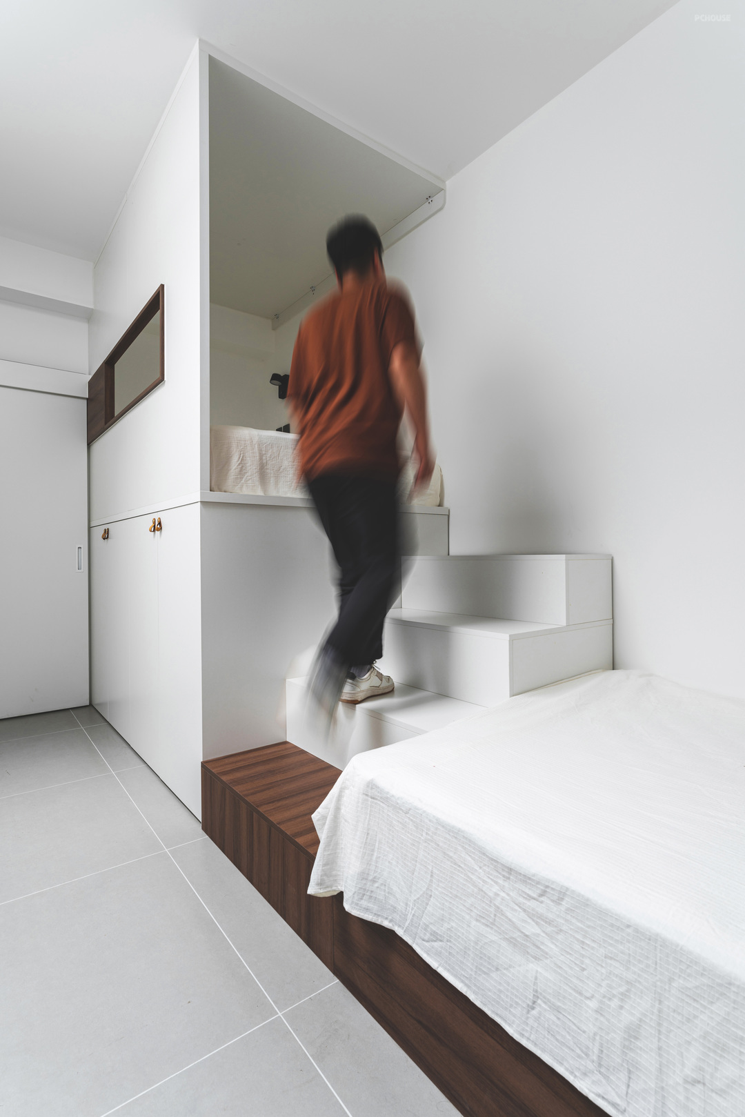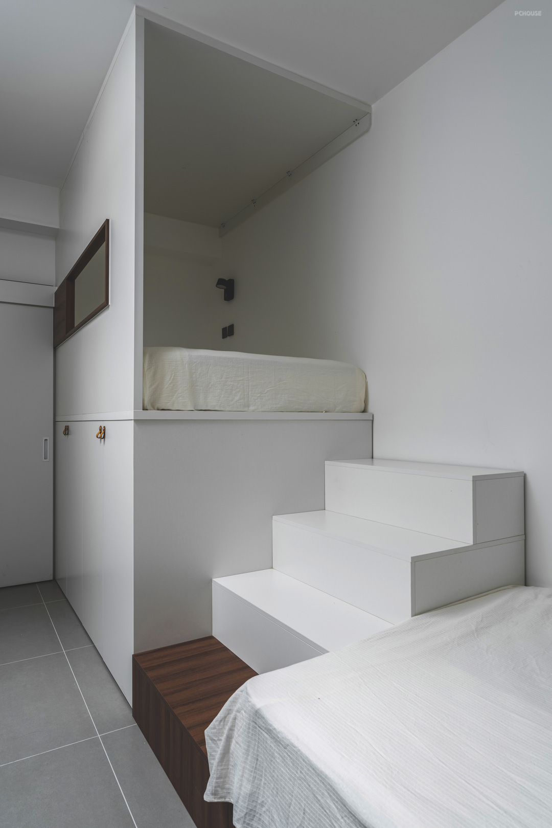 业主的睡眠区利用层高做了上床下储物,睡眠区包裹感极强,可以踩着楼梯平稳的上去,楼梯与地台做了差色,突出体块感